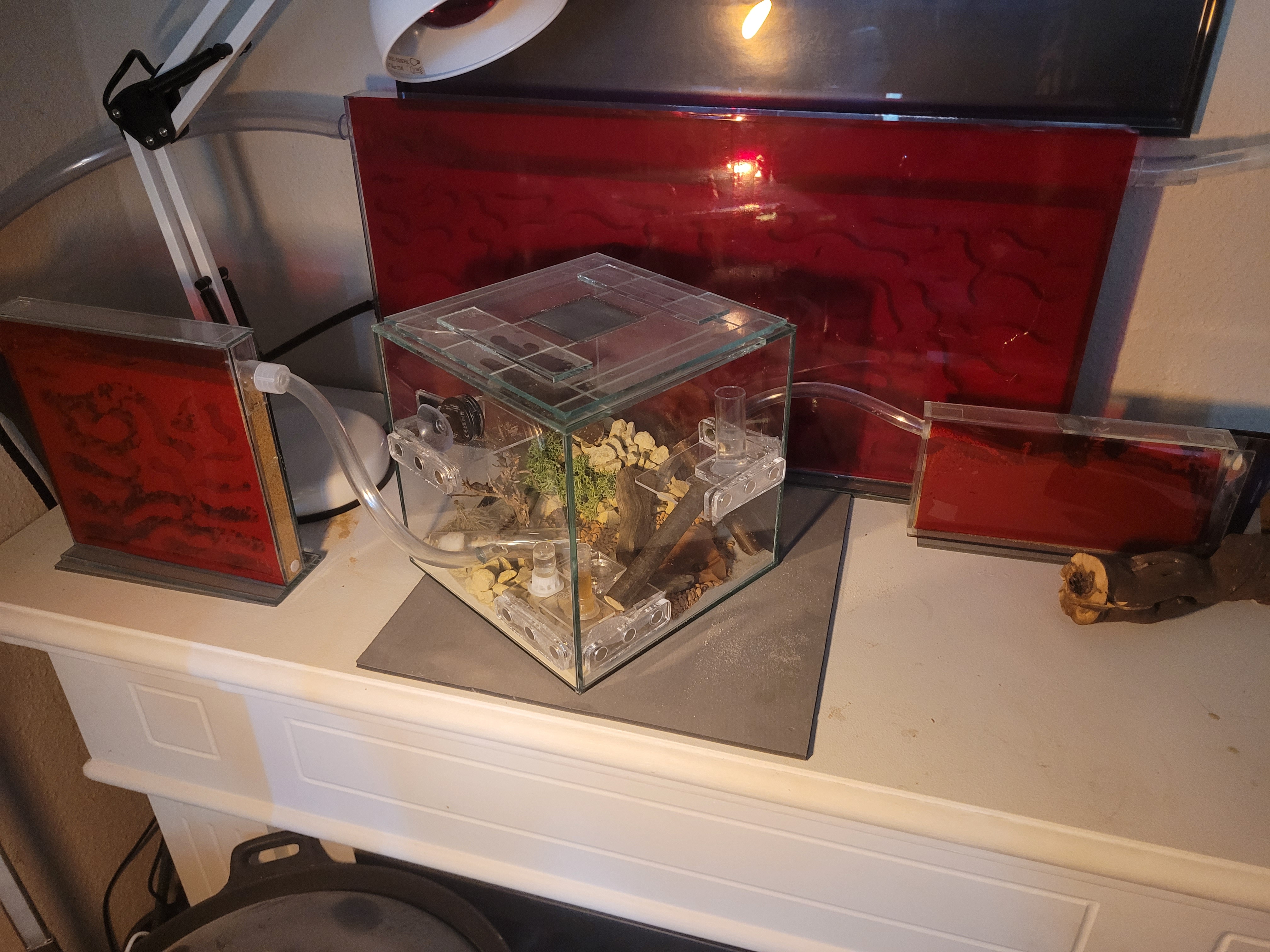 Hier ein Beispiel von Messor barbarus (Heizmatte links unten) und C. fellah (nur die linke Heizmatte von den 3en ist an):