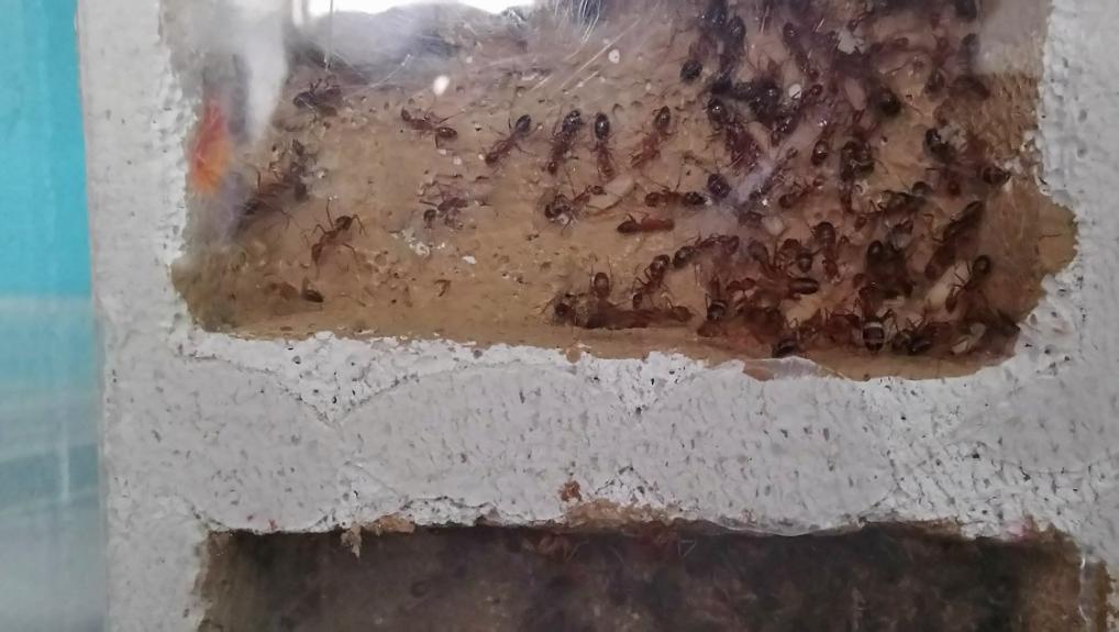 Gaster haben sich prall gefüllt und dadurch das die kleinen auch gelblich gefärbt sind, konnte man es sehr gut sehen. Viele der kleinen Minor- und Mediaarbeiterinnen rannten wie verrückt auf dem Glas des Formicariums. Fast hätte ich den Ausbruchsschutz vergessen. Auch andere Arbeiterinnen erkundeten das neue Areal. Sie freuten sich regelrecht auf den selbstgebauten Berg, sie krabbelten zwischen, auf und unter den Steinen. Nach einer guten halben Stunde kam ich wieder zu den Ameisen und sah, das mal wieder das Zuckerwasser leer war. Also wollte ich es nachfüllen und knirpste das Licht meiner Schreibtischlampe an. Und die gerade eben noch super aktiven Ameisen erstarten. Ich hatte erstmal einen Schock bekommen, die Ameisen haben sich wirklich nicht vom Fleck gerührt. Also habe ich das Licht wieder schnell ausgemacht und siehe da, die Ameisen rannten wieder mit Hochgeschwindigkeit durch die Arena. Also habe ich mal wieder das Licht angemacht, und wer hätte es gedacht, sie frierten wieder ein. Dies machte ich ein paar Mal und es war wirklich echt lustig mit anzusehen. Aber für heute lasse ich die kleinen wieder in Ruhe.