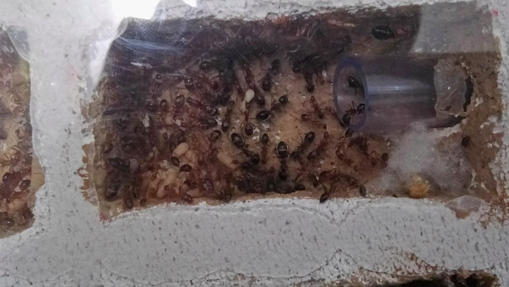 Major so ca. 16mm groß ist. Um einiges größer als eine Camponotus nicobarensis Arbeiterin. Da sie in einem Nest ankamen, musste ich erst gar keins bauen. Also holte ich ein 30x20x20cm Aquarium (12l) aus dem Keller und begann mit der Einrichtung der Arena. Zu aller erst setzte ich das Nest in die Arena. Das Nest hatte einen Schlauchausgang, etwa 30cm lang. Ich wollte diesen gerne behalten und dachte nach wie ich den ihn schön verstecken könnte. Da kam mir eine Idee in den Kopf, die eigentlich auch recht schön aussieht! Ich nehme einfach ein paar Steine und baue sozusagen einen kleinen Berg. Unten könnt ihr dann die Bilder sehen! Ich wollte dann gar nicht lange warten und öffnete gleich den Schlauch. Die Ameisen stürmten regelrecht raus und nach kurzer Zeit waren in der kleinen Arena schon 30-40 Arbeiterinnen. Diese haben sofort die Tropfen Zuckerwasser entdeckt und ehe ich wieder in das Becken gucken konnte, war alles weggeschlürft! Nun kamen auch mehrere Majore angerannt und ich musste schnell wieder das Zuckerwasser nachfüllen.