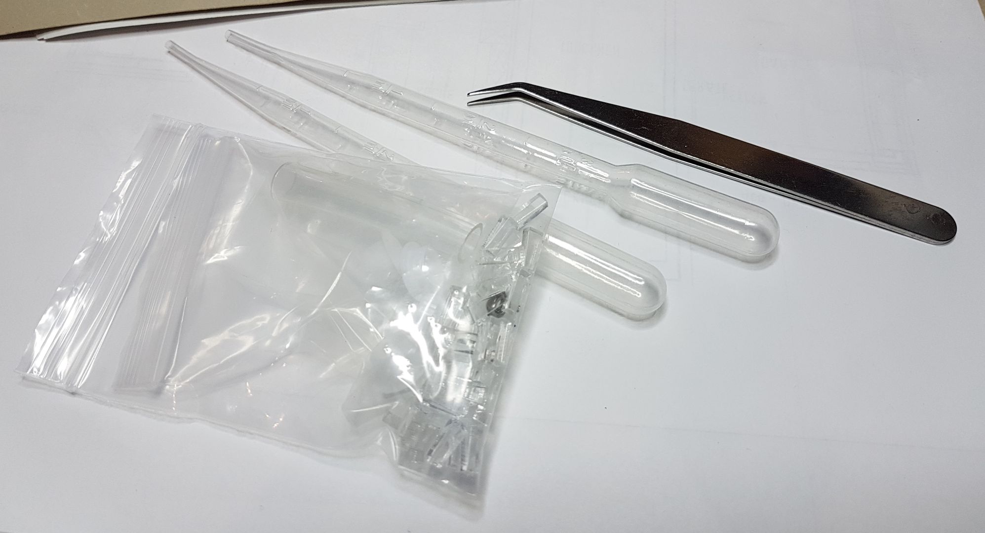 Nest, Bauteile Arena (alle mit schutzfolie überzogen), Verbundungsmaterial, massig Keile, 4 Reagenzgläser, 2 Pipetten, Pinzette, Schlauch, Schwammverschluss für Reagenzglas, Schwamm für Tränke (ich hoffe ich habe nichts vergessen)