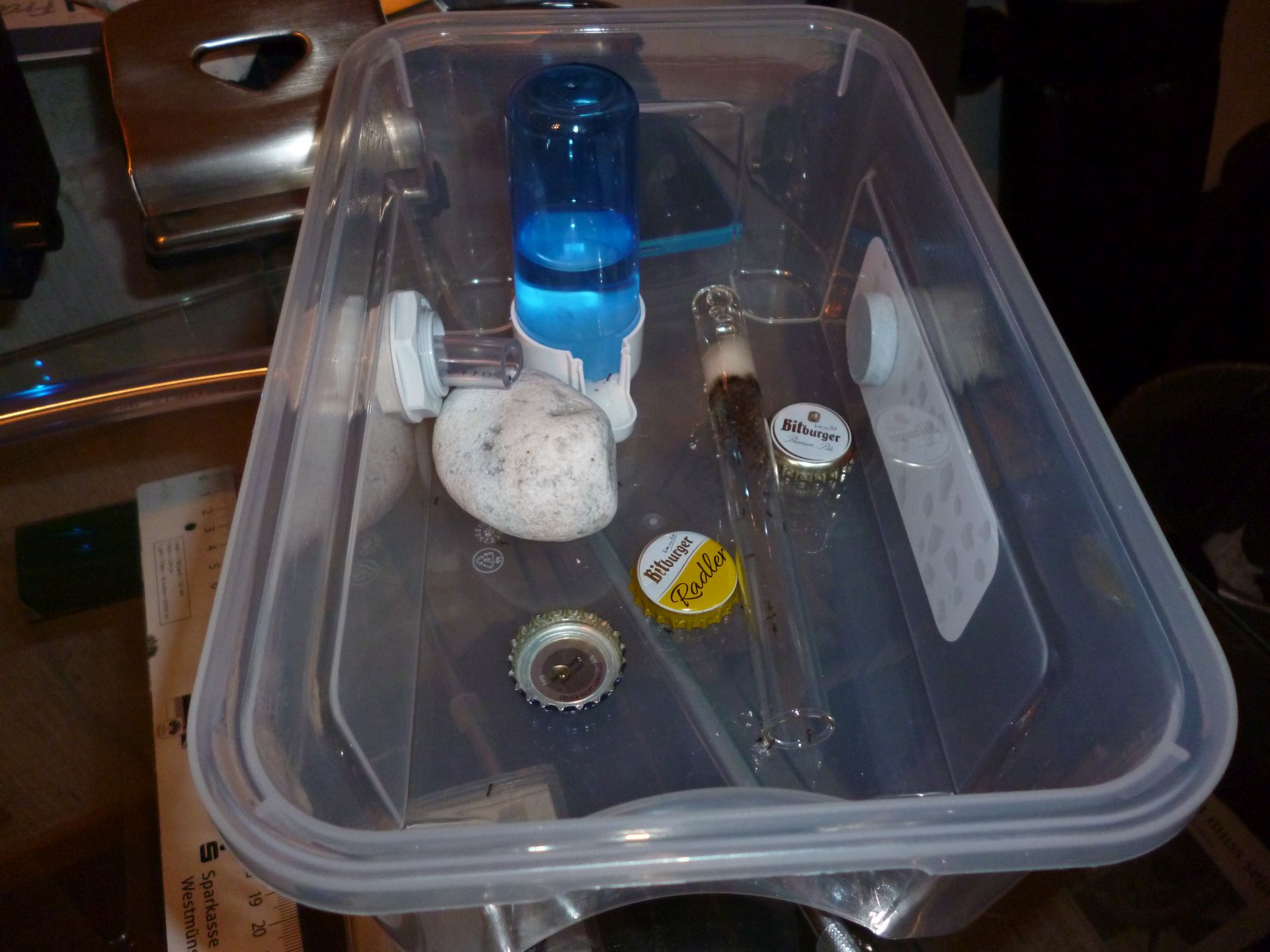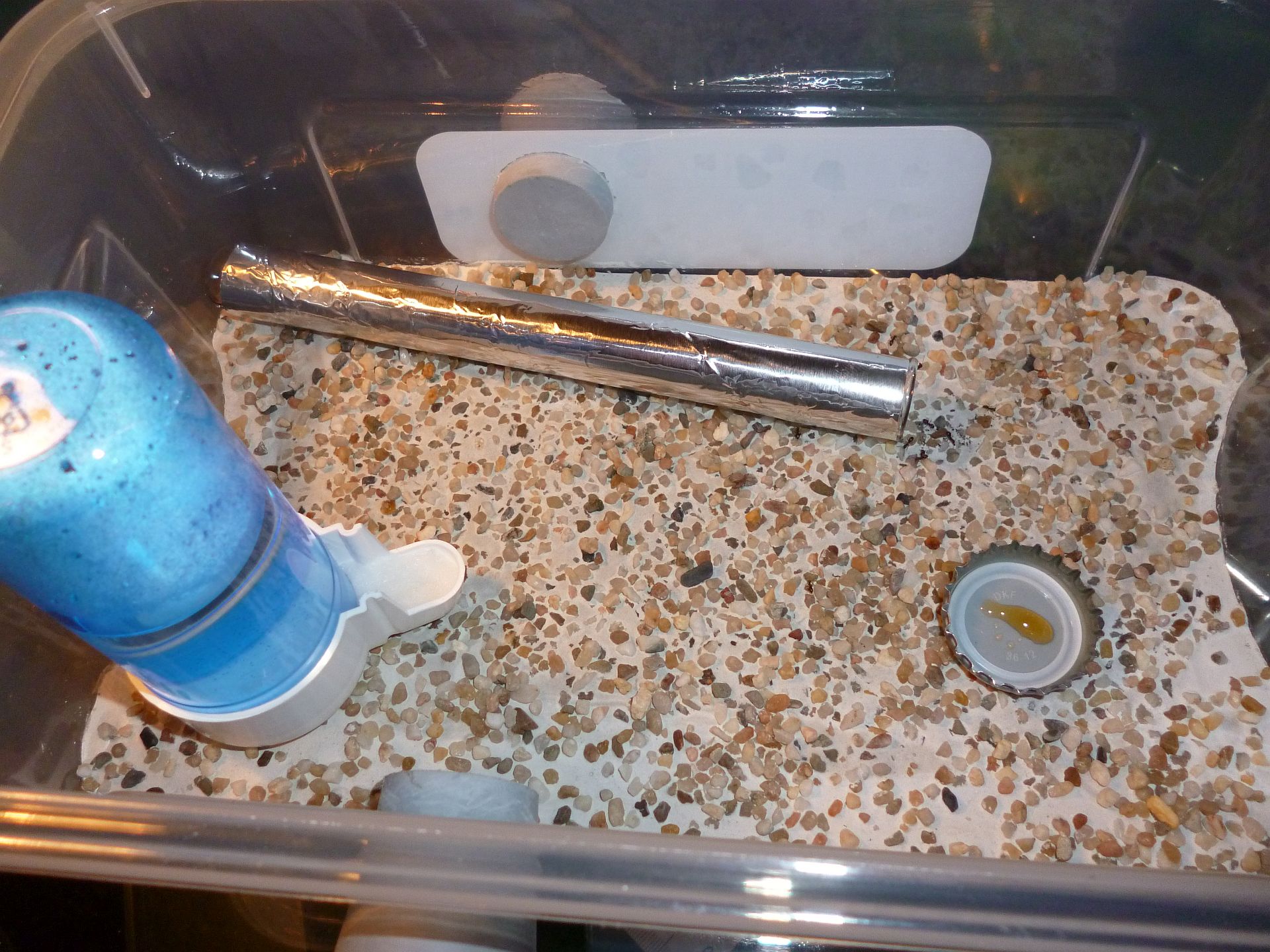 Vor zwei Tagen habe ich die Kolonie aus ihrem Winterquartier, dem Gemüsefach im Kühlschrank, geholt. Die letzten zwei Tage haben sie im Keller verbracht, um einen Übergang im Temperaturverlauf zur Zimmertemperatur hin zu gewährleisten. Heute habe ich ihnen dann eine Arena eingerichtet, und die ganze Anlage im Zimmer aufgestellt: