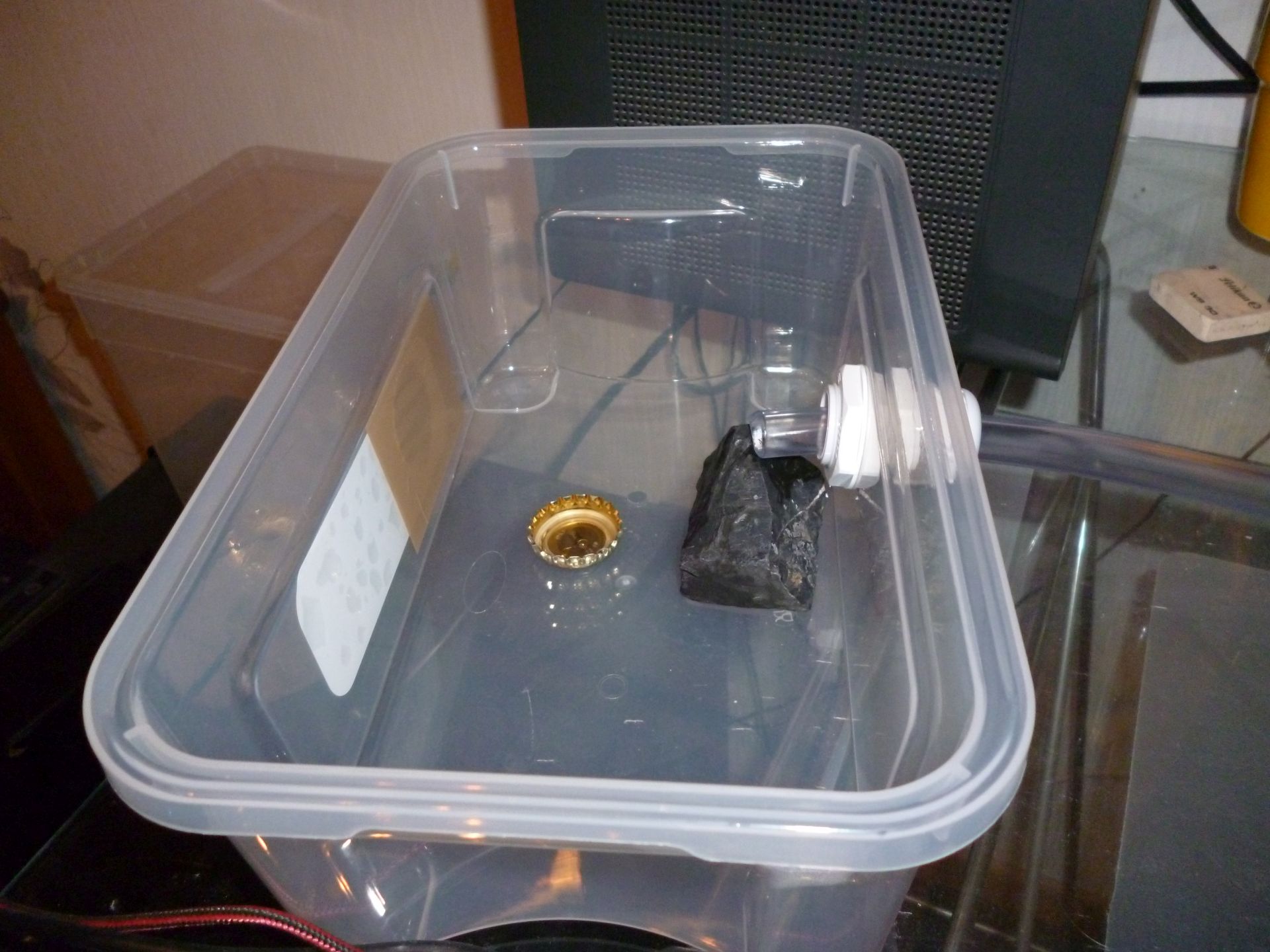 Bei den Überlegungen zum Aufbau des Versuches, war mir wichtig, dass die Königin eine Möglichkeit bekommt, ihr natürliches Verhalten zu zeigen. Für diesen Zweck habe ich mir überlegt, zwei Becken zu nutzen, die über einen ca. 40cm langen Schlauch miteinander verbunden sind.