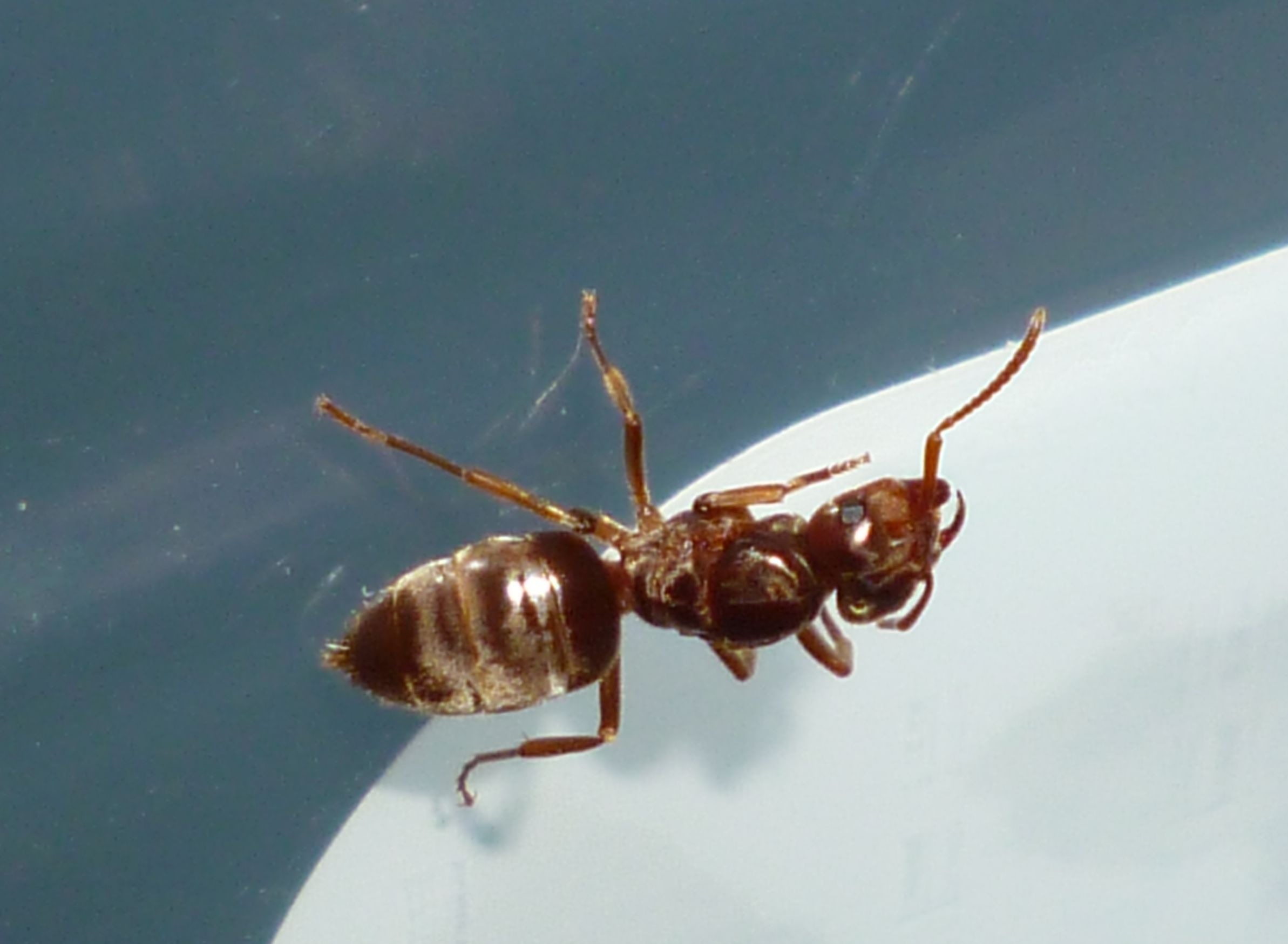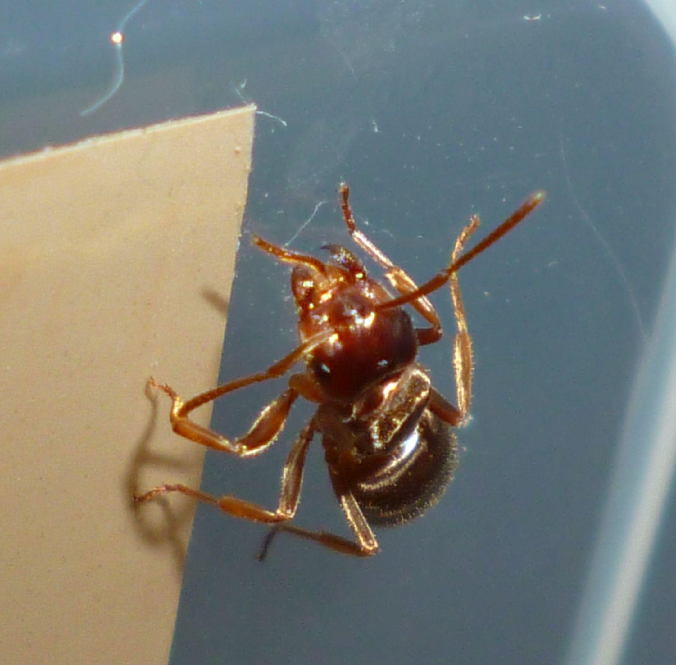 Die Königinnen liefen agil zwischen den Arbeiterinnen umher, und immer öfter waren Königinnen dazwischen, welche Lasius-Arbeiterinnen zwischen den Mandibeln durch die Gegend trugen. Neugierig geworden sammelten wir eine der Königinnen ein, und bei meinen Recherchen wurde dann schnell klar, dass es sich um eine Vertreterin der Untergattung Chthonolasius handeln musste.