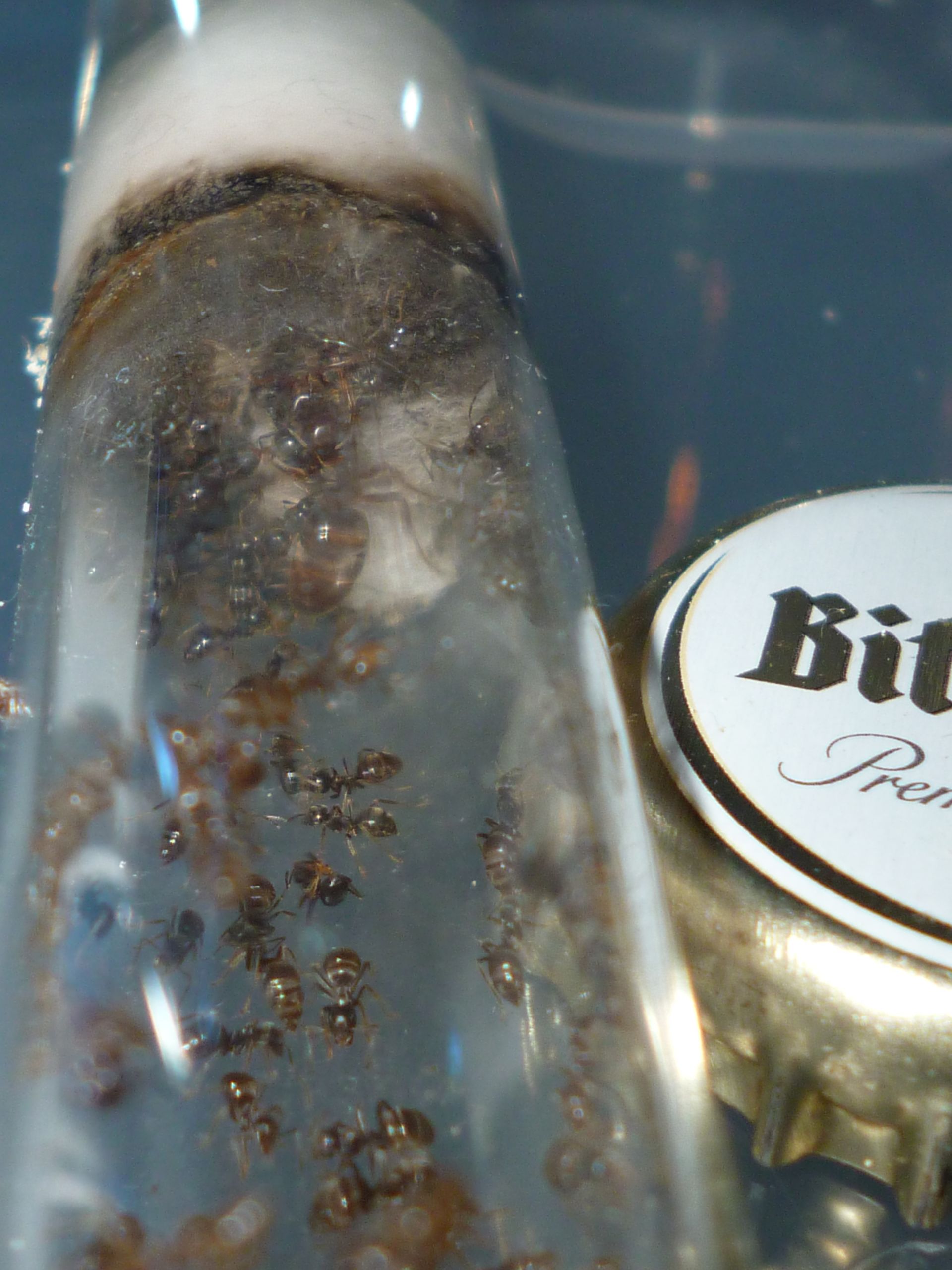 Nun, ähnliche Fotos sind von Lasius niger natürlich weithin bekannt, ist sie doch eine der am häufigsten gehaltenen Ameisen hierzulande. In nächster Zeit wird sich das auch nicht groß ändern, bis der erste Schwung gelber Chthonolasius-Arbeiterinnen schlüpft. Daraus folgt, dass es zunächst nicht viel zu berichten geben wird, erneut ist Geduld gefragt.