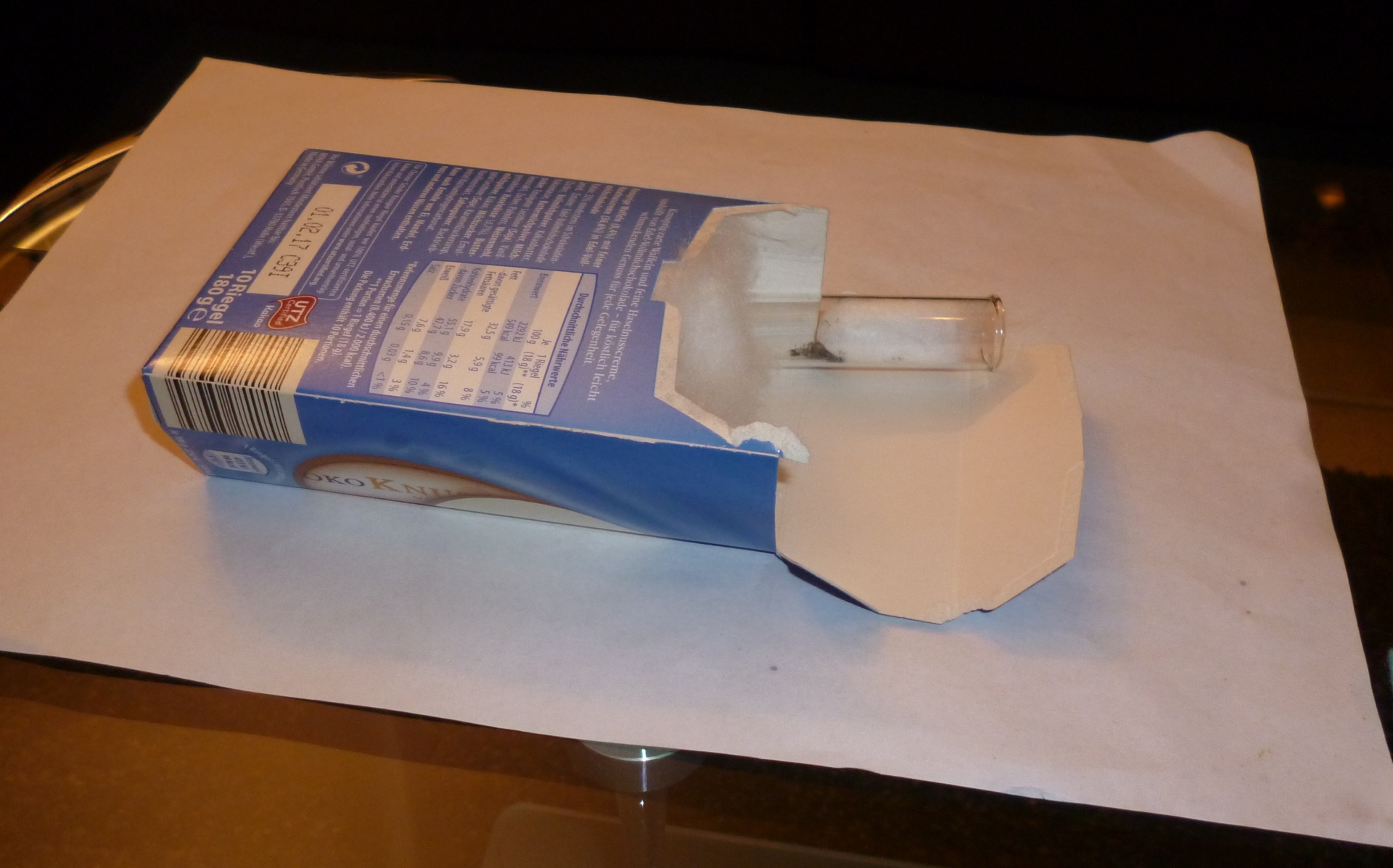 Ein kleiner Karton, mit Watte ausgestopft. Durch die Watte wird das RG in Position gehalten, und gleichzeitig vor Druck geschützt, z.B. wenn jemand Gemüse auf der Verpackung ablegt.