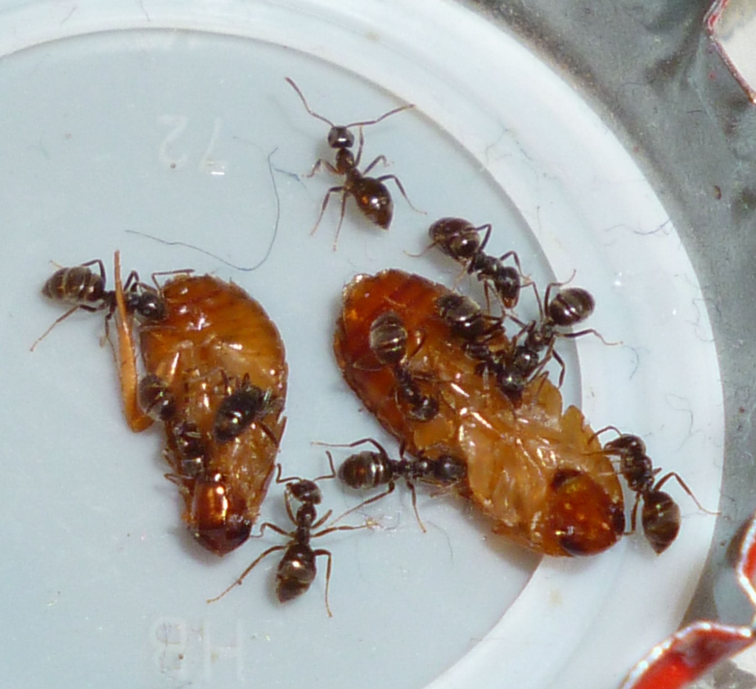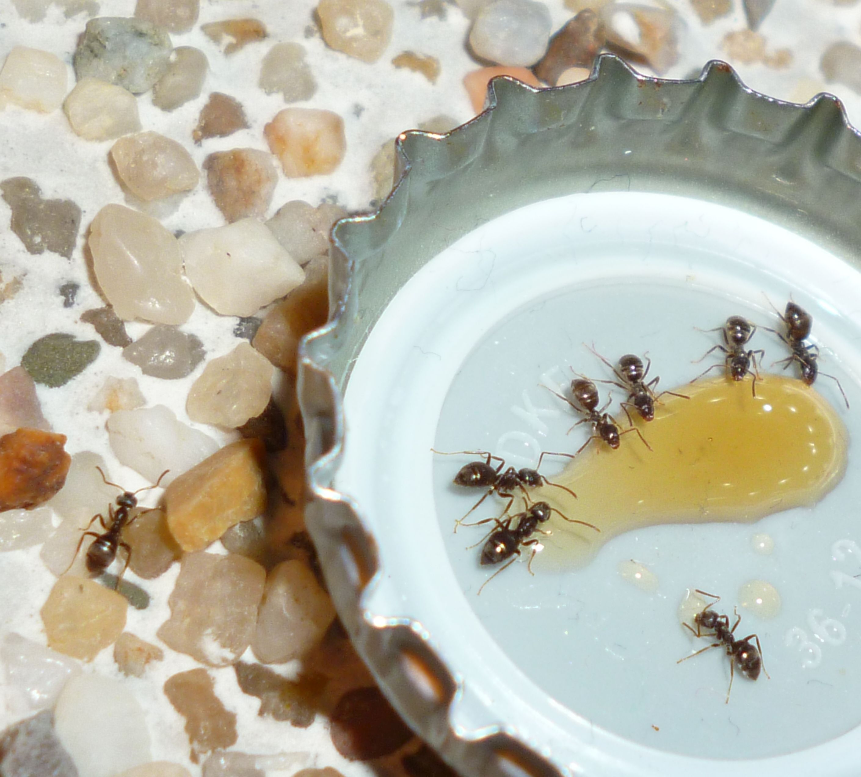 Nachdem die Kolonie zuletzt schon ihren Hunger am Honig gestillt hatte, habe ich es heute mal mit etwas Insektenfutter probiert. Und siehe da, die beiden kleinen Schokoschaben wurden begeistert angenommen: