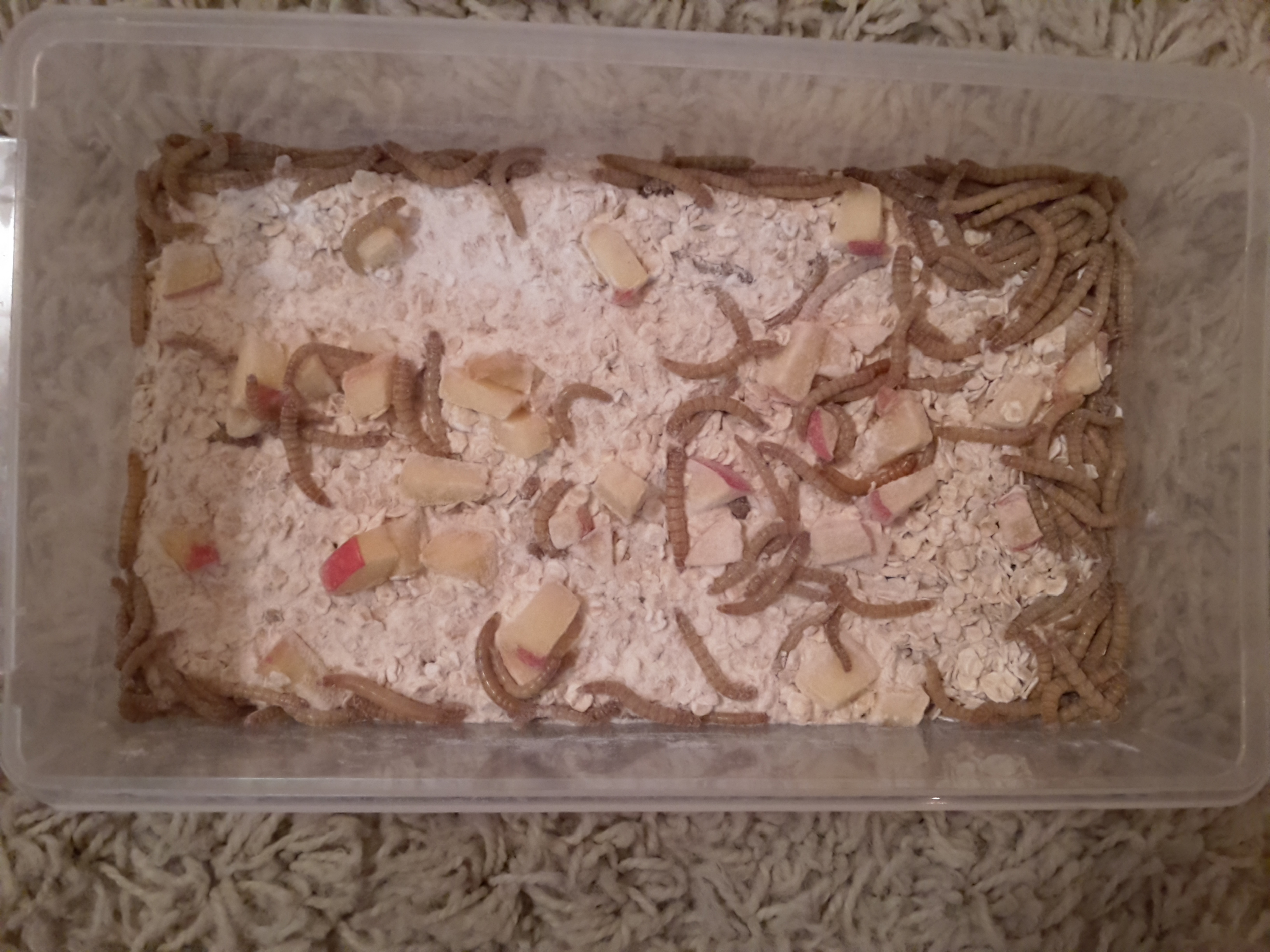 Haltung: Wir halten die Würmer in einem Plastikbehälter, als "Boden" dienen hier Haferflocken und Mehl. Die Käfer halten wir zusammen in einer Ikeabox, auch hier mit dem gleichem Boden. Die Käfer lieben es auch den Materialien aus Pappe herumzukrabbeln und rollen oftmals mit der Papprolle durch den Behälter. Die Mehlwürmer vergraben sich zumeist im Mehl oder halten sich an den Ecken auf. Wir lagern sie bei Zimmertemperatur und wenig Lichteinfall. Deckel nicht vorhanden, da die Würmer an rutschigen Oberflächen nicht hochkommen und die Käfer keinerlei Anstalten zur Flucht machen.