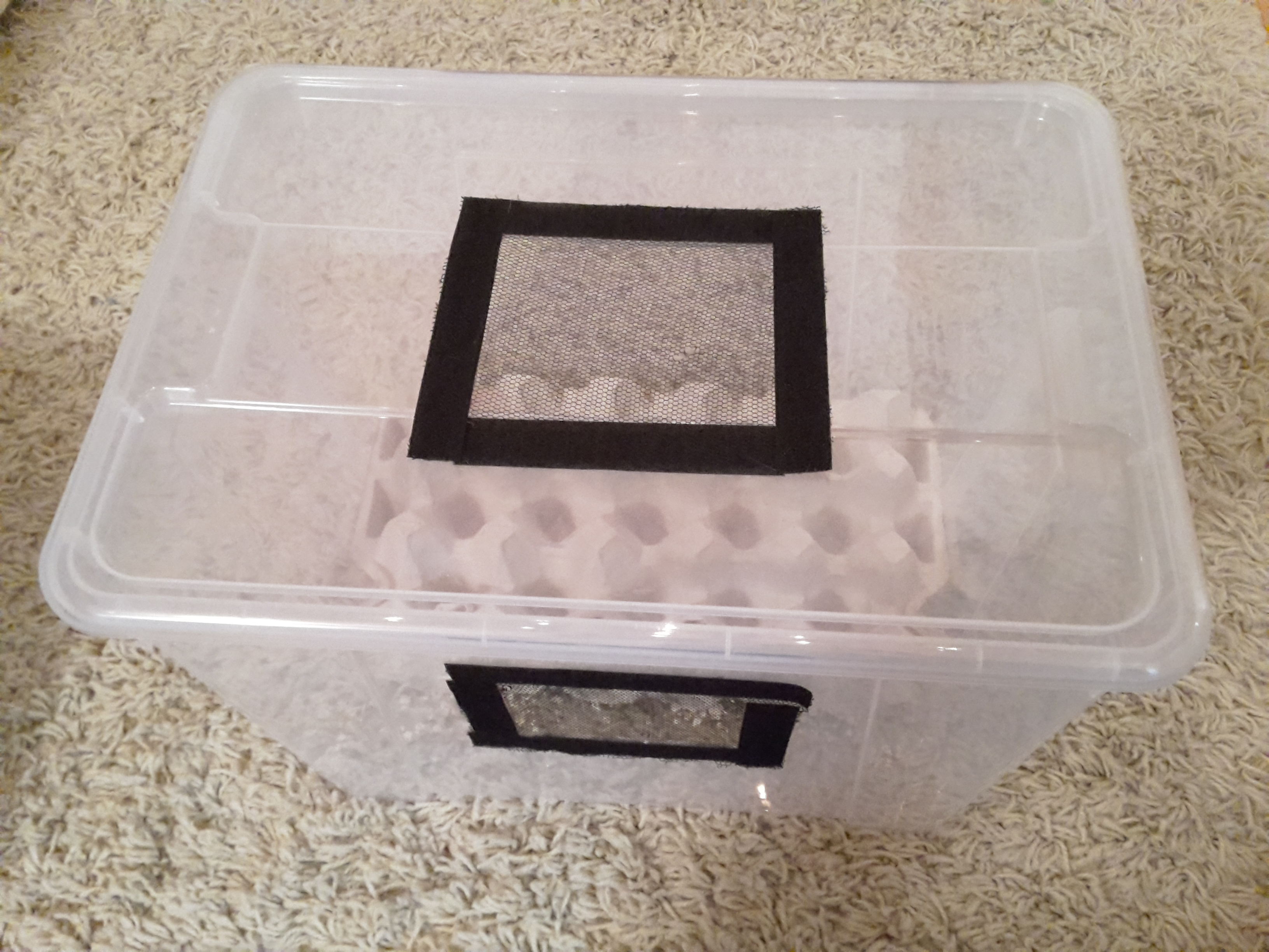 Haltung: Die Tiere haben wir bereits in dieser Verpackung gekauft. Unten befindet sich ein Nährboden und darüber eine Schicht aus Kunststroh (weil echtes Stroh schimmeln würde). Oben ist ein Deckel mit Loch, welcher für Luft sorgt. Unter dem Deckel ist eine schicht, die an Folienabdeckung aus dem Garten erinnert (eine Strumpfhose tut's auch!).