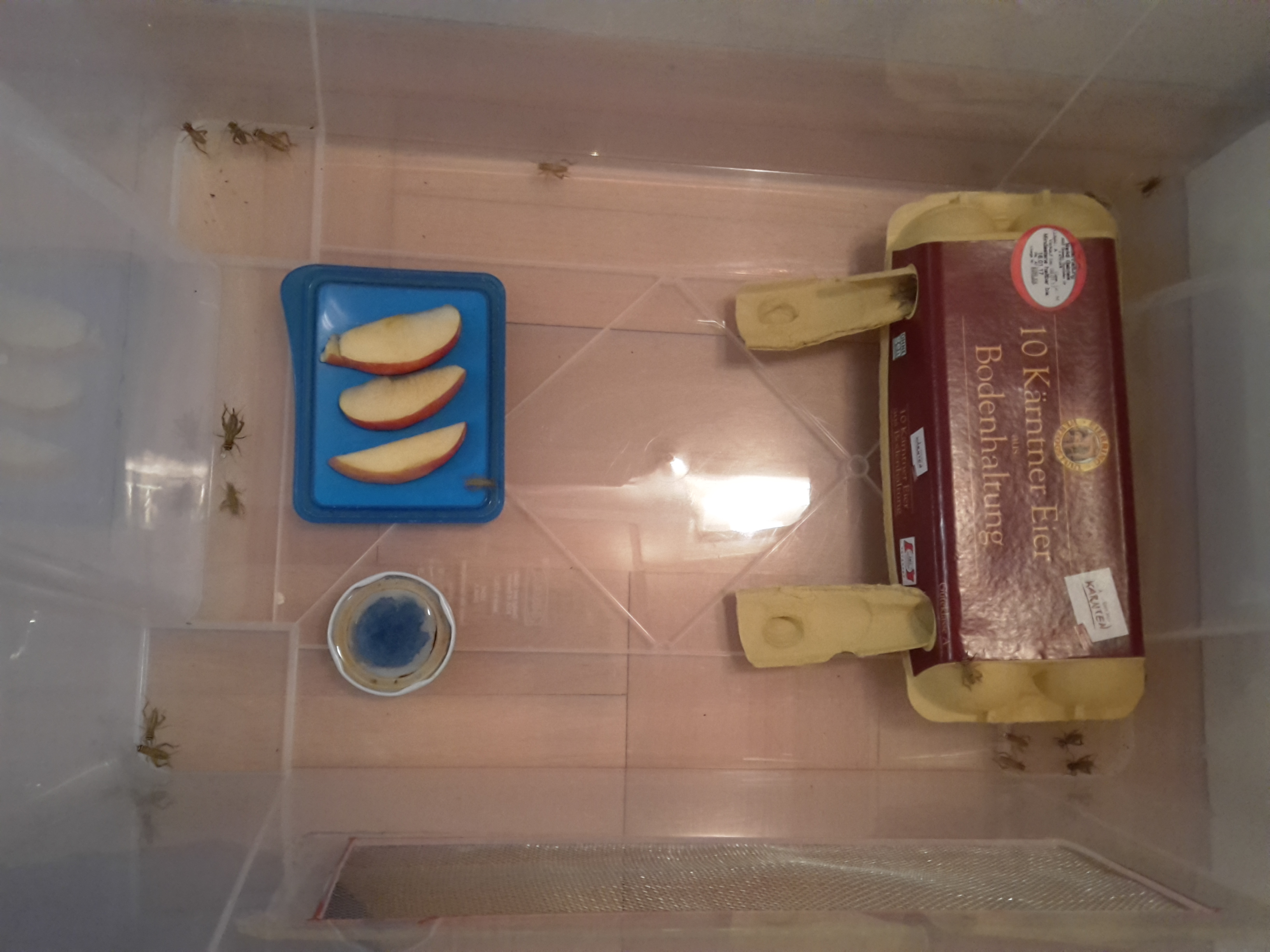 Haltung: Hier ebenfalls in einer Ikeabox, diesmal aber etwas Höher (da die Tiere ja springen) und mit Eisengitter, da die Tiere sich durch das Fliegengitter gebissen haben und im Haus eine Party feierten. Auch hier 2 Entlüftungslöcher zur besseren Luftzirkulation. Wir wissen natürlich, dass Heimchen nicht die idealen Futtertiere sind und wir wollen uns gerne Schockoschaben zulegen, dass Problem ist jedoch, dass wir diese Tiere in keiner Zoohandlung zu kaufen bekamen. Wenn wir sie bestellen würden hätten wir mehr als 20€ Versandkosten (das ist uns zu teuer), wir wollen uns jedoch noch eine dritte Ameisenart holen und diese da mitbestellten. Wir halten die Heimchen bei gedämpften Licht bei Raumtemperatur. Die Tiere halten sich sowohl in der Box als auch gerne im Eierkarton auf (vorne haben wir eine Rampe für die Zirper gemacht um leichter in den Karton zu kommen).