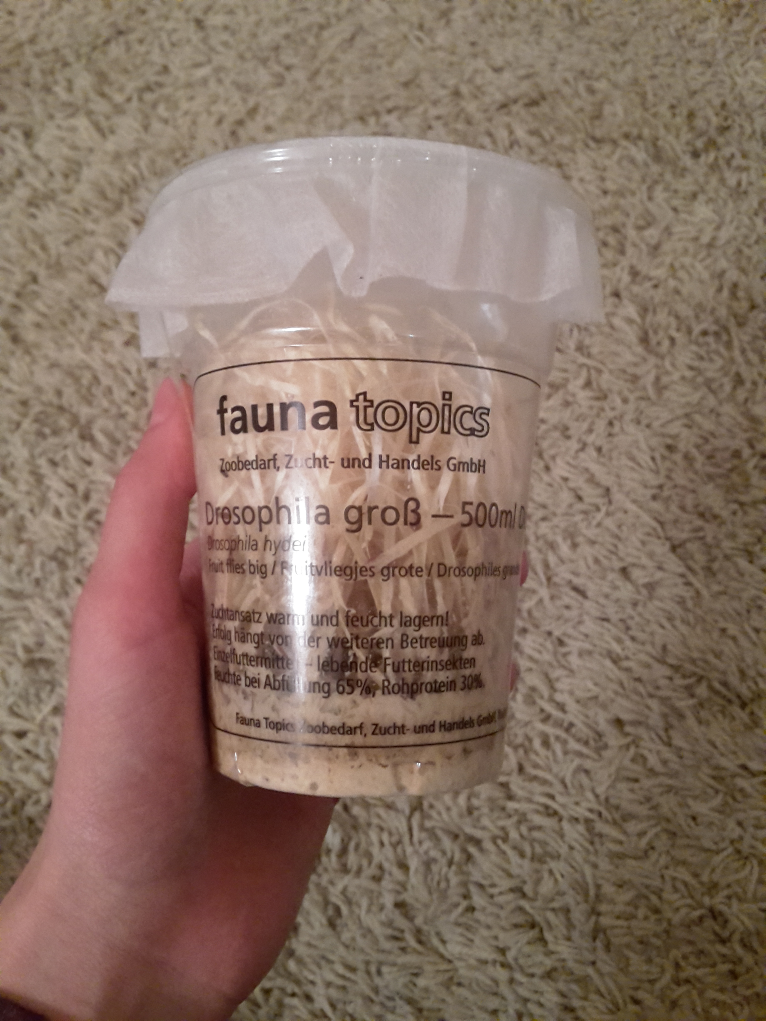 Reinigung: nicht möglich, jedoch werden die Fliegen umgesetzt wenn der alte Nährboden aufgefressen ist.