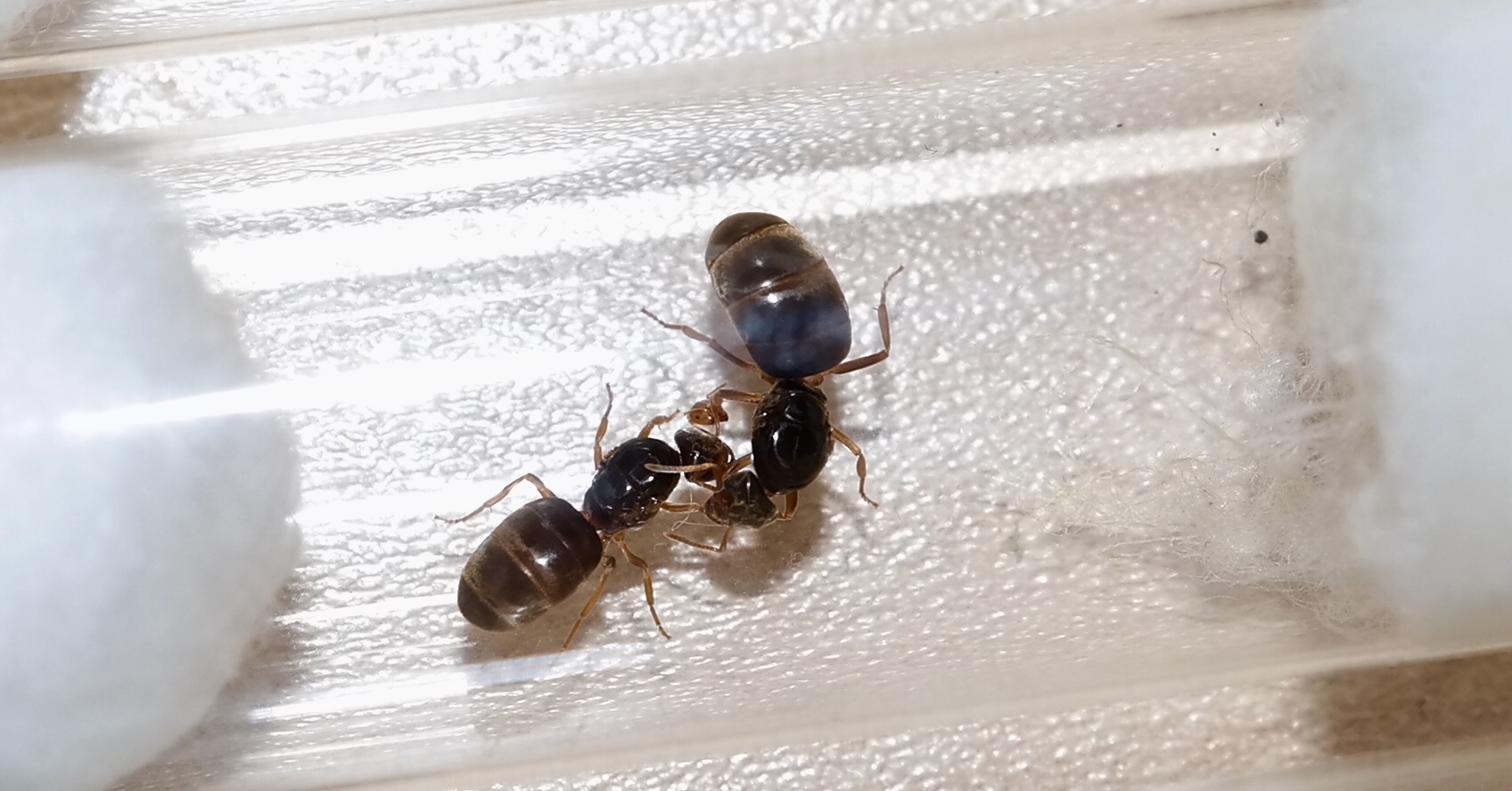 Wenn die erste Ameise, die es bisher über das Paraffinöl geschafft hat und dann auch noch aus dem Formicarium gekommen ist, eine Myrmica rubra Mikrogyne ist, dann staunt man nicht schlecht.
