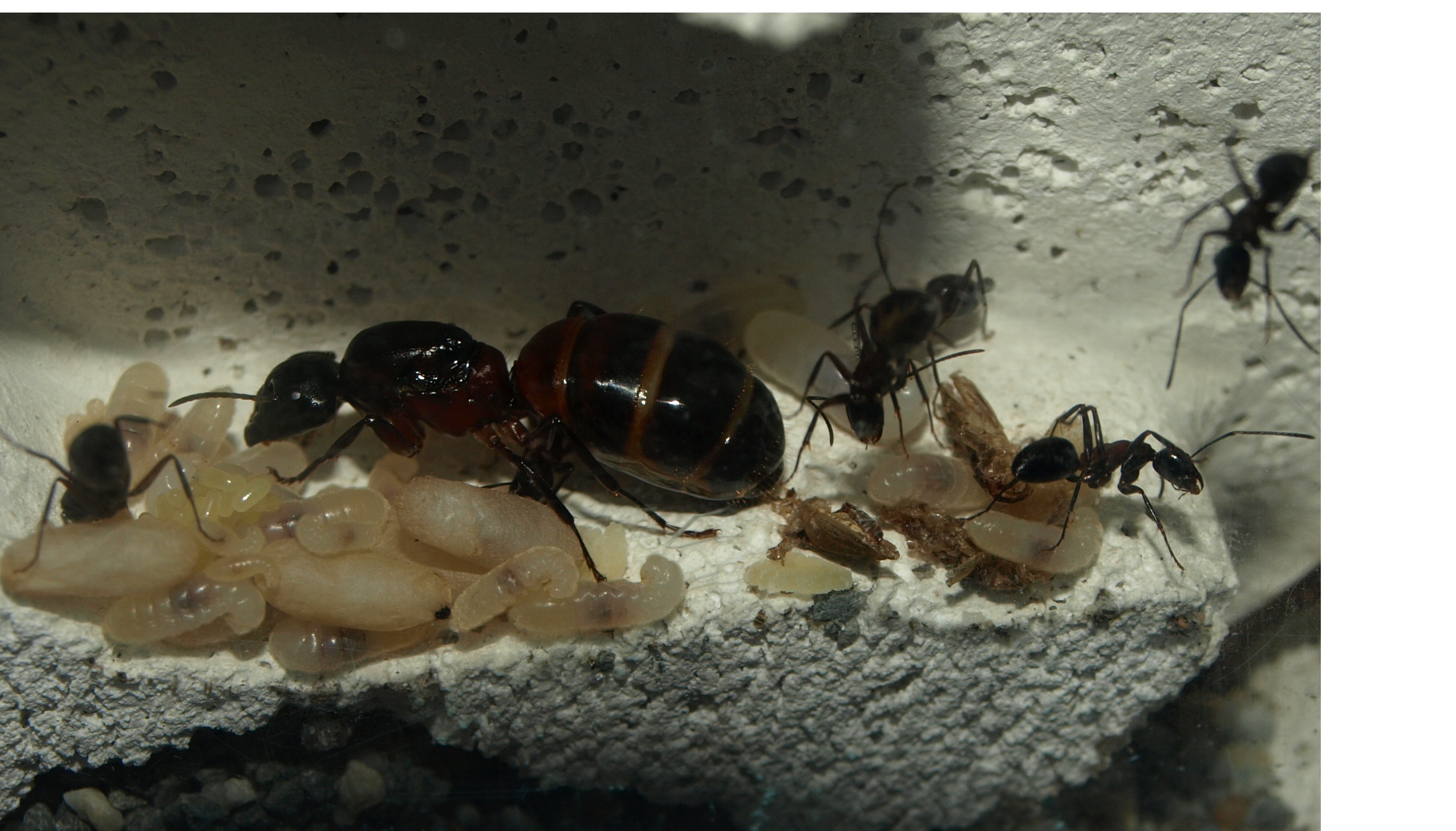 Königin mit insgesamt acht Arbeiterinnen wovon eine leider kurz darauf verstarb. Ich schiebe dies einfach mal auf den Transportstress, da die anderen sieben in "einwandfreiem Zustand" sind und bis heute leben. Nach der Ankunft habe ich das RG-Nest in ein kleinen Behälter gelegt, welcher mit einem Ytong verbunden war. Dieser Ytong hat anscheind so überzeugt, dass sie noch am selben Tag umgezogen und bis heute dort verblieben sind. Allerdings empfinde ich das Nest nicht gerade als eine Augenweide, daher werde ich wohl früher oder später ein anderes Nest anbieten. Eventuell auch ein Holznest, wobei ich eher dazu tendiere, Ytong und Holz miteinander zu kombinieren. Mit dem Bau des Nestes fange ich aber erst an, wenn ich eine Kamera zur Verfügung habe und dies dokumentieren kann. Dies dürfte ab April der Fall sein. Aber auf den Termin möchte ich mich jetzt nicht festlegen. Nachdem sich einige Wochen nicht viel bei der Kolonie tat, steckte ich sie in den Kühlschrank zur