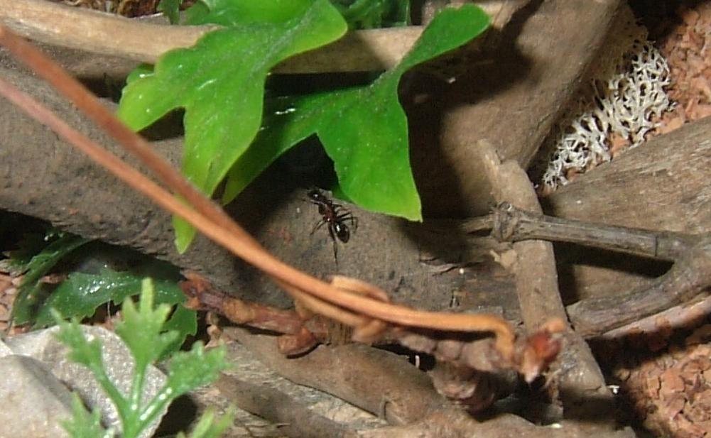 • Sonstige Angaben: Die Männchen helfen bei der Brutpflege. Es existieren Major- und Minorarbeiterinnen. Sehr wehrhaft, kann mit einem Biss Waldameisen "köpfen", greifen den Menschen aber nur bei Neststörung an. Sie sind sowohl tag- als auch nachtaktiv; nisten vorzugsweise im Holz, welches am Boden liegt. Ein Wärmestrahler sollte tagsüber einen Stein oder eine Formicarienecke erwärmen.