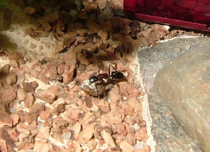 Als sie sodann einen scheinbar akzeptablen Platz, ca. 10cm vom RG-Eingang weg, zur Ablage gefunden hatte, ließ sie die Überreste des mittelgroßen Heimchens einfach liegen, von dem nicht mehr viel Übrig war; bisschen Kopf, etwas Thorax und damit doch deutlich mehr "ausgeschlachtet" als wie es meine Lasius niger zu pflegen machen.
