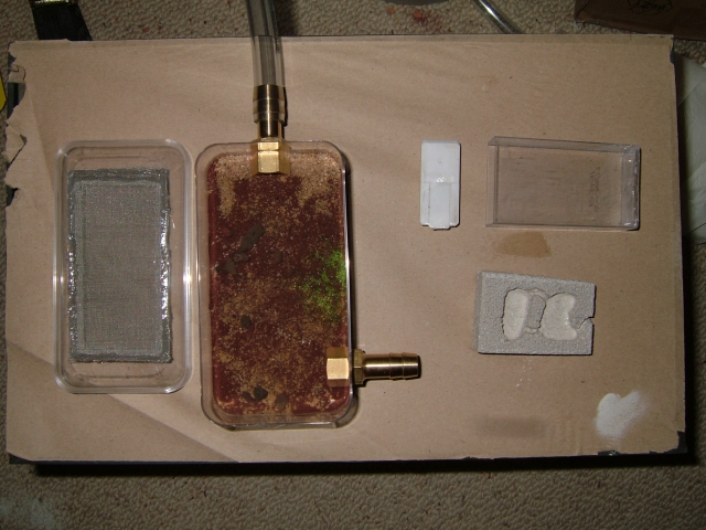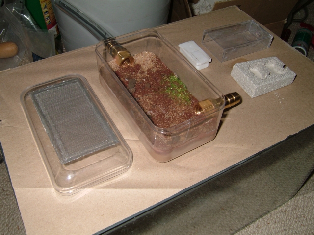Der Ytong wird in die Schachte geschoben, an der ein Schlauch angeklebt ist, dann möchte ich den Wassertank mit Sermais auffüllen und schließlich den Deckel der mit Silikon abgedichtet ist aufkleben, zuvor natürlich noch ein Loch zum Befüllen gebohrt.
