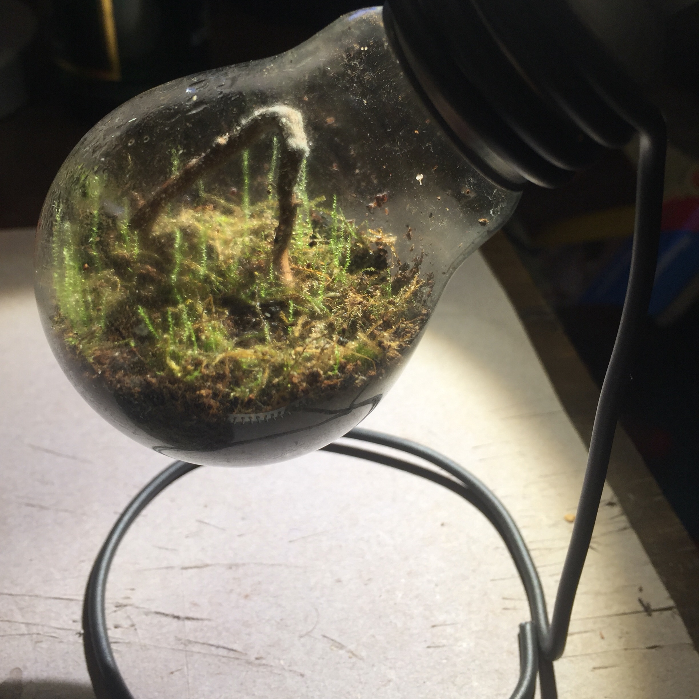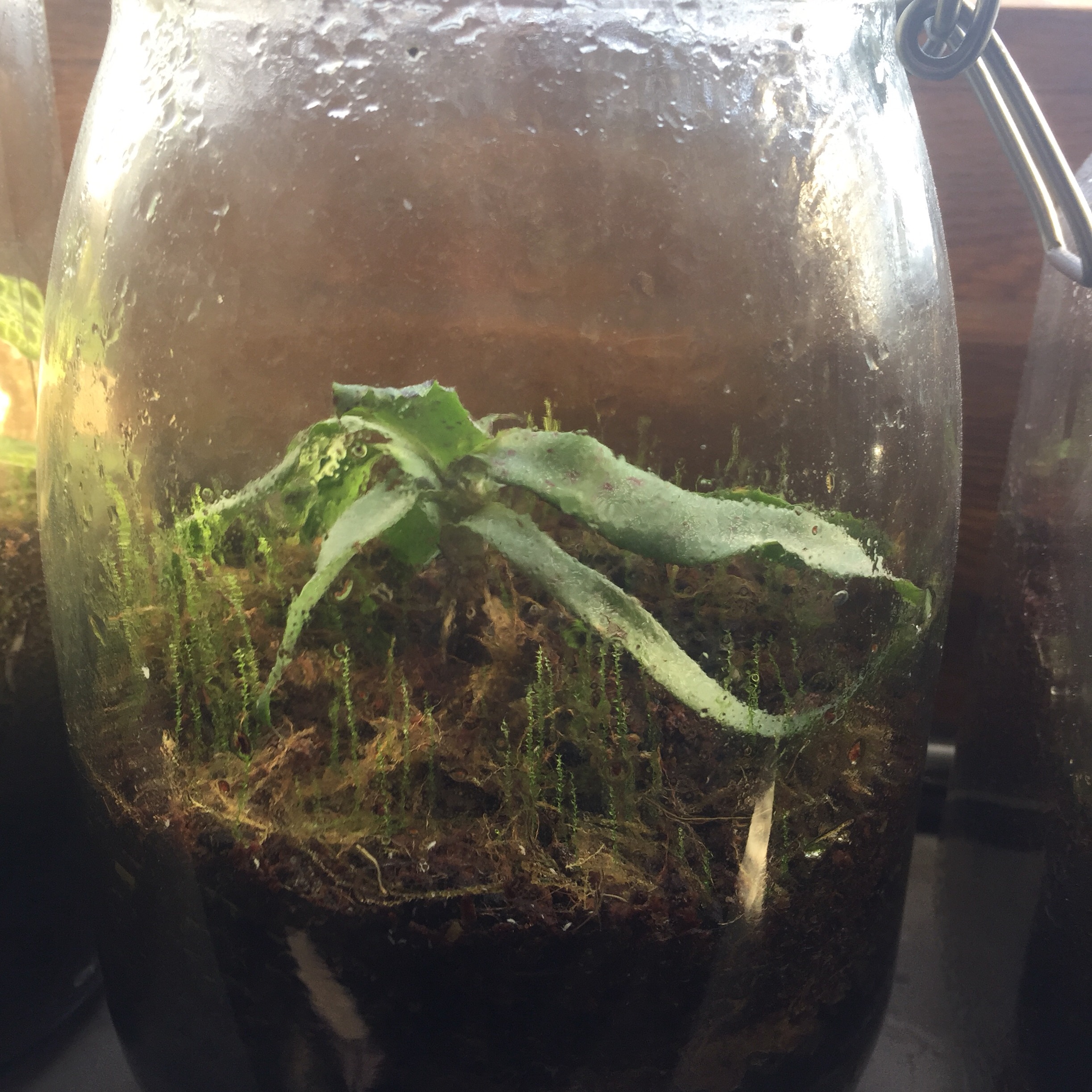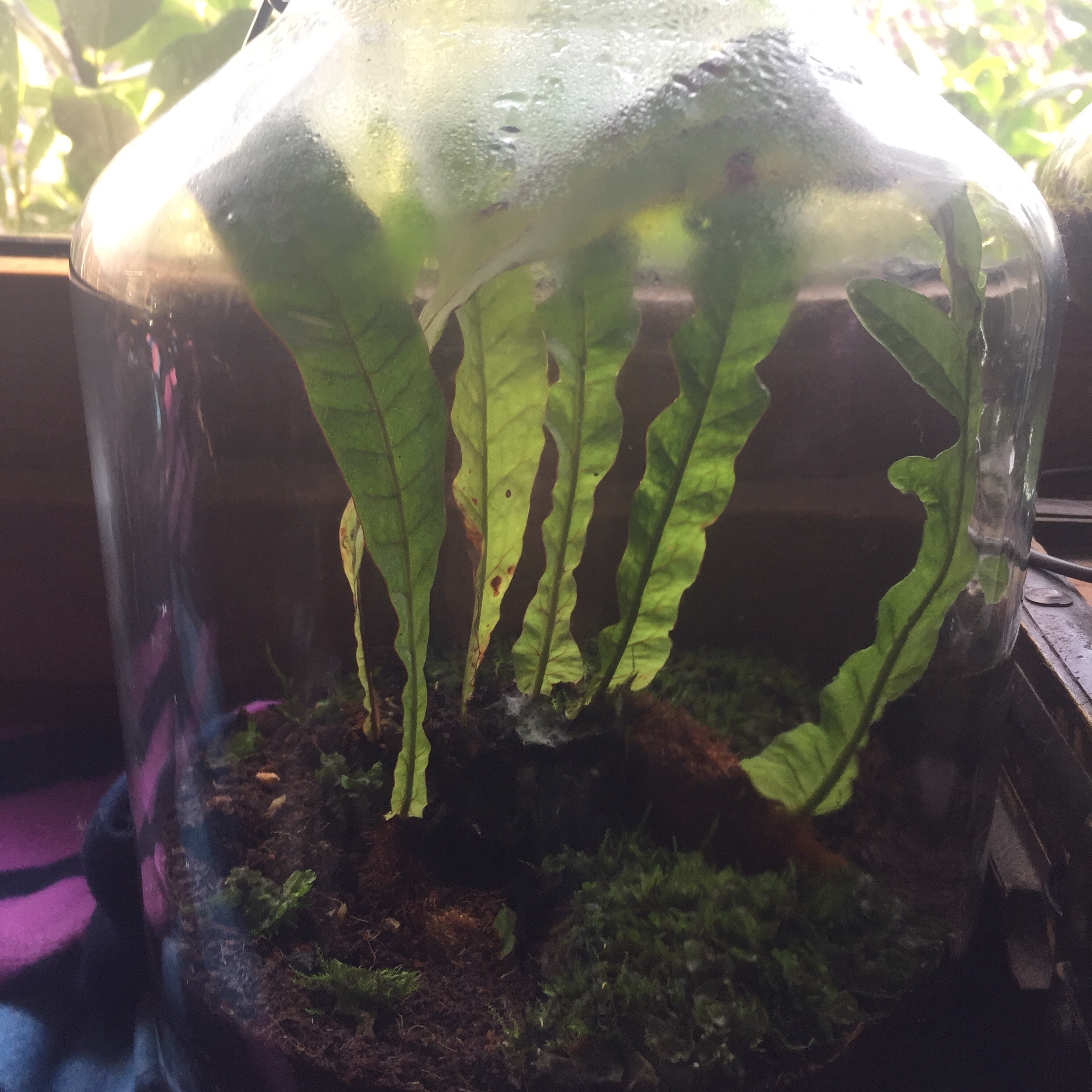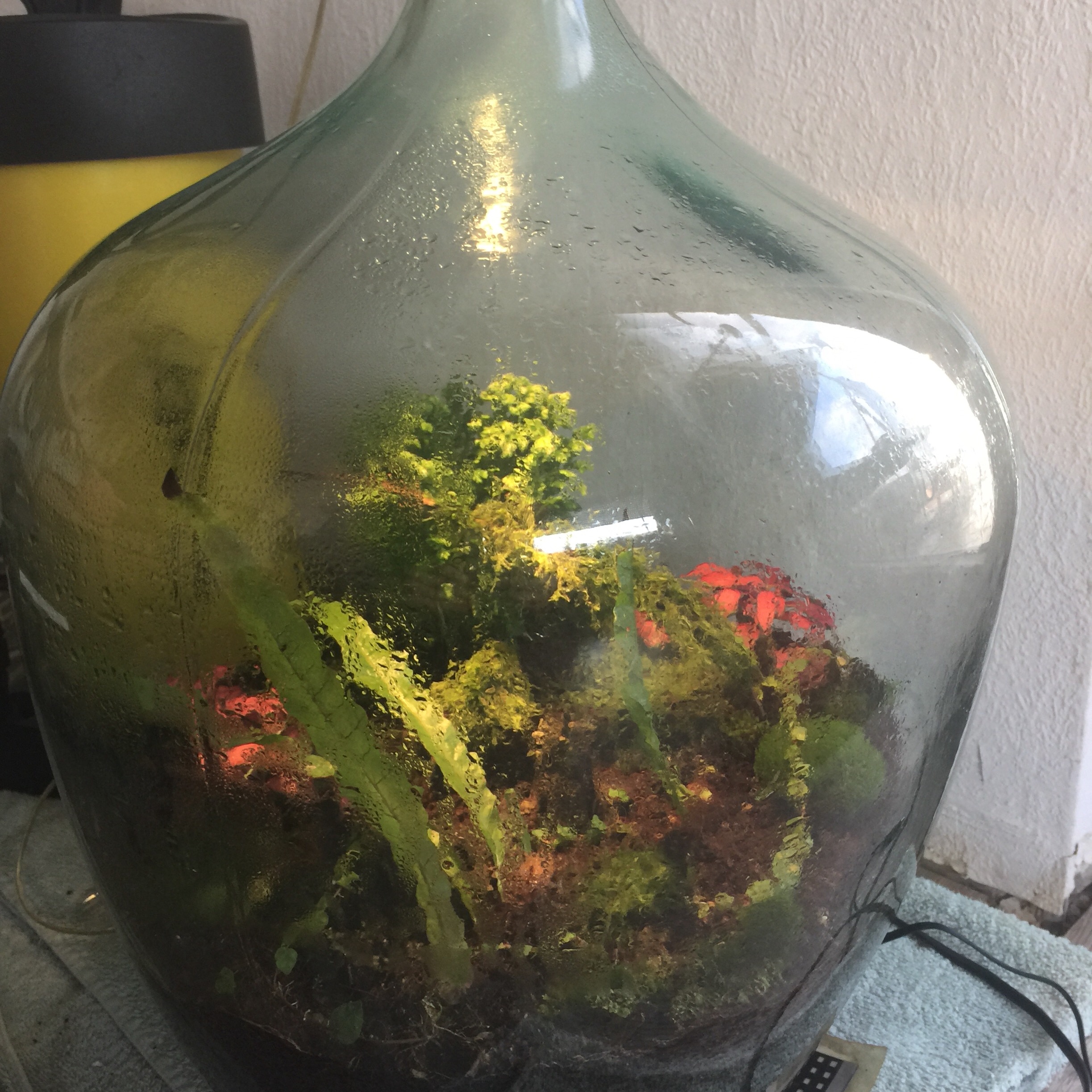 Und eine sehr groĂe Ballonflasche bepflanzt mit Moosen, Farnen, Fittonia und Selaginella.