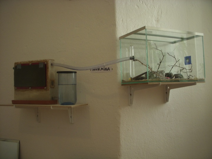 Am anderen Ende steckte ich einen passgenauen Ytongzylinder in den Schlauch der sich mit Wasser vollsog und mit dem Nest verbunden war. Dies funktionierte ganz gut und ich konnte genau verfolgen wie viel Wasser der Stein sog. Doch ist diese Methode alles andere als Wartungsfrei. Im Sommer 2012 lief mir zwei mal der Tank aus, und einmal war er verstopft. Man kann es sicherlich anders machen, doch gefällt mir diese „Spielerei“ und versuche sie weiter zu verbessern.