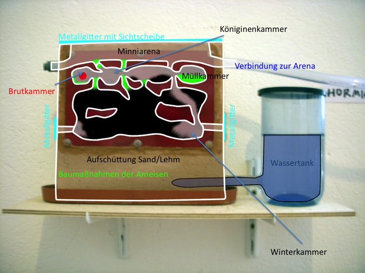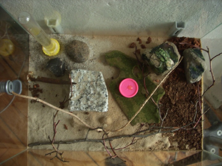 Die Arena ist gekauft und hat eine Größe von 20x20x30cm und 10mm Bohrungen, mit Deckel. Sie ist mit einem 40cm langen Schlauch mit dem Nest verbunden. Der Boden ist mit einer ca. 5mm Lehmschicht ausgegossen. Zur Dekoration benutzte ich Steine, Äste und sonstige kleine Dinge die ich bei meinen Spaziergängen finde. Anfangs kochte ich