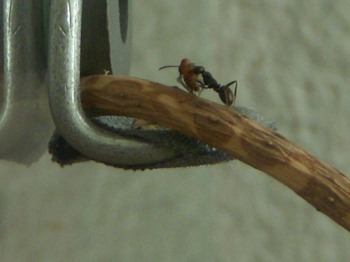 der dritte verengt. Die obere rechte Kammer wurde bis zur hälfte mit Baumaterial angefüllt. Sie bekommen 1-2 Fruchtfliegen am Tag. Eine Arbeiterin erledigt alle Außenarbeiten.
