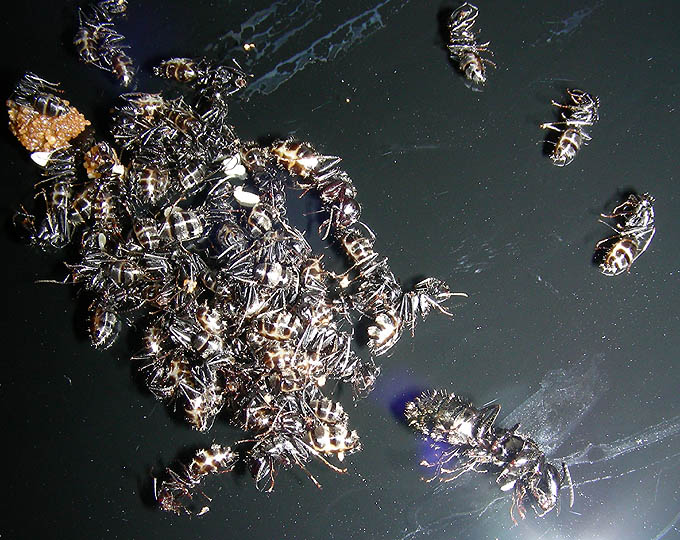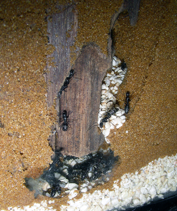 22.04.2009 Alles läuft bestens - hab auch schon eine minor-Arbeiterin gesehen unter den minima-Arbeiterinnen die aber nur kurz mal zu sehen war - nachdem ich nachfeuchtete. Auch seit 3 Wochen ca. geb ich ihnen ein neues Honigwasser/Vitamin-Eiweissgemisch welches bis jetzt sehr gut angenommen wird und so auch natürlich gute Inhaltsstoffe enthält. Erhoffe mir dadurch ein schnellere Entwicklung zu größeren Arbeitern - auch Supradyn-Multivitamin-mix ich von Zeit zu Zeit ebenfalls hinzu. Auf der Insektenliste stehen sie bei mir ganz oben und ich versuch ihnen immer frische Insekten in die Brutkammer zu geben. Hauptsächlich mögen sie am liebsten alle Arten von Fliegen oder Spinnen. Bei der Zitterspinne bin ich mir aber noch nicht so sicher ob sie die wegbekommen! Kleine Heimchen nehmen sie auch - aber ich glaub die haben die Camponotus nicht so gern wie zB. die Formica cunicularia die wirklich alles gerne nehmen - egal wie alt!