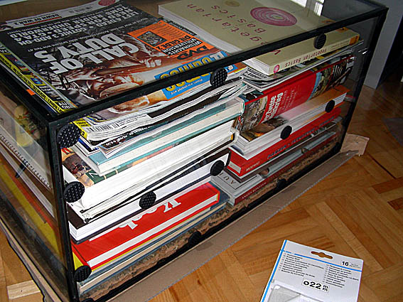 07.06.2009 Hab entdeckt das sie ein kleines Loch an der untersten Seite nach Hinten hinaus gebohrt haben und dort Steinchen und Sand nach unten fallen ließen auf den Boden. Sammelte 2 Arbeiterinnen ein die draußen deswegen herum liefen und verschloß das Loch mit einem Textilklebeband.