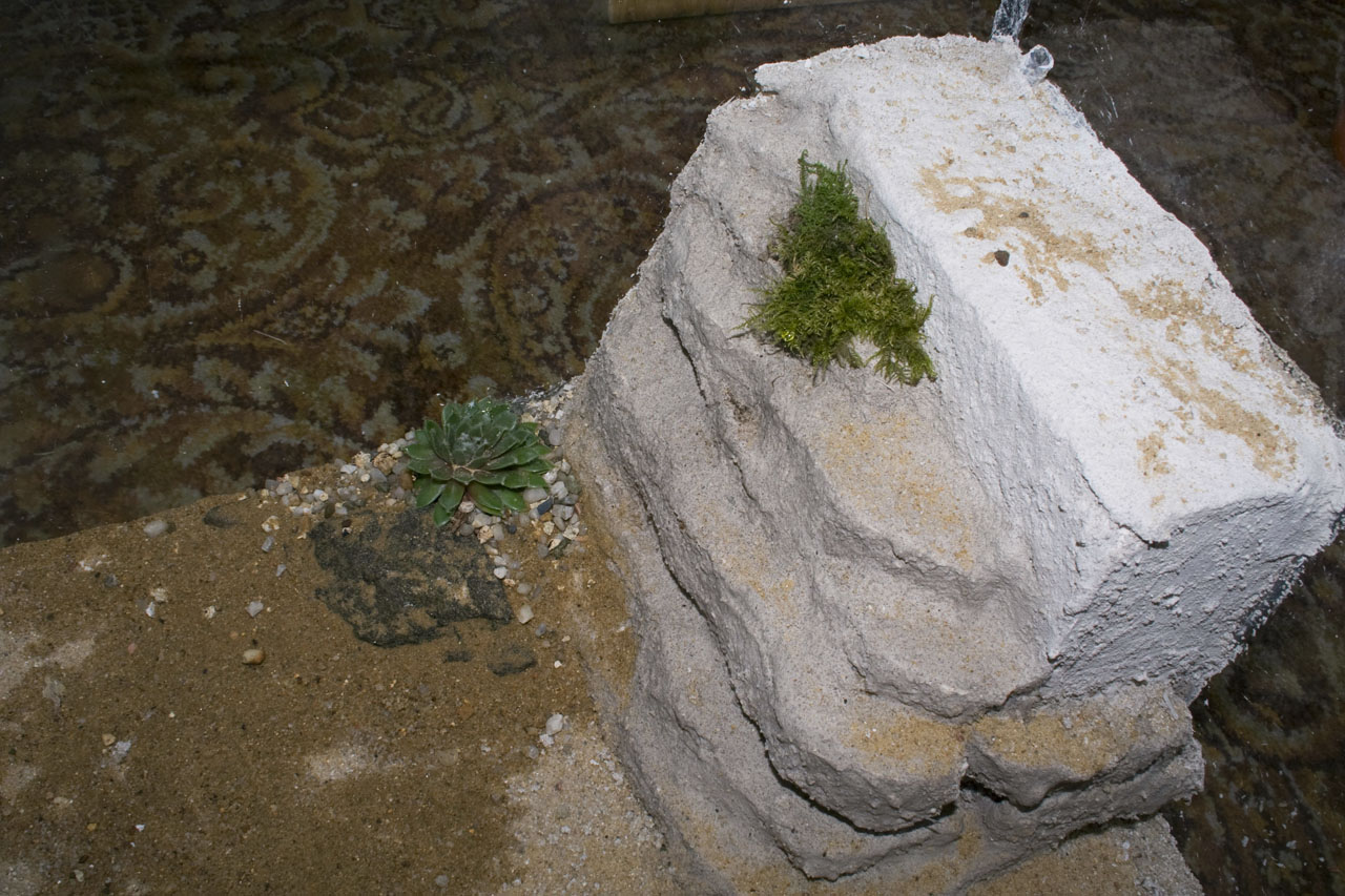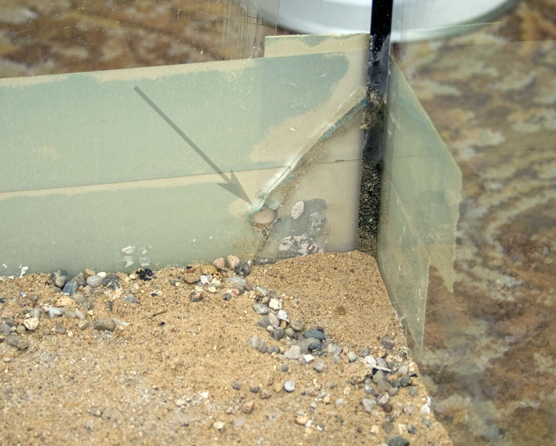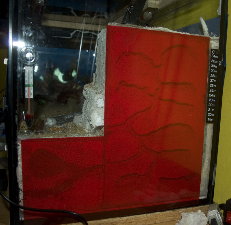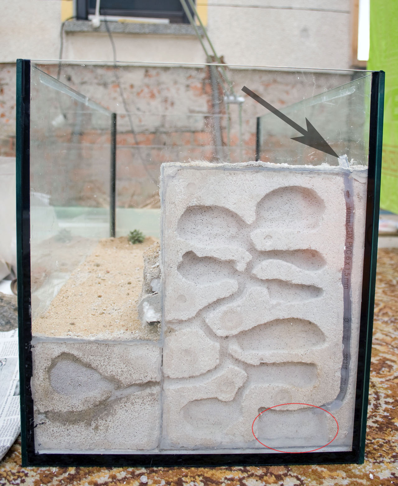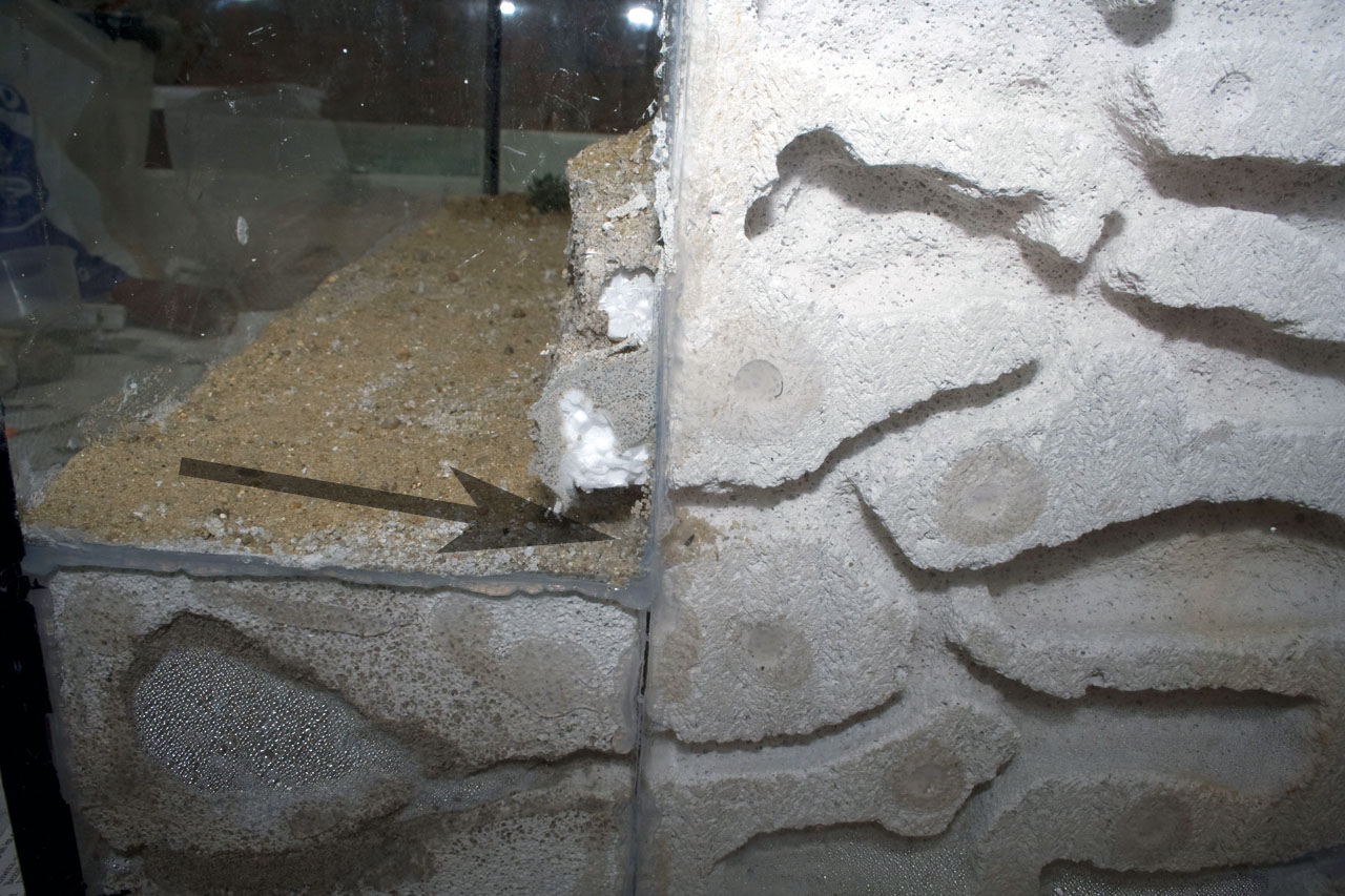 Es besteht aus einem alten 80x35x40 Aquarium, in welches ich auch noch ein Loch gebohrt habe um das Formikarium jederzeit erweitern zu können (was bei Messor barbarus aufgrund der schnellen Vermehrung ja wichtig ist). Leider ist mir dabei auch ein Teil der Scheibe gesprungen. Ich bin derzeit noch am überlegen, wie ich das am besten verdecke. Das Nest habe ich aus Ytong gebaut, der sich nahtlos in die Landschaft schmiegen soll. Der vordere, aufrecht stehende Stein hat im unteren Teil eine kleine Wasserkammer (1. Bild roter Kreis), die ich über einen Schlauch, der nach oben geht (1. Bild schw. Pfeil), jederzeit nachfüllen kann. So bleibt der untere Bereich des Nestes, welcher für die But gedacht ist, immer feucht, während der obere Bereich für die Körnerlagerung weitesgehend trocken bleibt. An den stehenden Ytong Block habe ich noch einen längeren, liegenden Block angebaut, der teilweise mit einem Sand-Lehm-Gemisch verschlossen ist, damit sich die Ameisen zu gegebender Zeit selbst neue Kammern erschließen können. Zudem gibt es auch noch einen zweiten Eingang zum liegenden Block, der aber unter Kies verschüttet ist. Eigentlich wollte ich hier noch eine Erweiterung dranbauen, habe dann aber doch davon abgelassen.