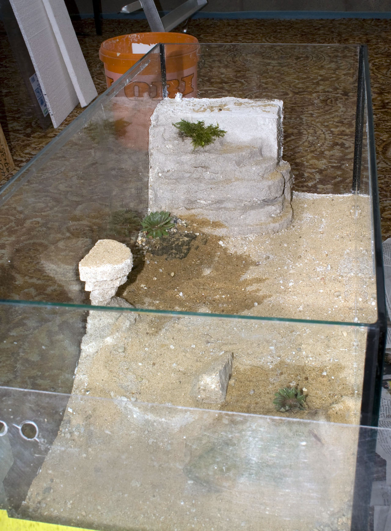 Mit Hilfe von dicken Styroporplatten habe ich den Boden des Formicariums fast auf eine Höhe gebracht. Die Lücken habe ich an der Vorderseite mit Kies verschlossen, sodass man die Platten selbst von vorn nicht sieht. Die restlichten Spalten wurden mit Silikon und Spachtelmasse verschlossen und teilweise vorher noch mit etwas Kies aufgefüllt. Der Boden besteht auch aus Spachtelmasse und Sand. Zusätzlich habe ich noch ein paar Steine und Sukkulenten aus unserem Garten in die Landschaft eingefügt. Der Sand sieht auf den Bildern bei den Pflanzen etwas dunkler aus, da ich gerade erst gegossen hatte. Evtl kommen noch ein paar Tillandsien rein, wenn ich irgendwo welche herbekomme.