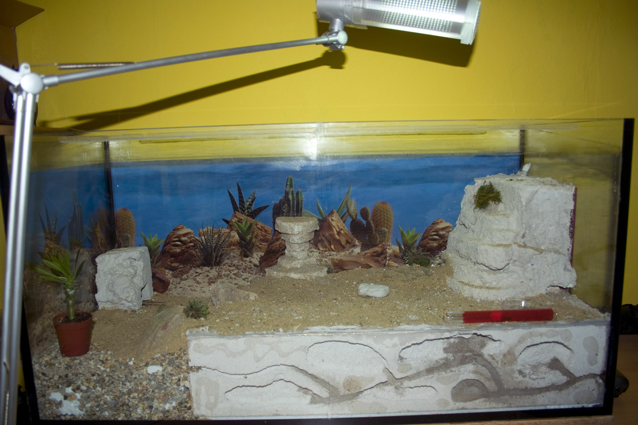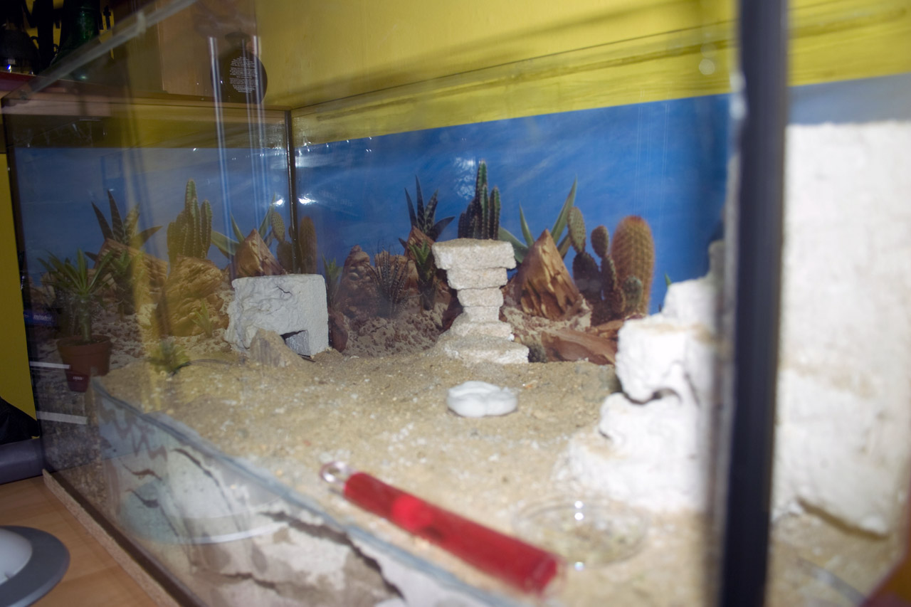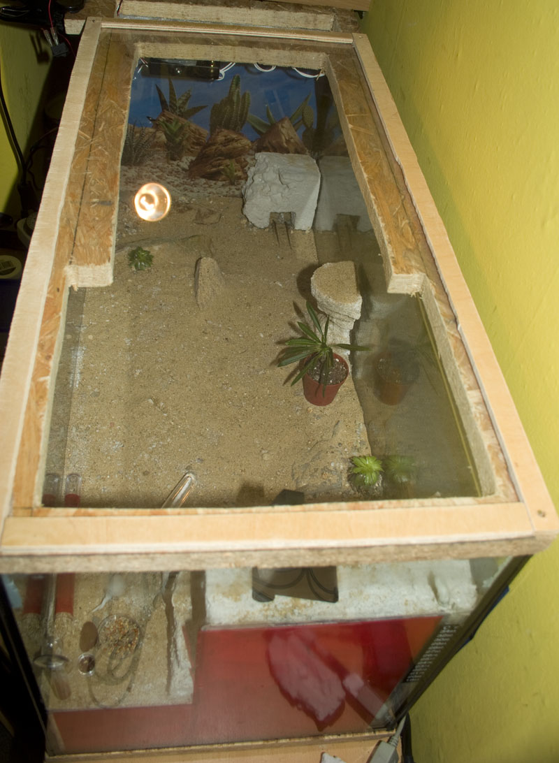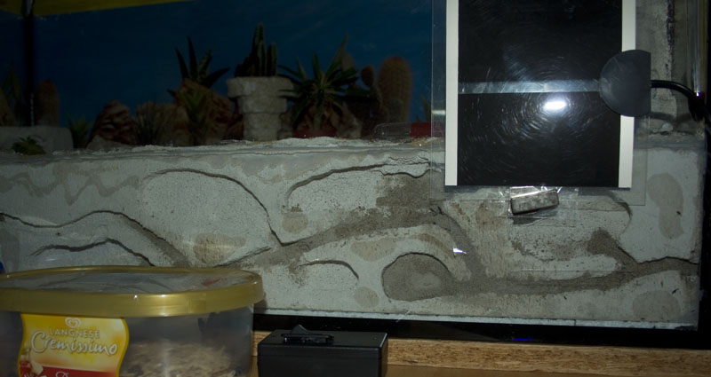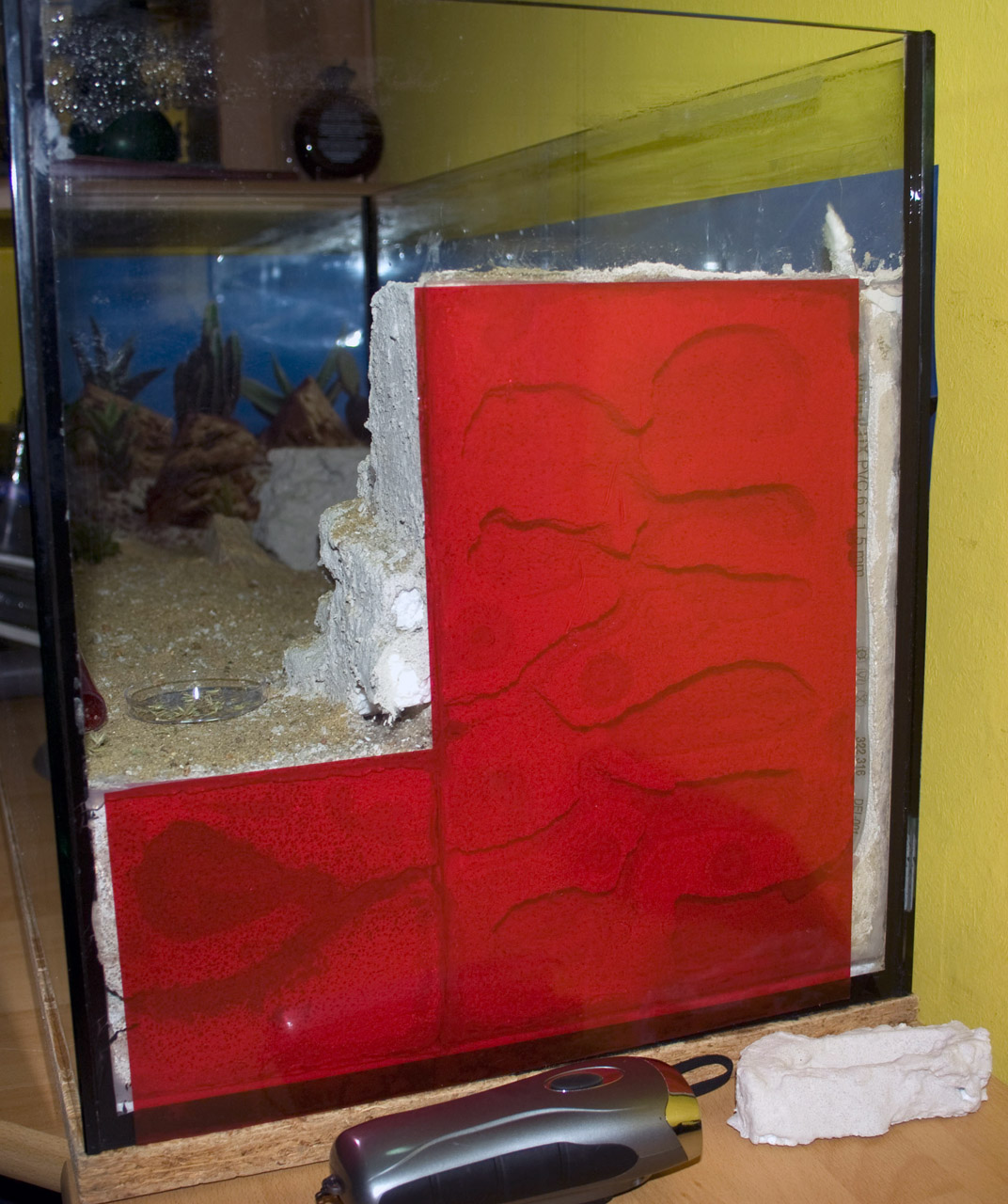 Ne Höhle vor das Loch ist eine gute Idee! Irgendwo hab ich im Forum auch eine stillgelegte Mine als Formikarium gefunden. Ich glaube, da bauch ich dort einen Mineneingang, am besten noch mit einer alten Eisenbahnschine, hin.