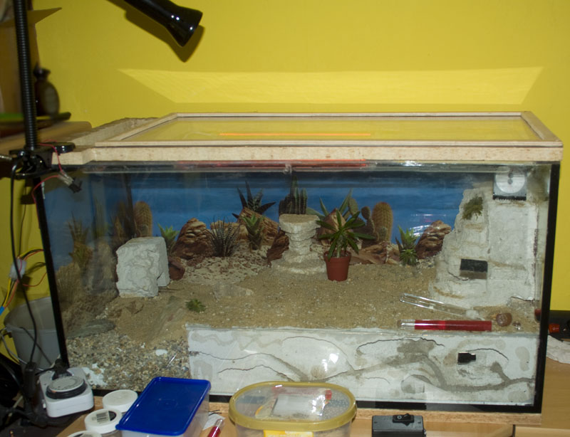 Was jetzt noch fehlt ist ein passender Deckel, der sich gerade noch im Bau befindet (Formi ist zz. nur mit Paraffinöl gesichert) und eine bessere Beleuchtung. Zurzeit habe ich nur meine Arbeitslampe, die leider nur ein hässliches weißes Licht produziert. Hat jemand einen Lampen- bzw. Leuchtmitteltipp für mich? Die Pflanzen sollen ja auch nicht eingehen ;)