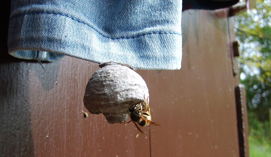 Vor Jahren schon hatte sich eine Wespenkönigin ausgerechnet den Zippel vom Reißverschluss derselben Hose ausgesucht, um daran ihr Nest aufzuhängen. Leider hatte ich damals keine Kamera dabei.