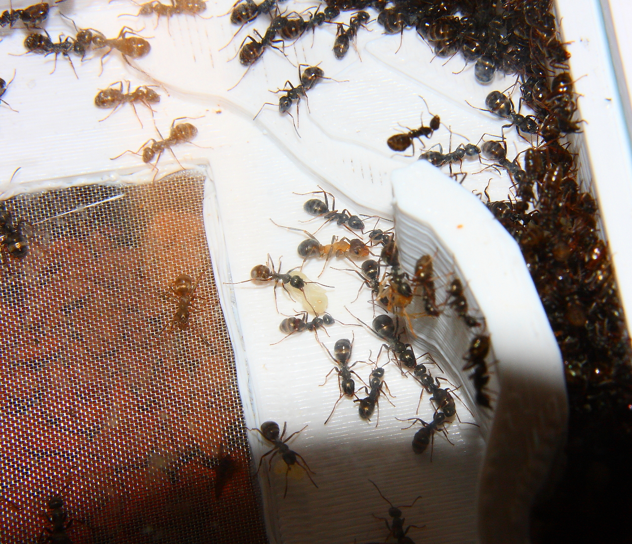 2.) Puppenraub: Eine Jungkönigin eignet sich Puppen aus einem Serviformica-Nest an, das bei einem Raubzug von R. sanguinea geplündert wurde,