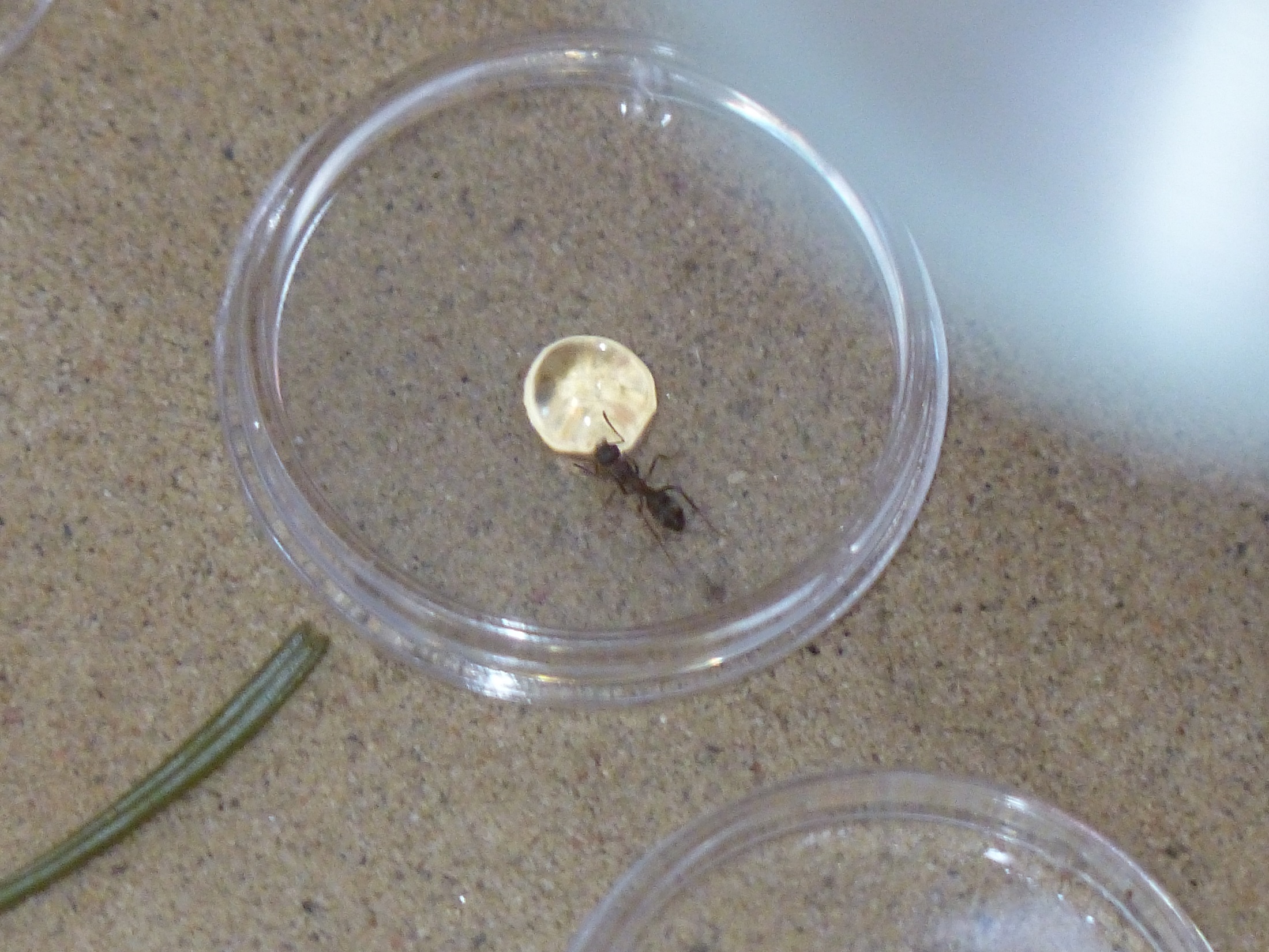 Die Arbeiterinnen graben dort jedenfalls mittlerweile zu 4 oder 5. Ein sehr großes Nest können sie dort aber nicht machen! Trotzdem hat sich schon ein staatlicher Hügel Sand vor dem Eingang gesammelt.