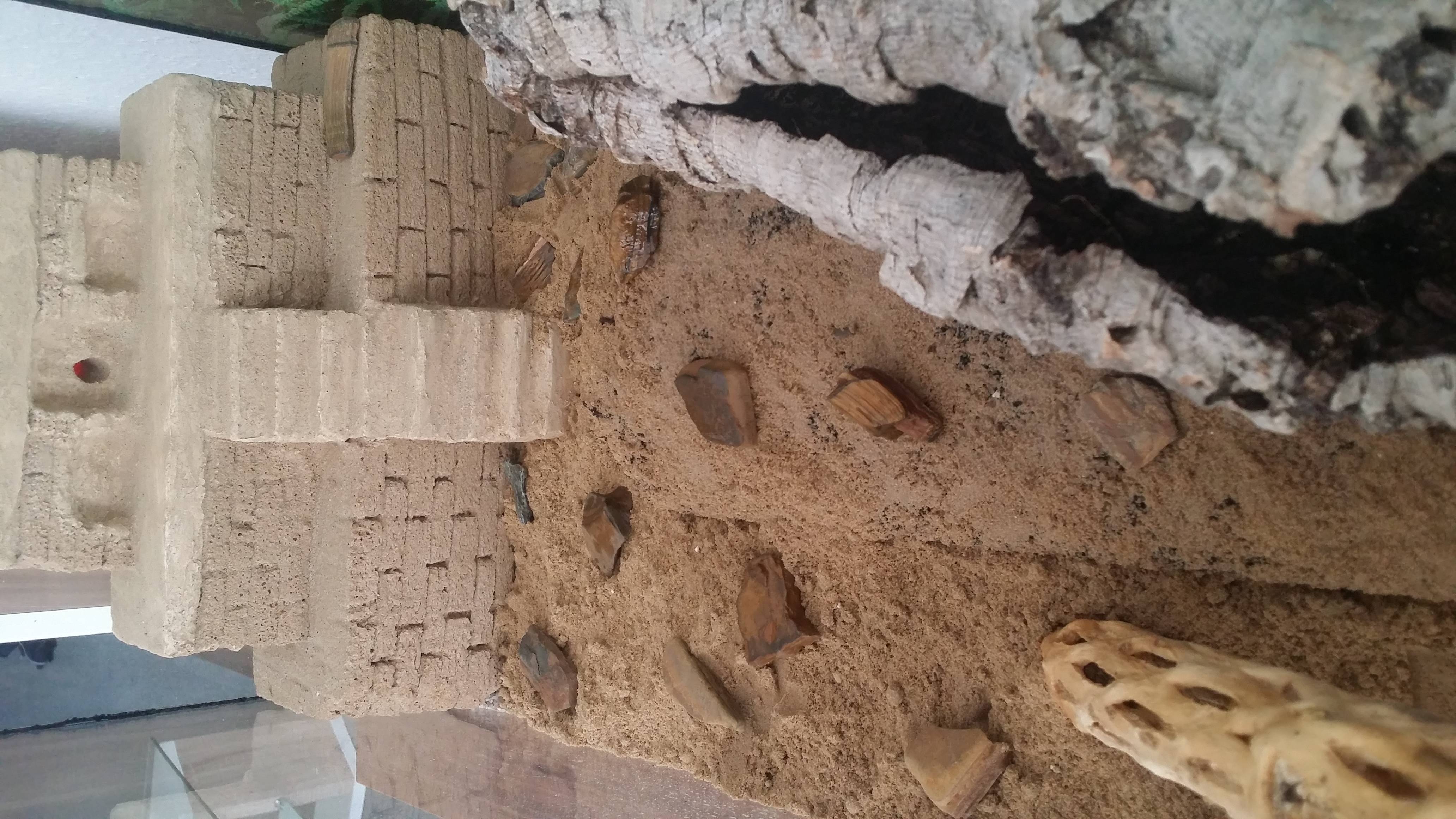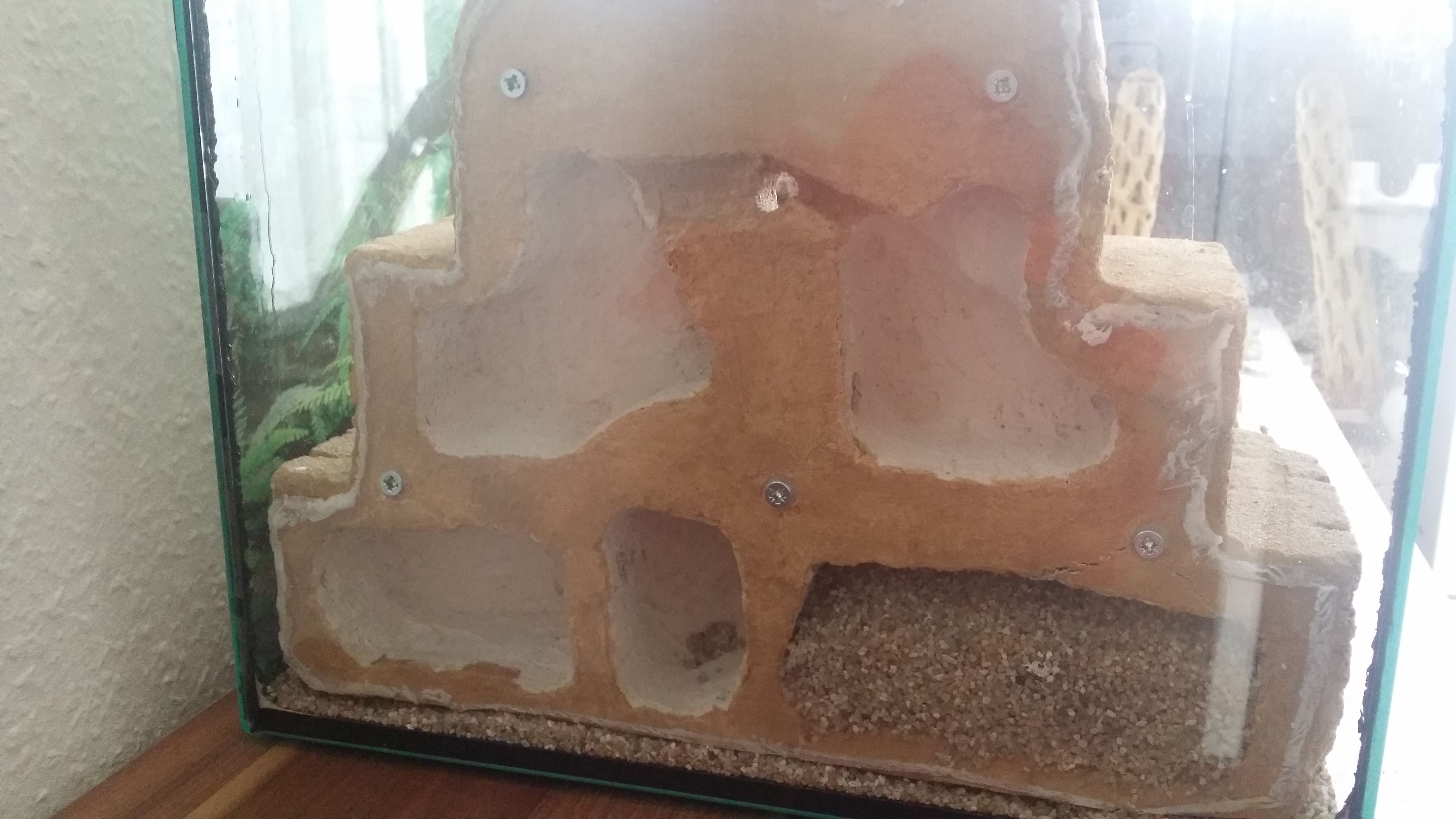 Das Nest (der Tempel) habe ich aus einem Ytong-Stein gebaut. Die Kammern wurden mit Gips ausgekleidet und von außen wurde es mit einer in Wasser (welches ich mit schwarzen Tee dunkler gemacht habe) gelösten Sand-Lehm Mischung bestrichen. Das Nest hat auch eine Kammer mit einem Schwamm und ein Zugang von außen für evt. Befeuchtung. Aber der Shop von denen ich die Ameisen habe meinte ich soll das Nest erstmal trocken lassen. Die letzte Kammer ist absichtlich verschüttet, damit diese erst freigeräumt werden muss um sie zu nutzen. Außerdem hat es mich interessiert ob sie sich dort vielleicht eingraben (was Pech für mich wäre).