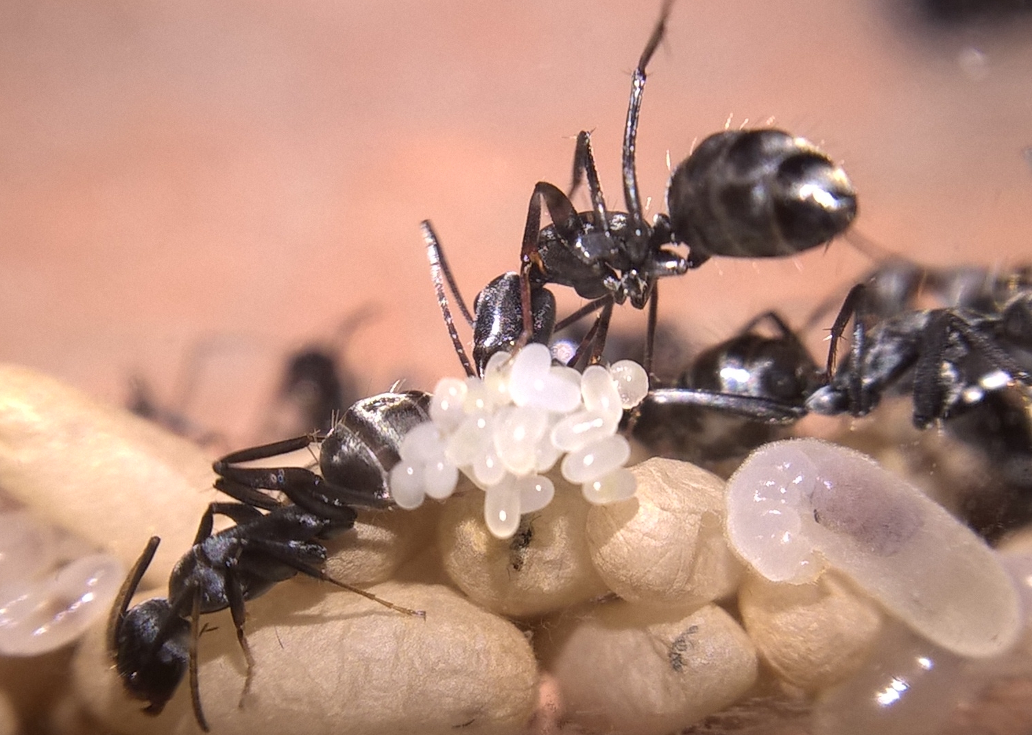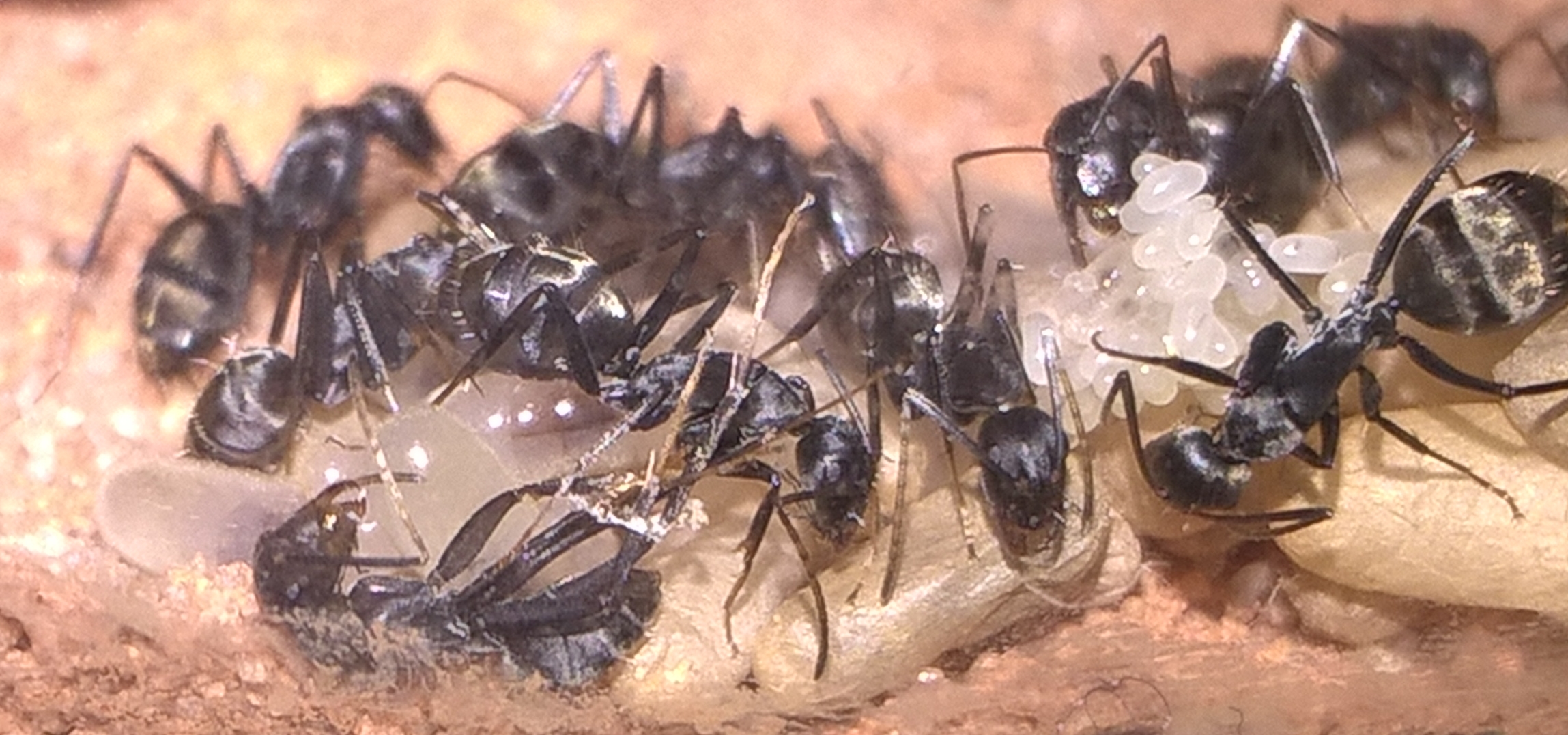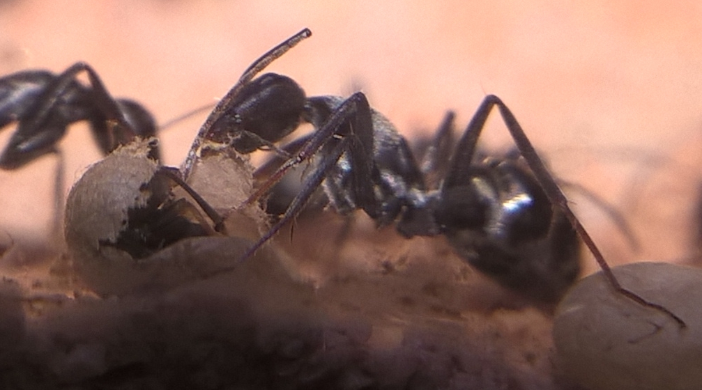 Weitere Beobachtungen: Ich konnte die Königin bei der Versorgung von Larven sehen, genauer gesagt beim FĂŒttern (wie ich vermute). Das Erscheinungsbild der Eipakete hat sich verĂ€ndert wodurch ich annehme, dass es sich dabei nun hauptsĂ€chlich um Minilarven handelt und nur noch wenige Eier vorhanden sind. Solange das Gipsnest bewohnt war, ging die AktivitĂ€t in der Arena merklich zurĂŒck, hauptsĂ€chlich PygmĂ€en und hin und wieder auch Minorarbeiterinnen waren dort aktiv (5-10 Tiere insgesamt). GroĂe begegneten mir in der Zeit dort nicht.