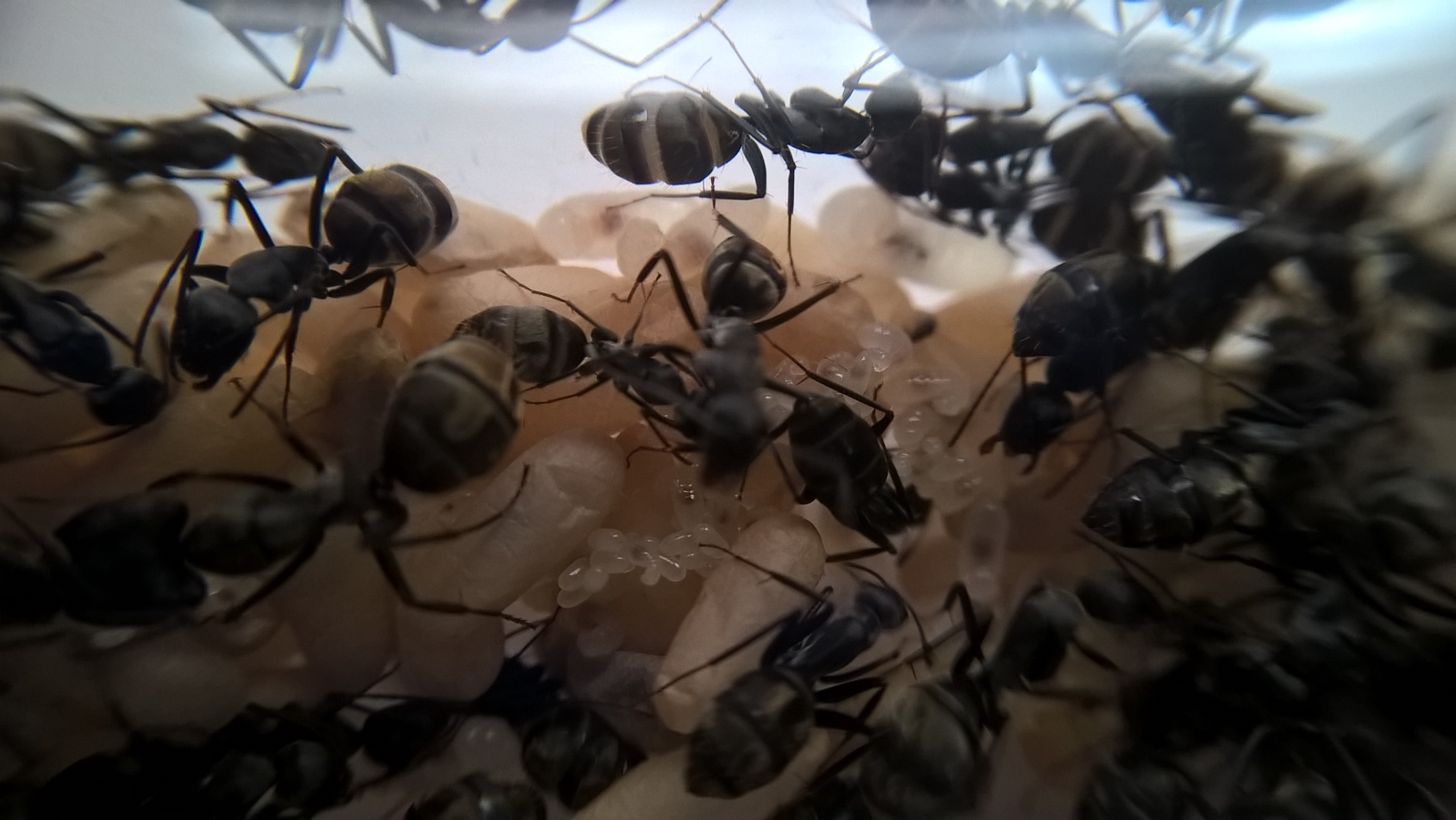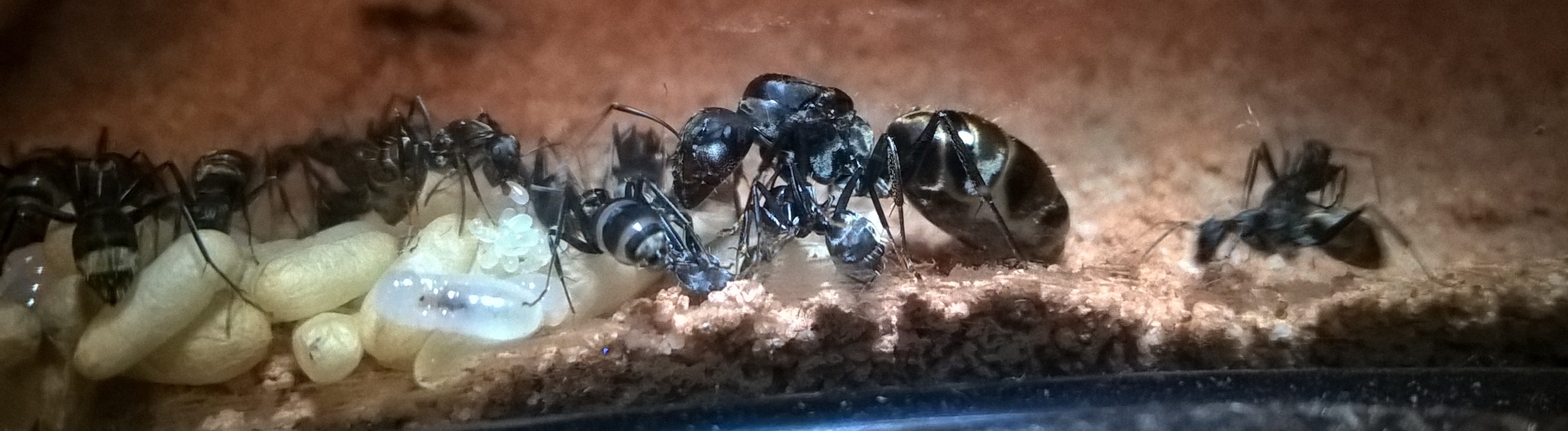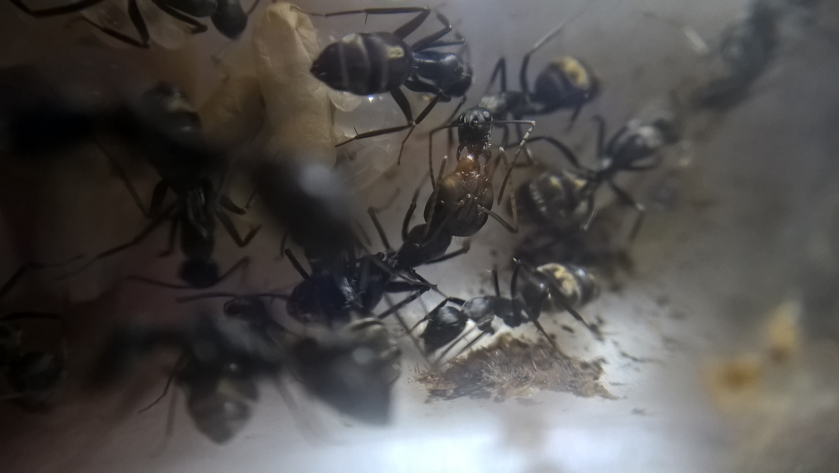 Was ergab die Nestkontrolle? Wie immer, einen groĂen Haufen mit Puppen in unterschiedlichen Entwicklungsstadien. Larven in allen möglichen GröĂen, selbst Minilarven und Eier habe ich diesmal sehen können. Ich bin der Meinung, dass es auch unter den groĂen Arbeitern GröĂenunterschiede gibt, sicher bin ich mir da allerdings nicht. Jedoch nehme ich schon an das die Arbeiter im allgemeinen noch gröĂer werden können, ist es doch bei Camponotus hĂ€ufig so, dass die groĂen Majorarbeiterinnen an die GröĂe der Königin herankommen können. (sofern ich hier nicht falsch informiert bin) Geschlechtstiere gibt es keine, wĂ€re aus meiner Sicht auch reichlich frĂŒh. Soll aber bei dieser Art schon vorgekommen sein. Die Gaster vieler Arbeiterinnen sind gut gefĂŒllt, bei manchen wirklich seeehr voll. Tut das nich weh?