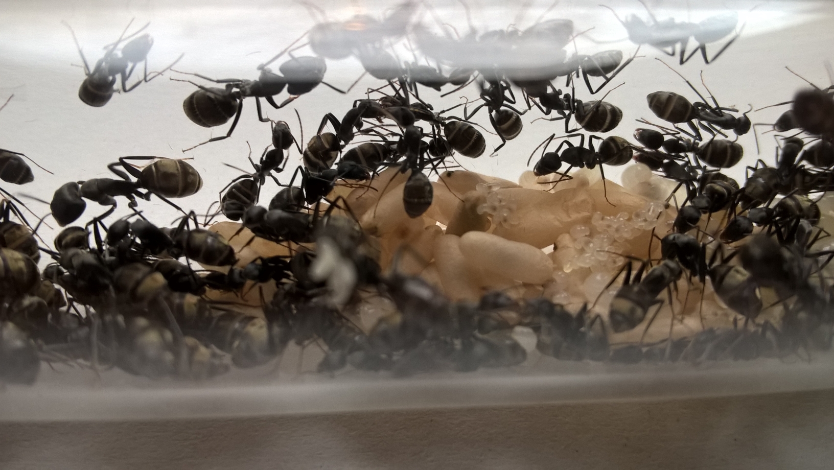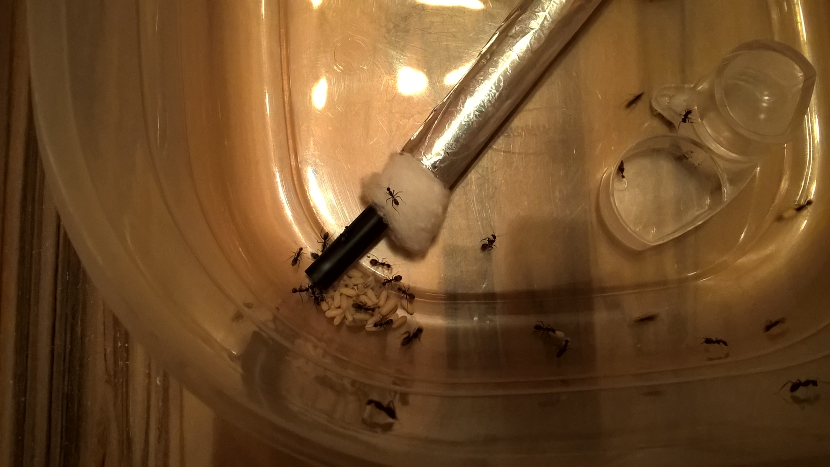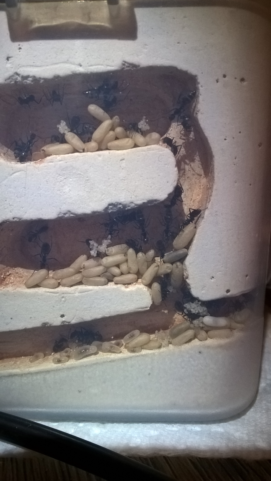 Wie geht es den Ameisen im provisorischen Lager? Soweit ich es beurteilen kann, geht es ihnen super. Obwohl ich ihnen derzeit keine WĂ€rmequelle anbiete und sie mit der Zimmertemperatur (~22°C) vorlieb nehmen mĂŒssen. Es gibt massig Eier und viele Puppen, gestern bei der FĂŒtterung konnte ich auch wieder eine groĂe Larve erkennen (Bild 2). Die Brut wird gern auĂerhalb des RGs gelagert, also genau vor dem Eingang, wie auf Bild 1 zu erkennen. Gestern hat es sich dort auch Frau Mama gemĂŒtlich gemacht. Zum Stand der Kolonie kann ich auch heute keine genauen Angaben liefern da mir der Einblick fehlt. Ich kann die Anzahl der Arbeiterinnen vermutlich nicht mal annĂ€hernd schĂ€tzen. Jedoch kann ich mit Sicherheit sagen, dass mehr als 100 Eier vorhanden sind. Denn diese wurden kĂŒrzlich so schön an der Wand der Box gelagert, dass ich sie anhand von Fotos zĂ€hlen konnte. Die Kolonie hat also einiges vor. Ich hoffe auf eine gute Nesteinsicht sobald die Kolonie umgezogen ist um dann wieder genauere Werte liefern zu können.