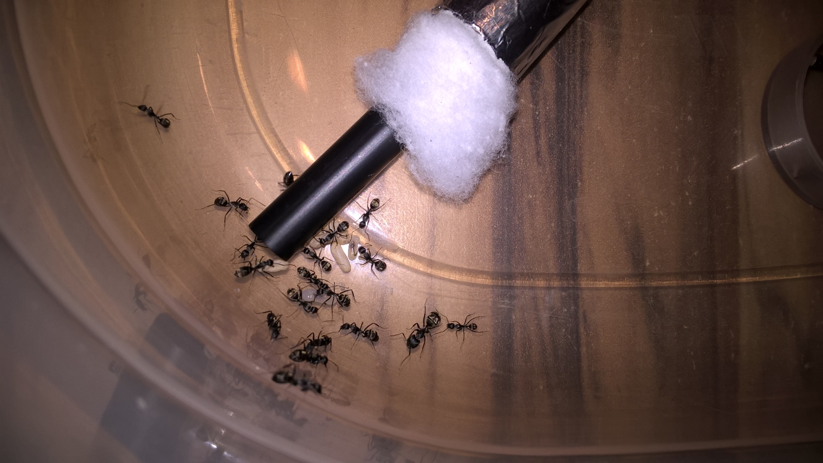 Und so habe ich den Umzug beobachtet: Gestern zum Nachmittag hin, habe ich nach meiner kleinen Rasselbande geschaut und festgestellt das irgendwie mehr los ist und irgendwie war der Ameisenpulk im RG kleiner als sonst. Ein blick in den Schlauch 4-5 Arbeiterinnen welche sowohl in die eine als auch in die andere Richtung unterwegs waren. Kurz darauf konnte ich sogar ein Ameisentaxi (eine Arbeiterin trĂ€gt eine Andere) in Richtung des neuen Nestes sehen. Vermutlich die Phase in der Arbeiterinnen zum neuen Nest gebracht werden um dieses zu beurteilen. Dies zog sich ĂŒber mehrere Stunden und ich habe entschieden die Heizfolie ausnahmsweise ĂŒber Nacht eingeschaltet zu lassen (im Halbstundentackt). Gegen Mitternacht war der Umzug dann beschlossene Sache und reges treiben im Schlauch. Den Umzug der Königin habe ich leider verpasst, dachte die wĂŒrde eher zum Ende mit umziehen aber nein, dies geschah etwa bei 50%. Bis 3 Uhr habe ich durchgehalten und immer mal wieder geschaut. Zu der Zeit waren nur noch wenige Arbeiterinnen und eine handvoll Larven im RG. Ich gehe davon aus, dass der Umzug um 4 Uhr abgeschlossen war.