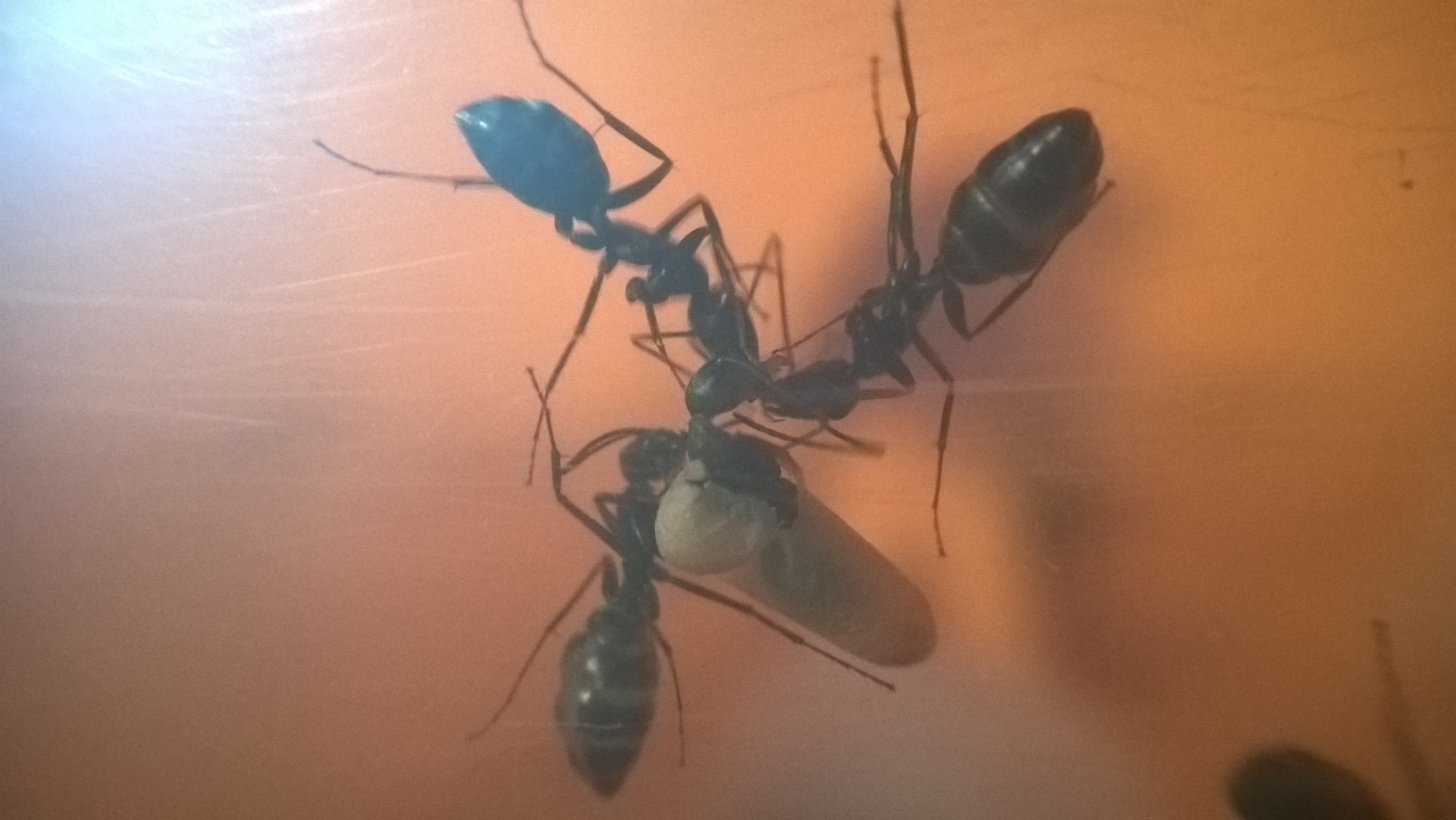 HĂ€tte ich mir ja denken können, dass die kleine Rasselbande nicht solange warten möchte wieder im Rampenlicht zu stehen. Heute 18.12.2016 ist wieder ein Heizkabeltag und ich hatte erstmals die Möglichkeit beim Schlupf einer Puppe zusehen zu können. Genau genommen wurden mindestens 3 Puppen ausgepackt und genau das zeigt auch das erste Bild. Entschlossen wird die PuppenhĂŒlle mit Hilfe der Mandibeln aufgeschnitten und entfernt - anschlieĂend und wĂ€hrenddessen wird die neue Arbeiterin ausgiebig geputzt und von der Puppenhaut befreit. Auf dem zweiten Bild liegt eine der neuen Arbeiterinnen auf dem RĂŒcken und ist noch nicht vollstĂ€ndig von der Puppenhaut befreit, ohne Hilfe wĂŒrde sie so wohl nie laufen können aber ihre Schwestern werden das sicherlich noch erledigen.