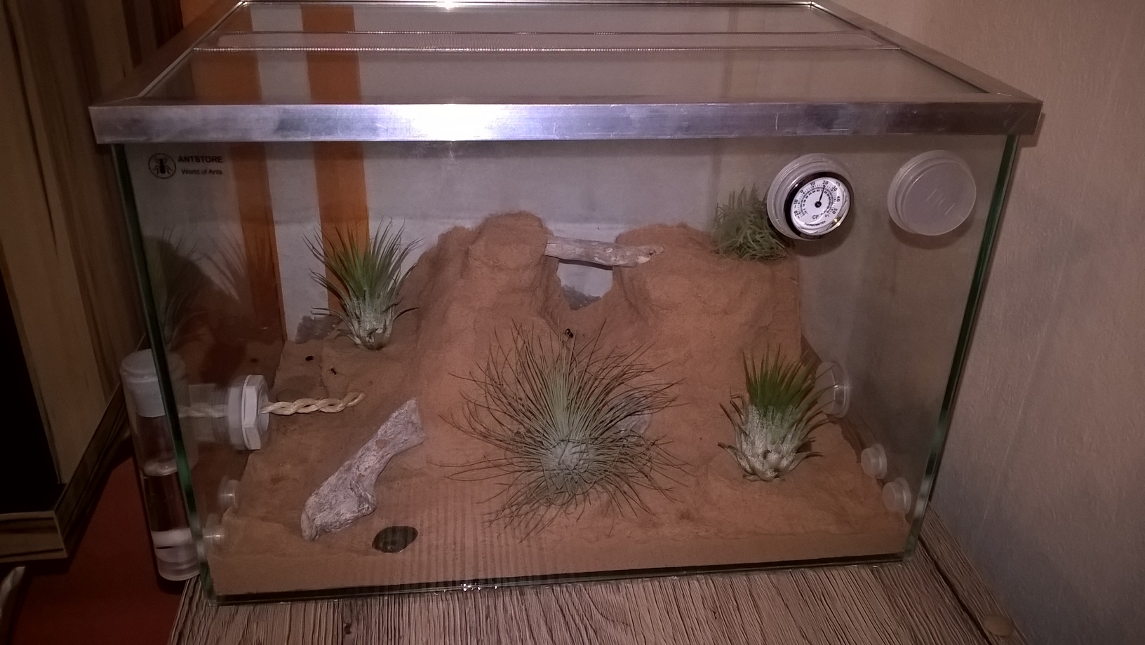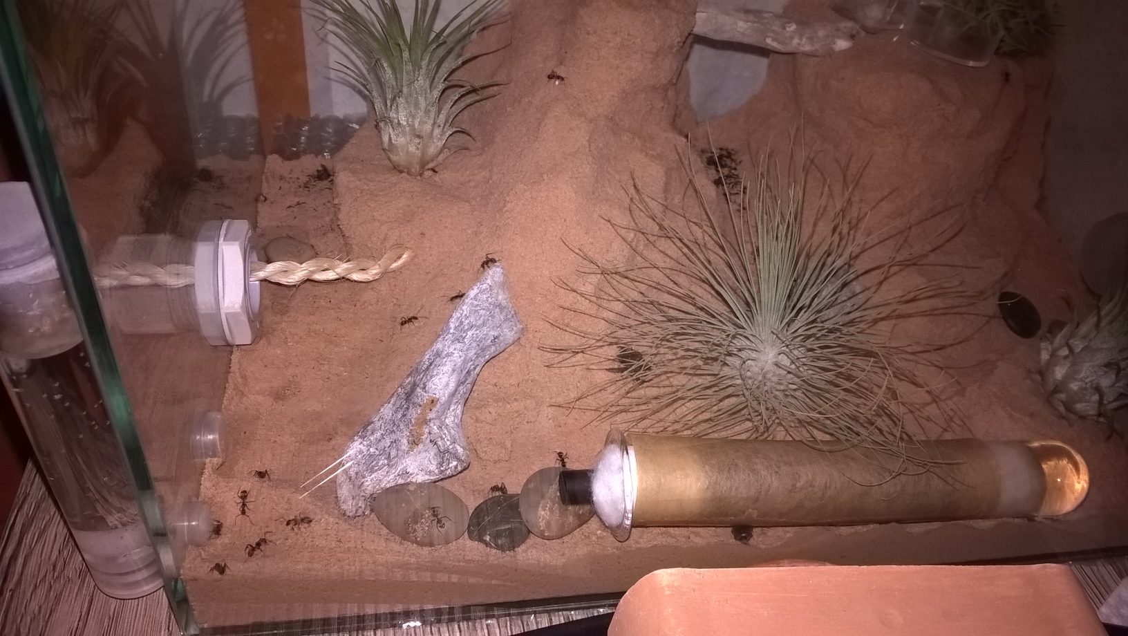 Arenabau: Bild 2 zeigt die neue Arena, im Prinzip wurde diese der ersten Arena nachempfunden und auch mit einem Sand-Lehm-Gemisch gestaltet. Dazu Sand, Lehm und etwas Wasser so vermengen, dass eine homogene Masse entsteht, welche leicht Formbar ist jedoch nicht verlÀuft. Ein Freund von uns hat dabei sein gestalterisches Talent mal wieder voll ausgelebt. Ein paar Eyecatcher in Form von Steinen, kleinen Dekohölzern und den extra bestellten Tillandsien runden die Minilandschaft sehr gut ab, wie ich finde. Den Faden, welcher durch den Schlauch lÀuft und den Ameisen als Kletterhilfe dienen soll haben wir in einem der "Berge" verankert - nachdem das Gemisch trocken war sitzt dieser Bombenfest.