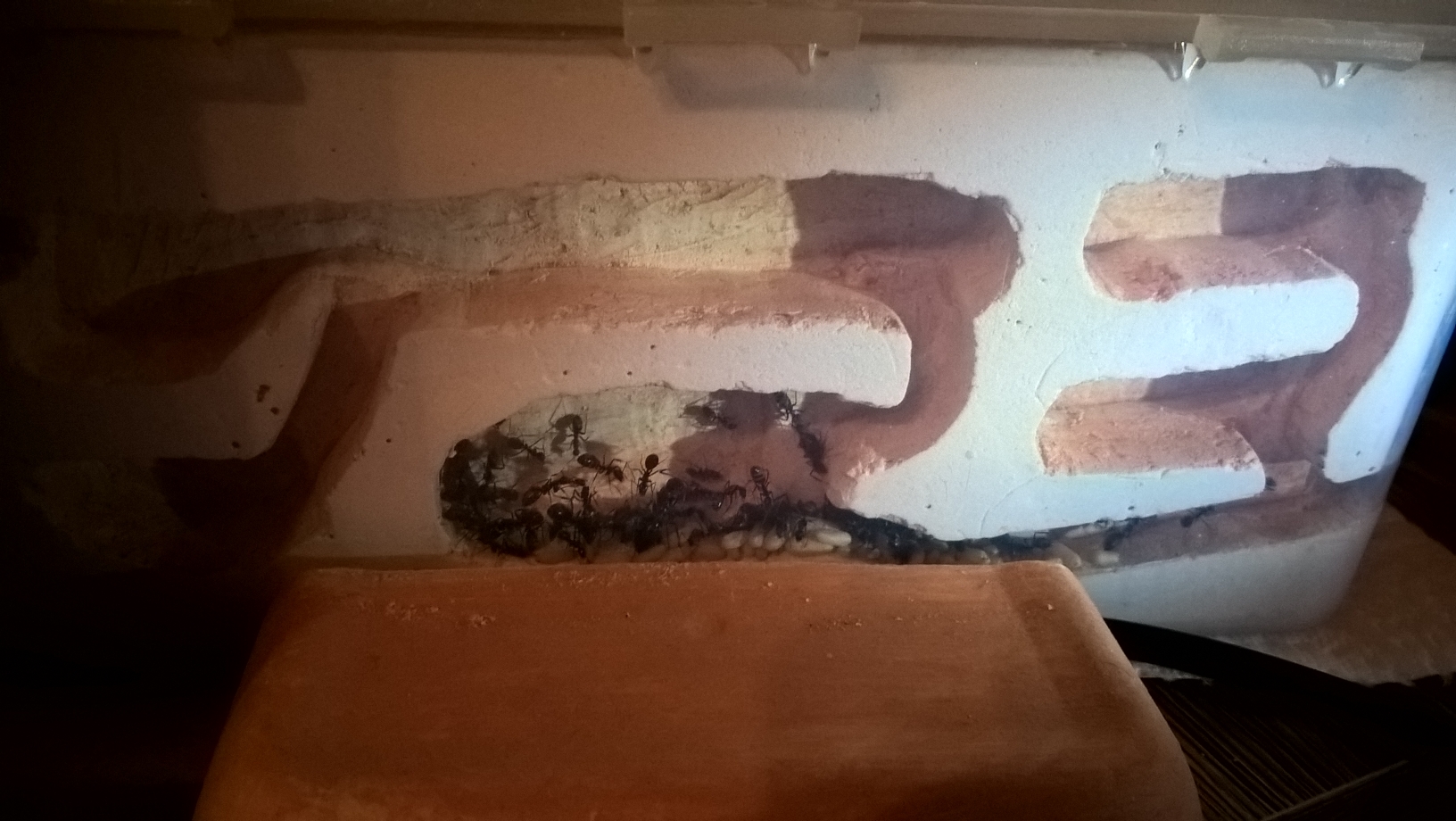 Beim letzten besprĂŒhen der Arena vor 1 oder 2 Tagen hat die Wassertankgang umgehend angefangen in der Ecke zu buddeln, weit gekommen sind sie aber nicht bis das Sandlehmgemisch wieder trocken war. (ca 3-5mm) Dies bestĂ€tigt mich in der Annahme, dass es im RG langsam etwas eng wird. Auch wenn oft gesagt wird, dass sich Ameisen gut stapeln können, kommt es mir so vor als ob hier langsam ein Punkt erreicht ist an dem mehr Platz benötigt wird. Also MĂ€dels, ich hab da mal was vorbereitet...