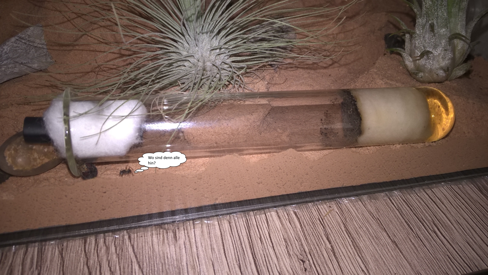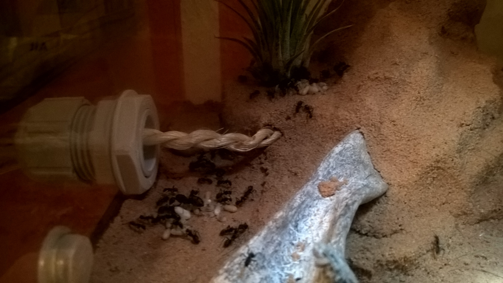 Wer genau hingeschaut hat, hat es bereits auf dem ersten Bild erahnen können. Die Kolonie bewohnt das Gipsnest nicht mehr. Keine lust auf liebevoll eingerichtetes Kellergeschoss, nein! Meine Kleinen wollen das Penthouse und sind Kurzerhand vor 2 Tagen wieder in die Arena gezogen. Dort Leben sie nun Teilweise im Schlauchanschluss und ansonsten unter der Palme und lassen es sich gut gehen. Den Wasserspender haben sie auch zum Auslaufen gebracht, man erkennt die VerfĂ€rbung des Bodens (Bild 1). Nun gut dadurch erspare ich mir fĂŒr ne weile das besprĂŒhen der Pflanzen . Gebuddelt wird an der feuchten Stelle nicht und auch "bewohnen" sie einen trockenen Teil der Arena. Ich halte es fĂŒr Zufall das beide Ereignisse (Wasserspender und Umzug) so Zeitnah passierten, aber wer kann das schon mit Sicherheit sagen.