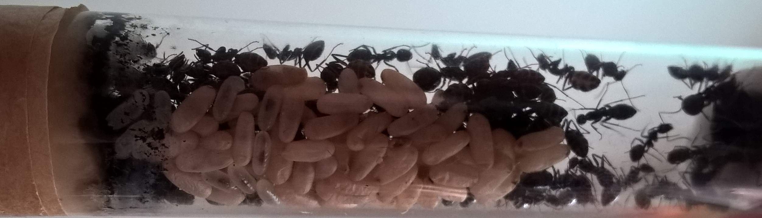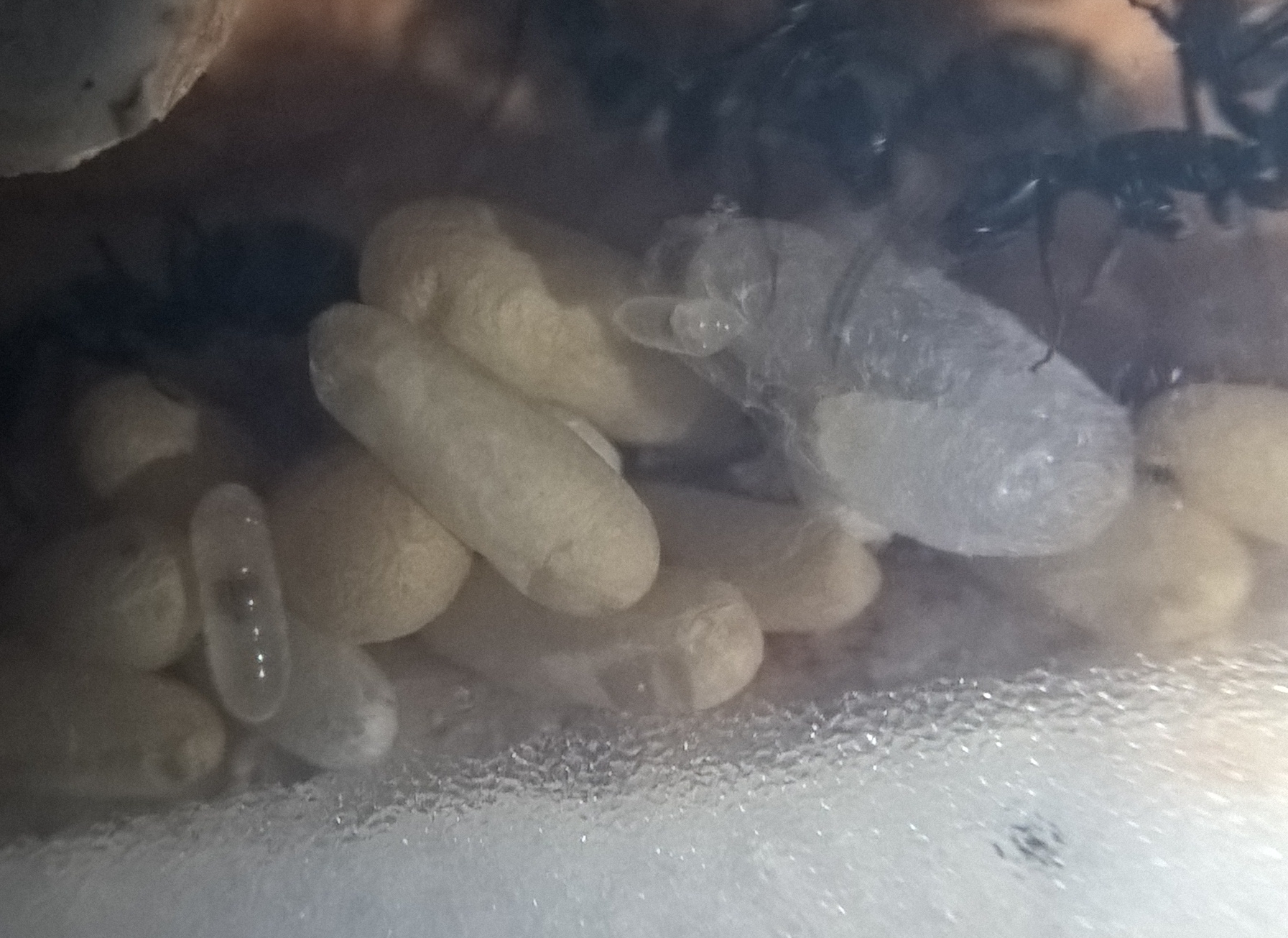 Was gibt es sonst noch zu berichten? Es gibt sehr viele Puppen und einige Larven, die Eier scheinen sie gut vor mir zu verbergen. Die KoloniegröĂe kann ich nur schĂ€tzen und liege damit vermutlich um einiges daneben, aber ich behaupte einfach mal es handelt sich um ~150 Arbeiterinnen, mindestens 50 Puppen und 10-20 groĂe Larven. Kleine Larven und Eier sind, glaube ich, vorhanden aber ich wage nicht da eine Zahl zu nennen.