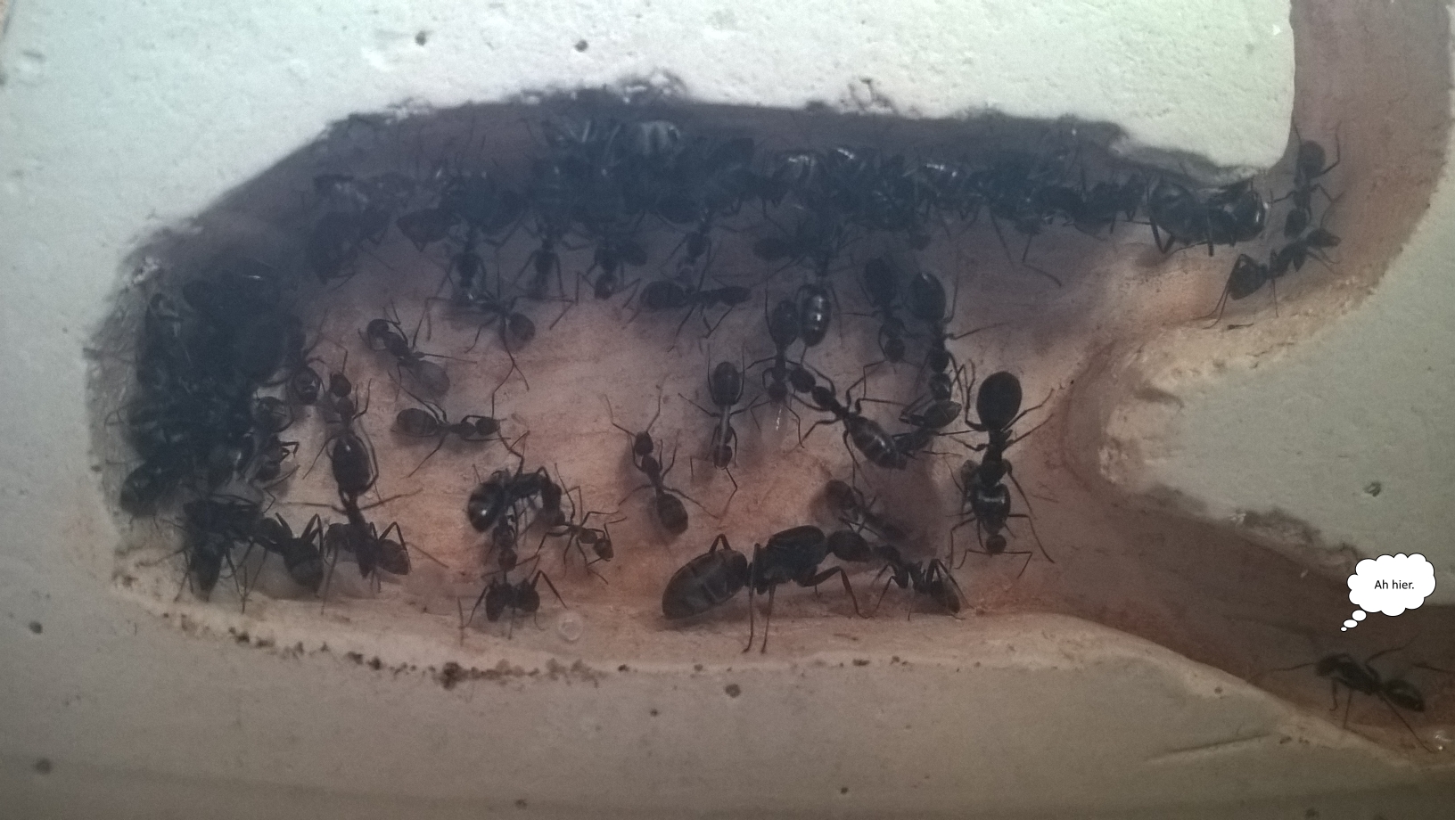 Auf dem dritten Bild seht ihr die Kolonie wo sie nun "wohnt", die Königin ist auch zu erkennen. Ihr Gaster ist inzwischen nich mehr geschwollen. Dem entnehme ich, dass sie nun eine Pause einlegt vom Eierlegen. Ich hoffe es liegt nur an der Temperatur, sprich die Kleinen machen "Winterpause" (eher Diapause) was von mir ja auch so angestrebt war. Demnach möchte ich eigentlich erst in ~ 2 Monaten wieder beheizen. Allerdings werde ich wohl demnĂ€chst vorab das Nest um zumindest einige Grad erwĂ€rmen damit die Kolonie dort wieder einzieht und einen ruhigen Nestbereich hat. Ich denke da an ca 23-24°C wodurch die Temperatur definitiv höher ist als in der darĂŒber liegenden Arena, aber hoffentlich nicht so hoch, dass die Diapause beendet wird. Ob und wie mir dies gelingt wird sich dann zeigen.