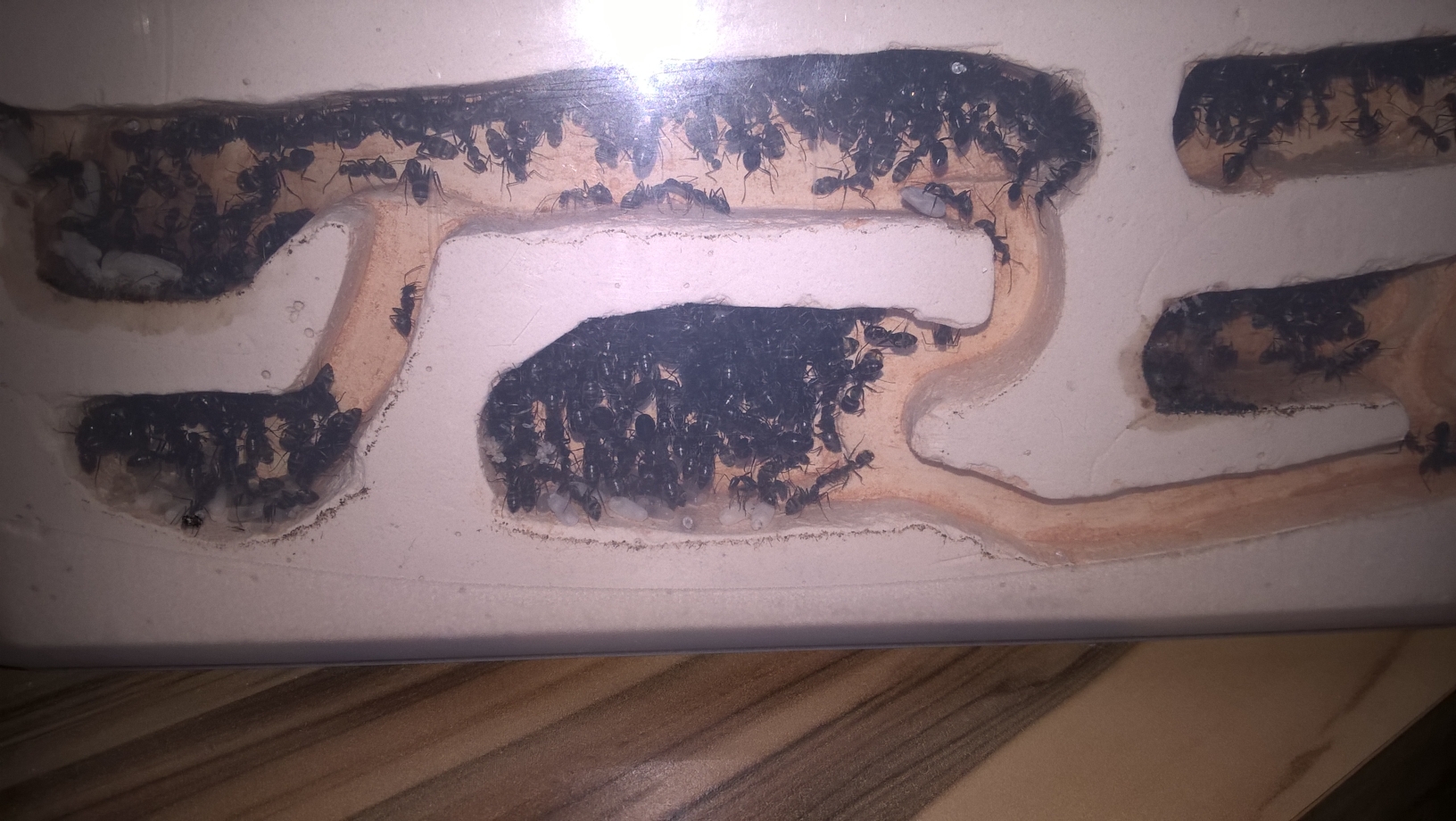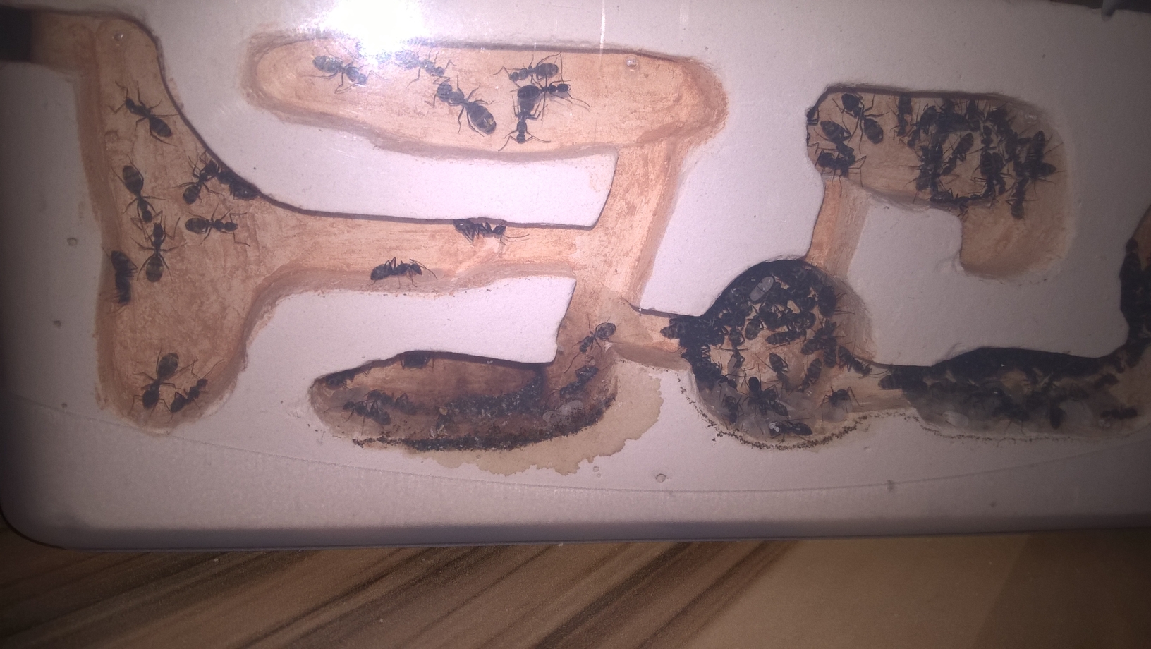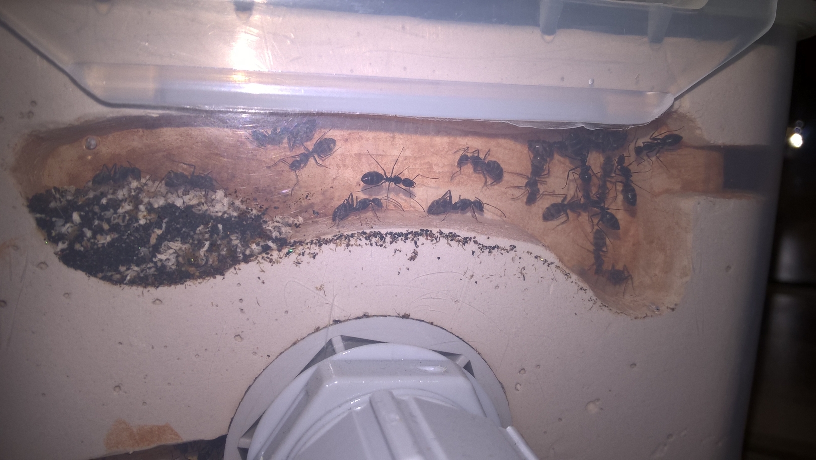 Wie man sieht ist sie inzwischen schon sehr vertrocknet, sie war dennoch gut besucht (2-5 Arbeiterinnen). Ich habe die Scheibe dann nochmal mit etwas Wasser besprĂŒht und die AktivitĂ€t hat sich nahezu verdreifacht es sind nun mehr als 10 Ameisen an der Kartoffelscheibe zu gange.