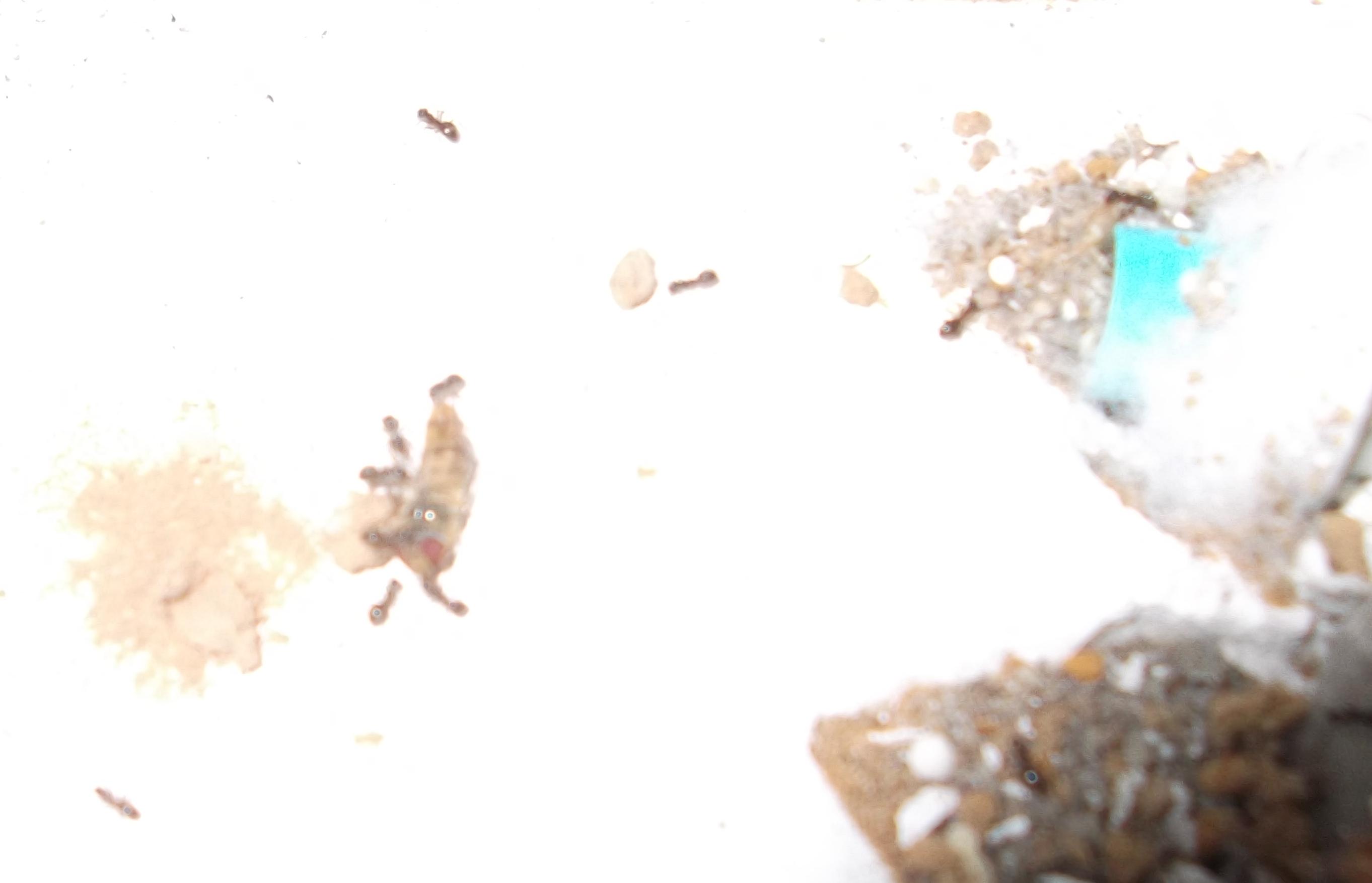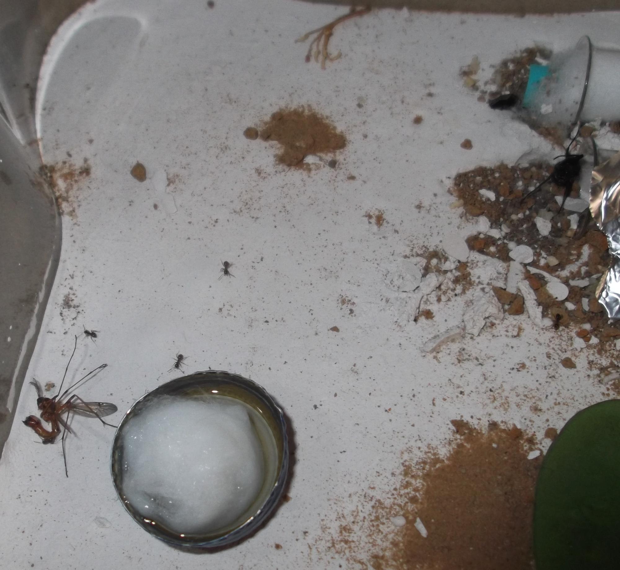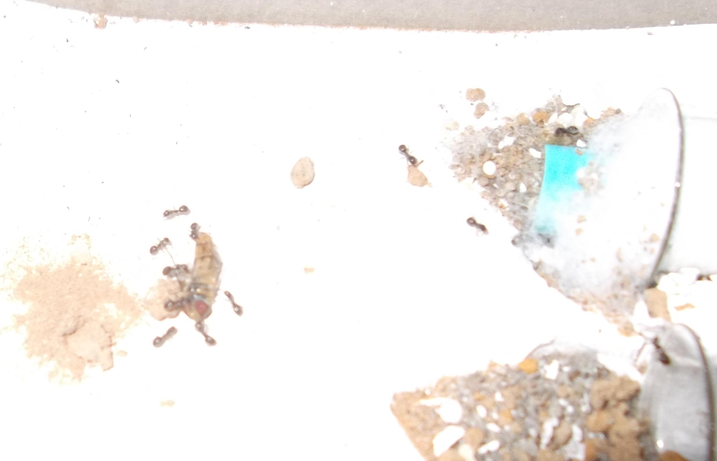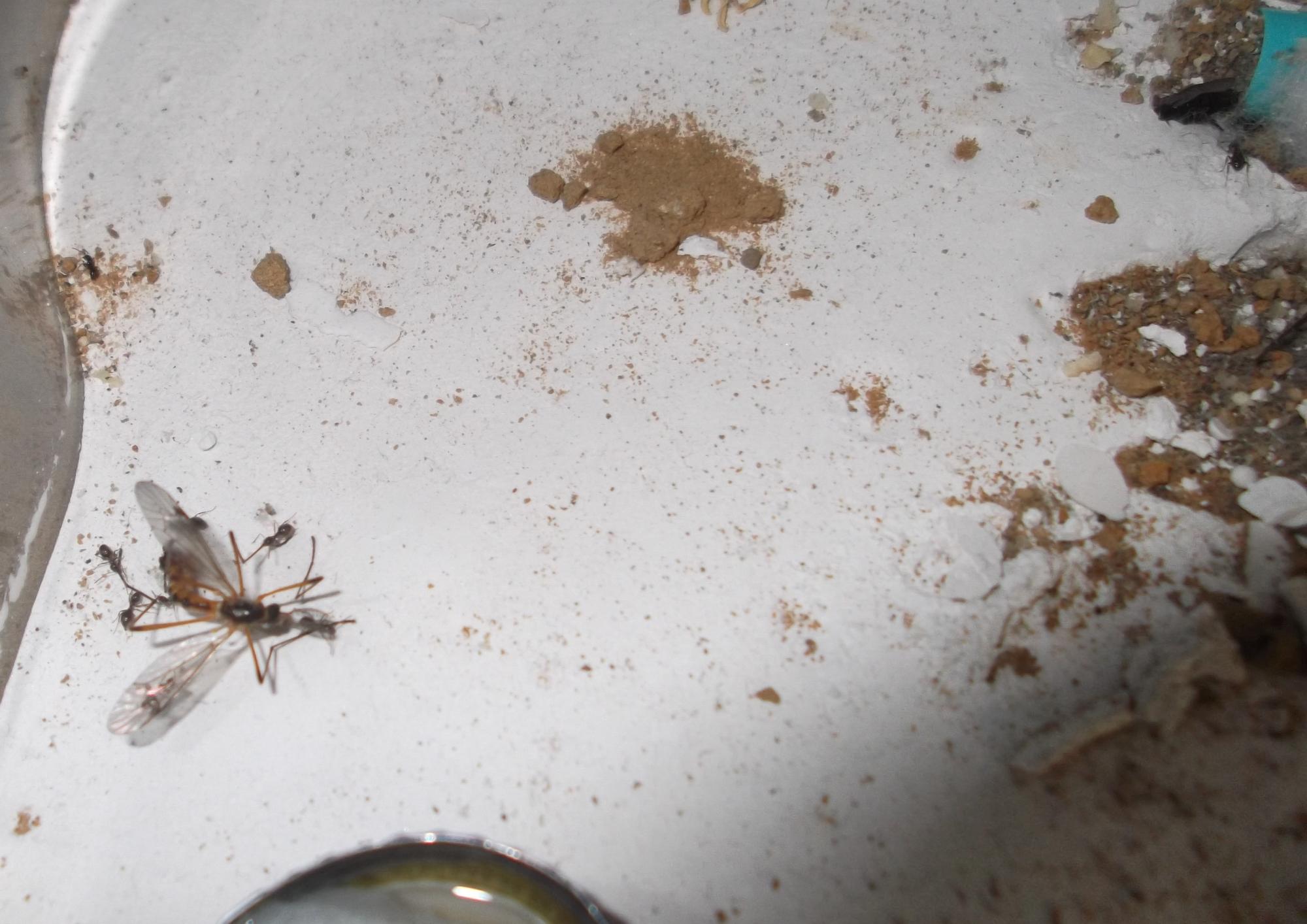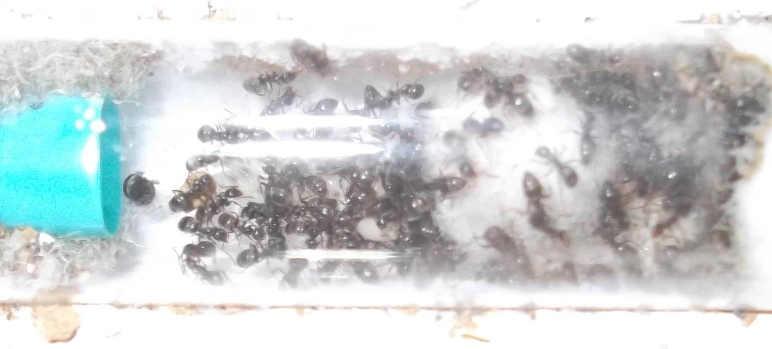 Und noch eine Paradigmenwechsel herbeiführende Beobachtung: bisher hatte ich immer angenommen, daß ein Strohhalm als Nestzugang die Ameisen nicht völlig zufrieden stellt, weil sie es oftmals nicht schaffen ein Futtertier hindurch ins Nest zu schleppen, sodaß es nur so weit es geht in den Eingang gestopft oder am Eingang abgelegt wird. In der Natur könnten sie den Eingang wahrscheinlich nach Bedarf vergrößern und wieder verkleinern. Nun aber in dieser Saison leben sie notgedrungen in einem ganz offenen Reagenzglas, sodaß die Öffnung für allerlei leckere Kadaver mehr als groß genug ist, und trotzdem werden die Futtertiere nicht ganz ins Glas transportiert, sondern am Eingang abgelegt.
