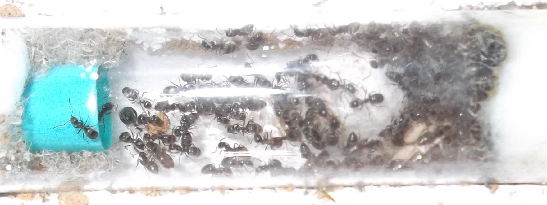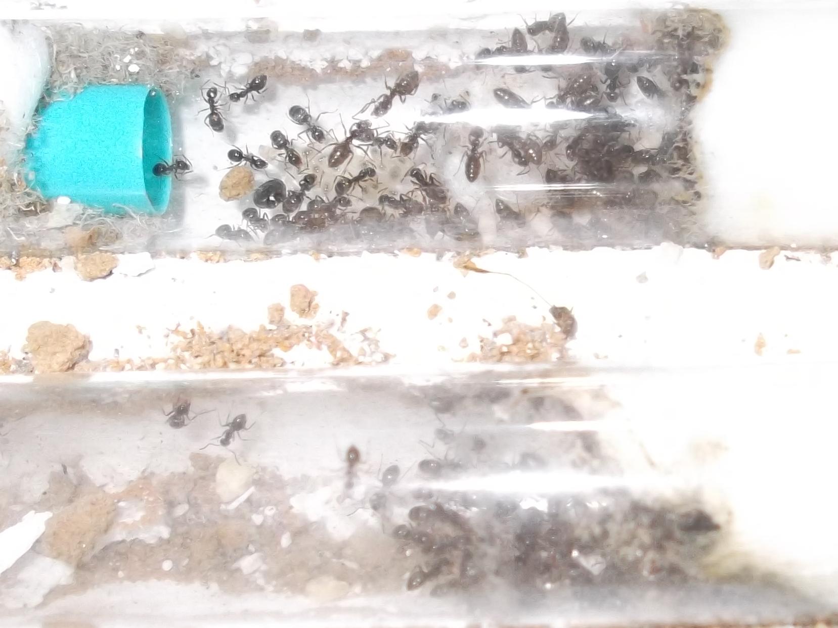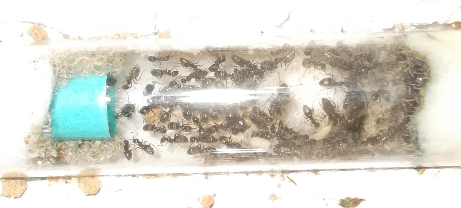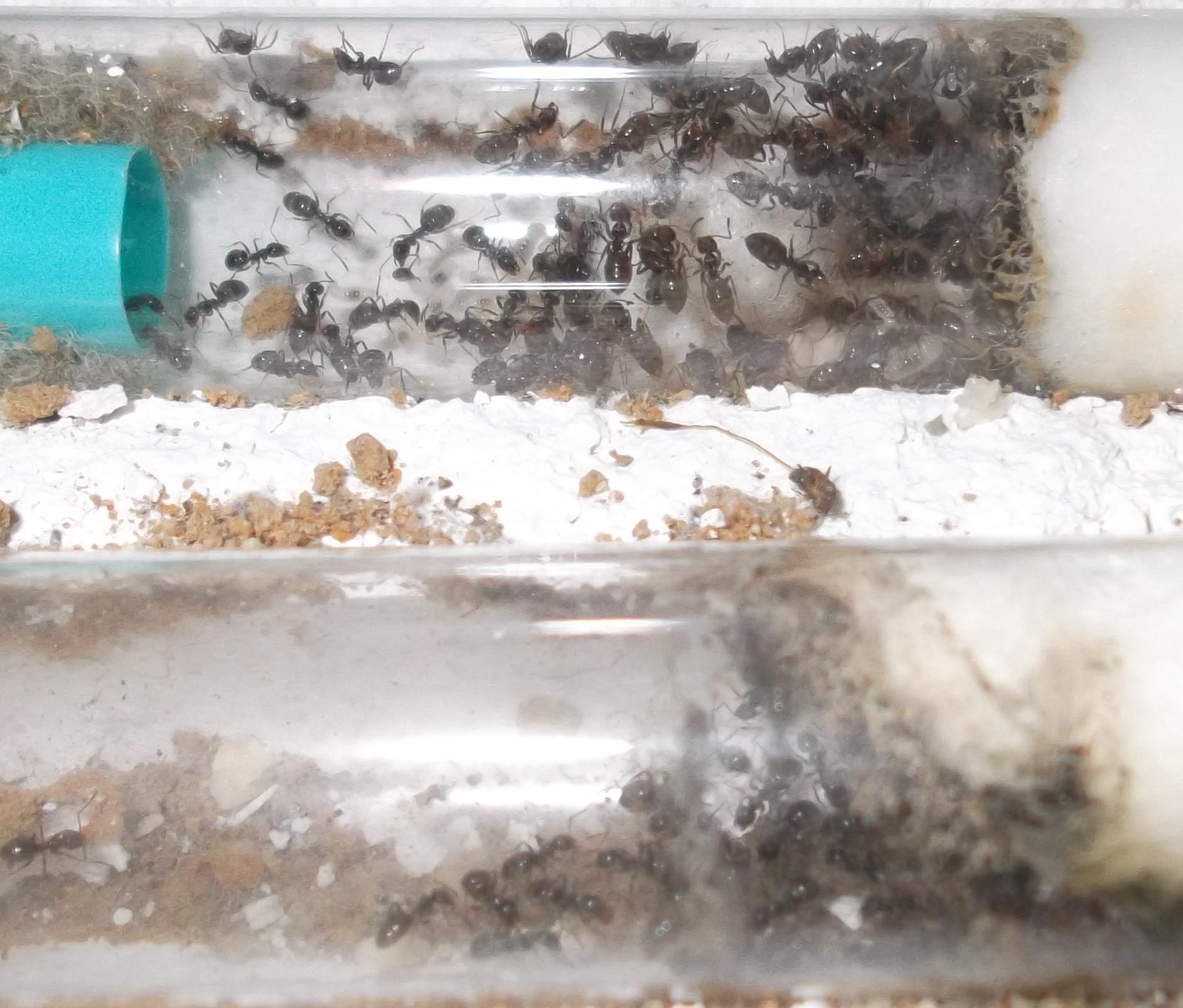 Und noch eine Paradigmenwechsel herbeiführende Beobachtung: bisher hatte ich immer angenommen, daß ein Strohhalm als Nestzugang die Ameisen nicht völlig zufrieden stellt, weil sie es oftmals nicht schaffen ein Futtertier hindurch ins Nest zu schleppen, sodaß es nur so weit es geht in den Eingang gestopft oder am Eingang abgelegt wird. In der Natur könnten sie den Eingang wahrscheinlich nach Bedarf vergrößern und wieder verkleinern. Nun aber in dieser Saison leben sie notgedrungen in einem ganz offenen Reagenzglas, sodaß die Öffnung für allerlei leckere Kadaver mehr als groß genug ist, und trotzdem werden die Futtertiere nicht ganz ins Glas transportiert, sondern am Eingang abgelegt.