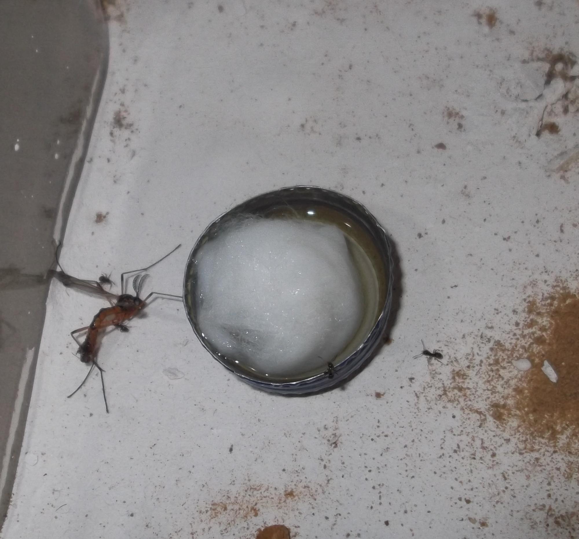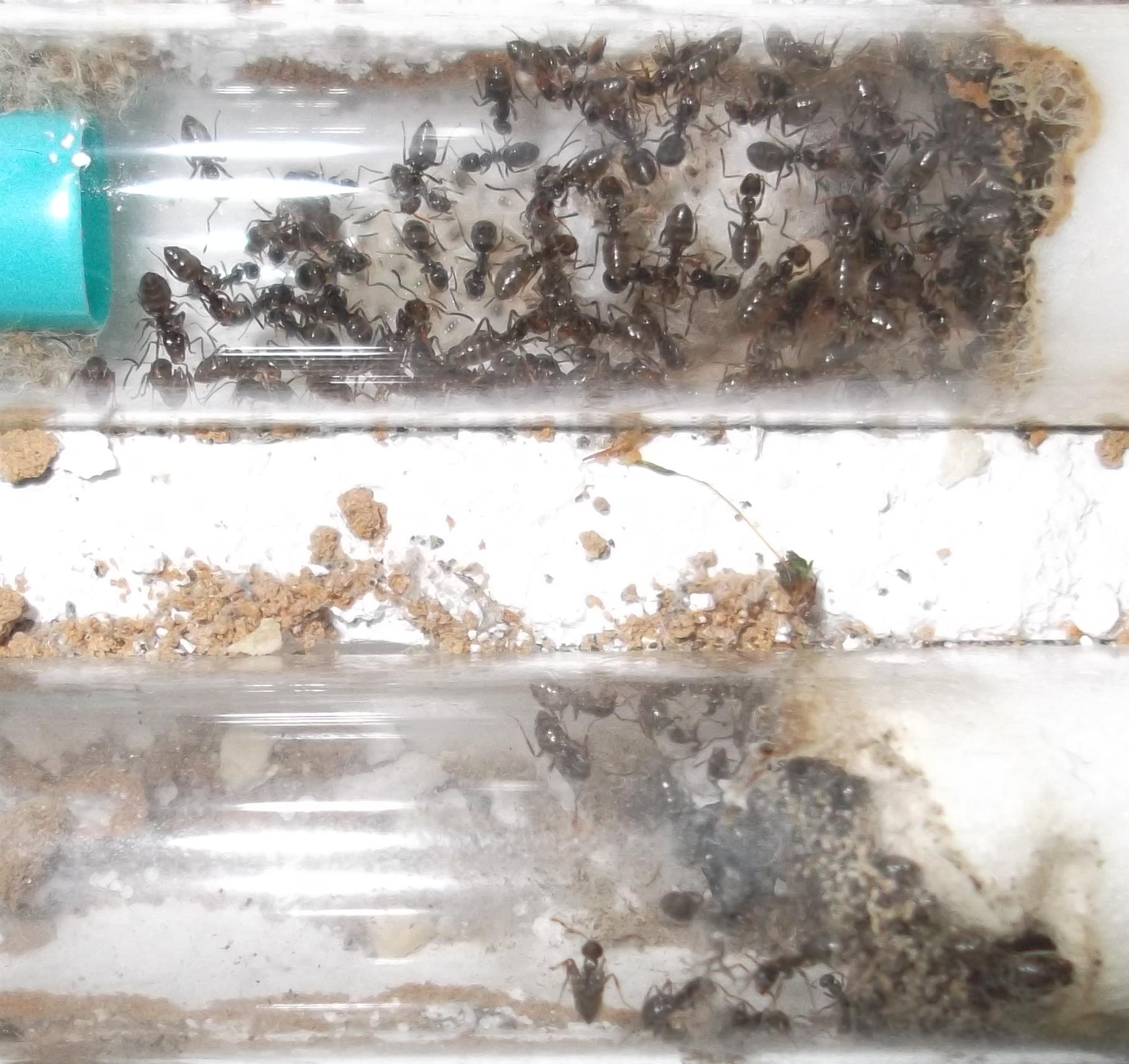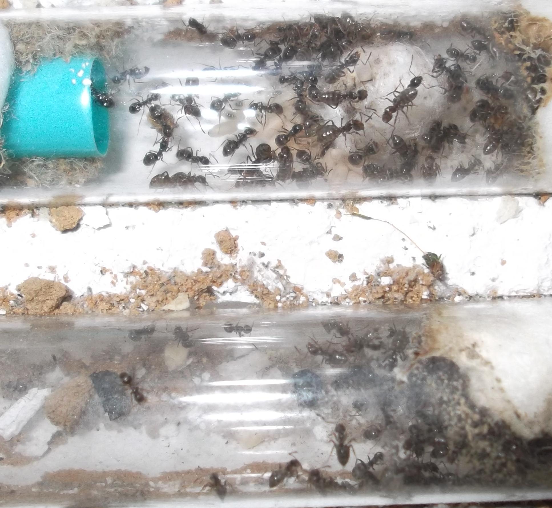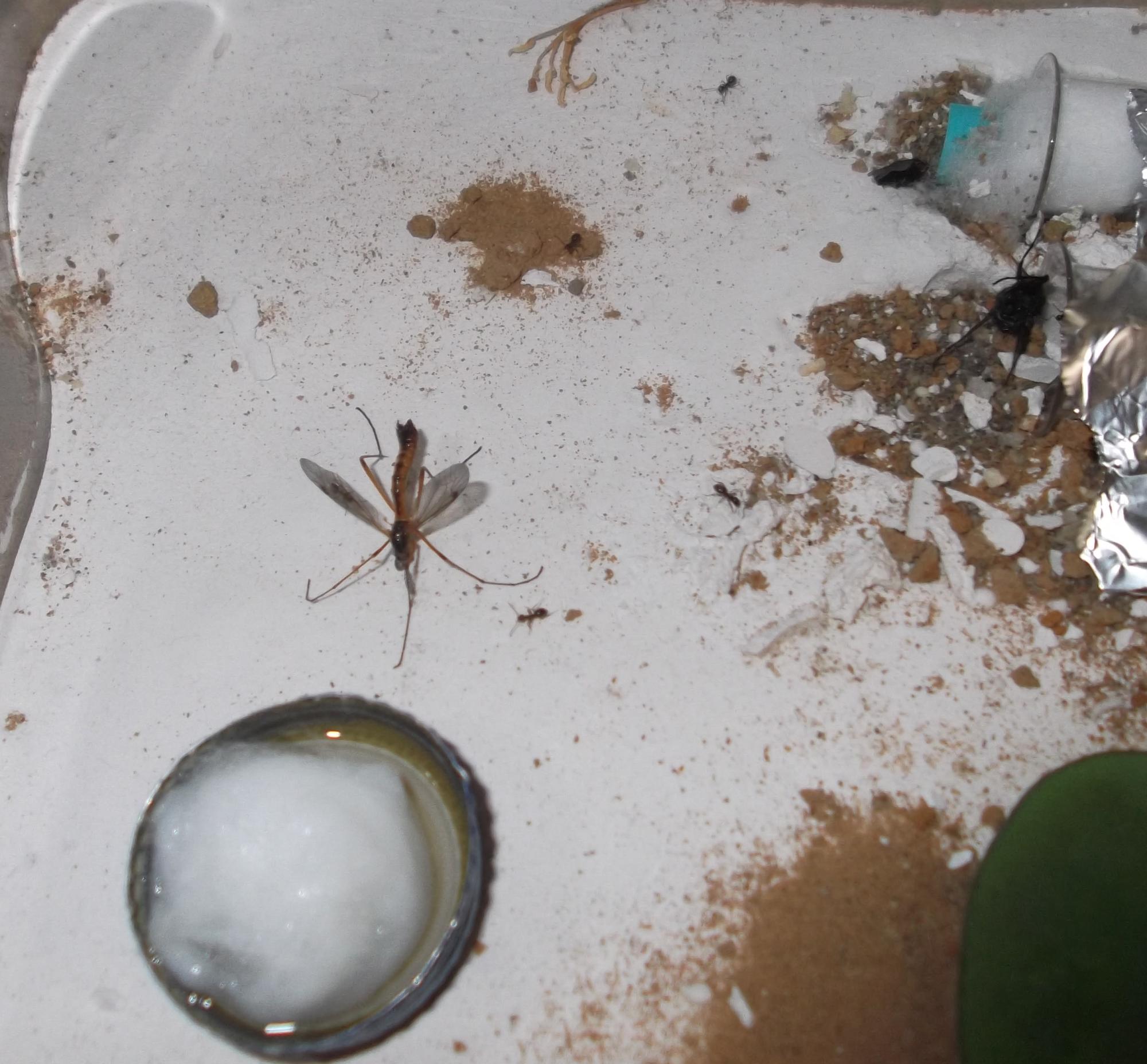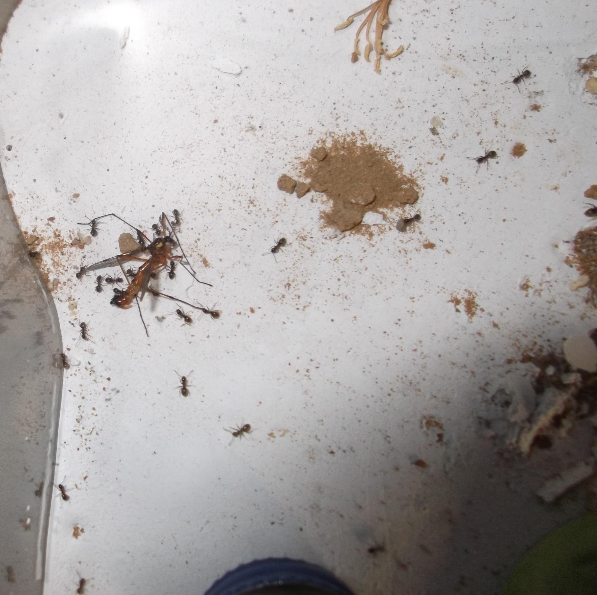Und noch eine Paradigmenwechsel herbeiführende Beobachtung: bisher hatte ich immer angenommen, daß ein Strohhalm als Nestzugang die Ameisen nicht völlig zufrieden stellt, weil sie es oftmals nicht schaffen ein Futtertier hindurch ins Nest zu schleppen, sodaß es nur so weit es geht in den Eingang gestopft oder am Eingang abgelegt wird. In der Natur könnten sie den Eingang wahrscheinlich nach Bedarf vergrößern und wieder verkleinern. Nun aber in dieser Saison leben sie notgedrungen in einem ganz offenen Reagenzglas, sodaß die Öffnung für allerlei leckere Kadaver mehr als groß genug ist, und trotzdem werden die Futtertiere nicht ganz ins Glas transportiert, sondern am Eingang abgelegt.