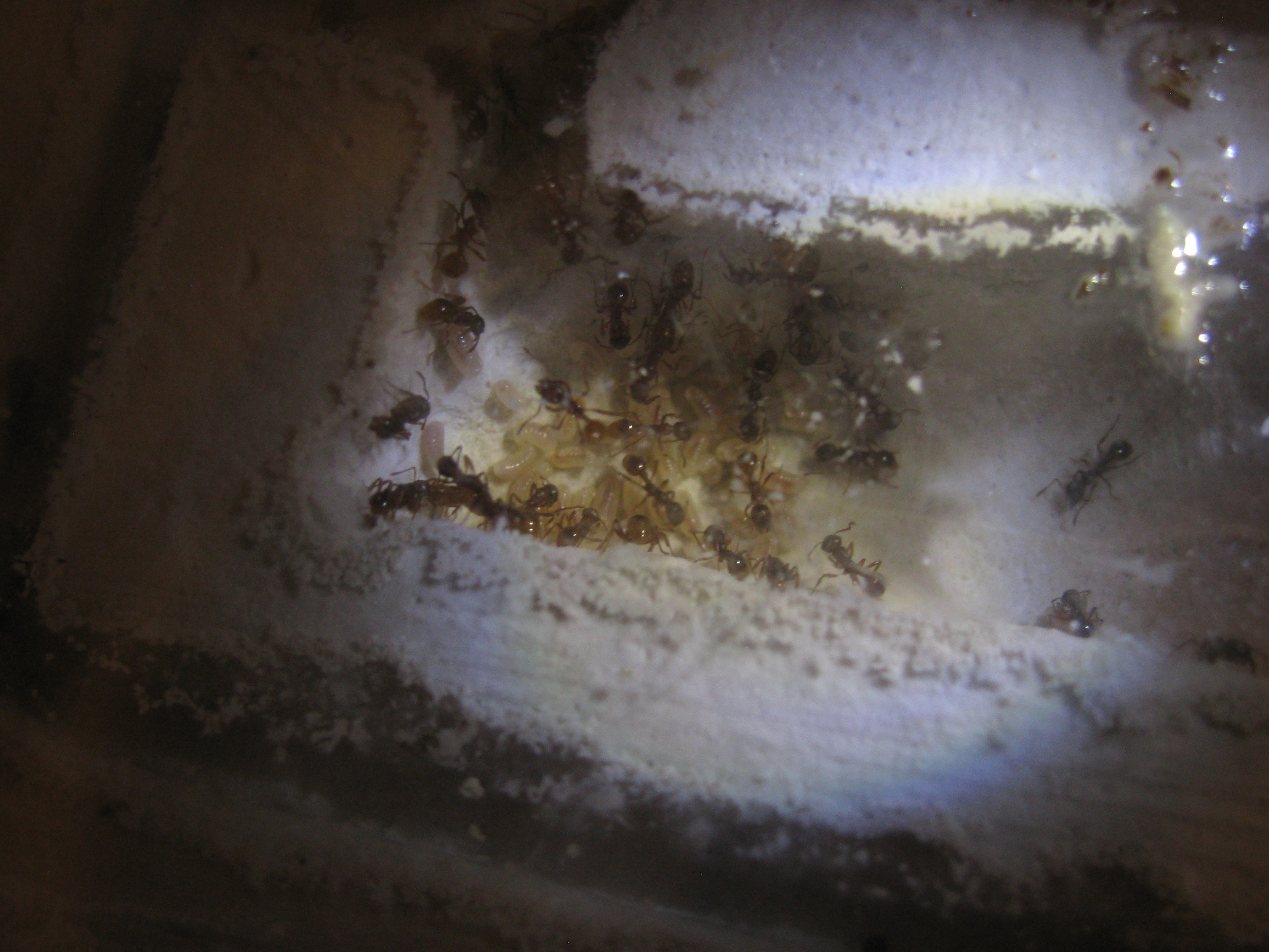 Aktuell herrschen im Nest und der Arena 19-23°C und erhöhe Luftfeuchte, da das Gipsnest feucht ist. Die beiden Falltränken enthalten Zuckerwasser (links) und Wasser (rechts).