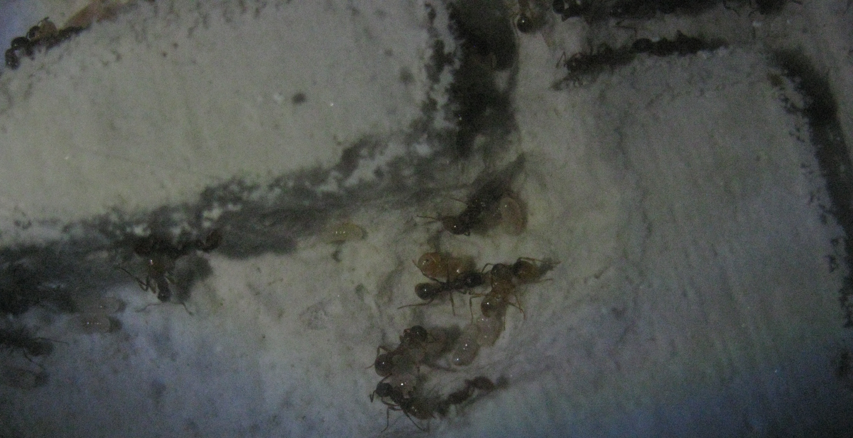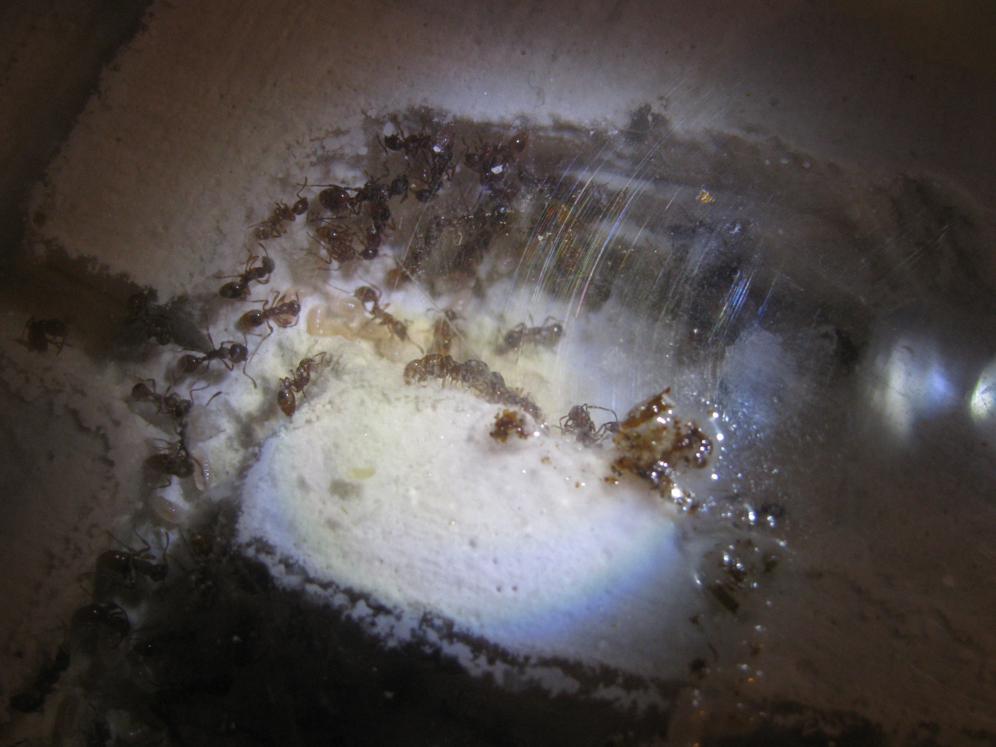 Nachdem ich die Tiere in ihr Becken gelegt habe und den Stahlwollebausch entfernt habe, sind die Tiere rausgeströmt. Die toten Arbeiterinnen wurden in der Arena verteilt die ich dann mit einer Pinzette rausgesammelt habe.