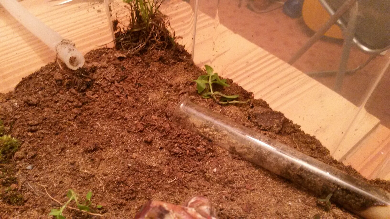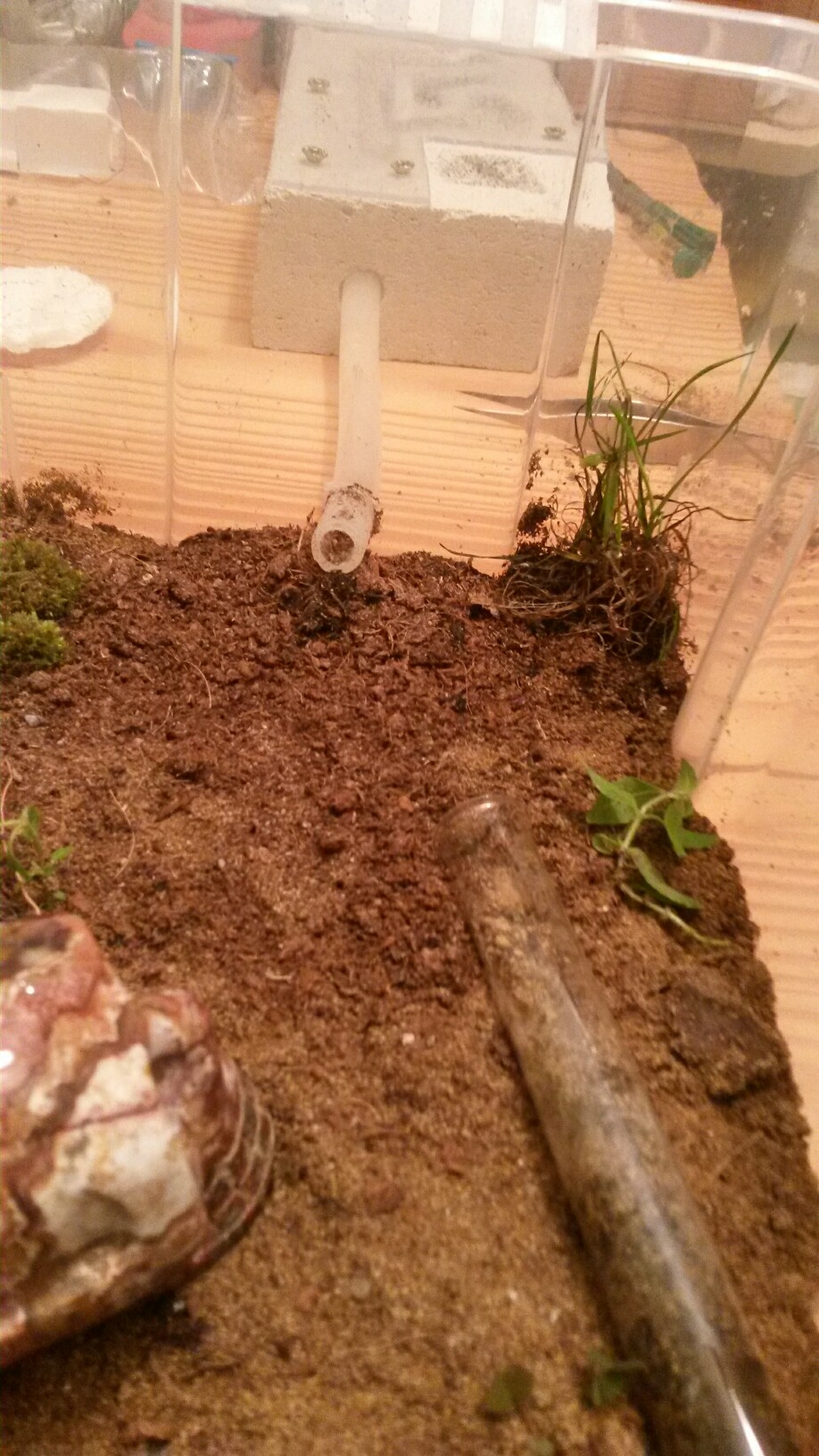 . Sie haben das Reagenzglas eigens abgedunkelt indem sie Dreck an die Wand geklebt haben. Aber ich sah durch das es ihnen gut geht. Da das Reagenzglas Mittlerweile sehr voll ist und ich auch fast nichts mehr sehe werde ich ihnen Heute ein Ytong Nest bauen und es morgen anbieten. Geplant ist ein ganz einfaches Nest mit ungefĂ€hr 2-3 Kammern. Da sie sehr gerne Insekten mögen werde ich groĂe GĂ€nge bauen damit sie diese auch einfach Transportieren können. AuĂerdem muss ich eine gute BewĂ€sserung bauen da sie es ja sehr gerne feucht mögen. Einen Stand der Kolonie kann ich nicht sagen, da ich nur einzelne Arbeiterinnen sehe. GefĂŒttert wird 2 mal in der Woche mit 2 Fliegen oder 2 MehlwĂŒrmern. Zuckerwasser wird immer noch mit